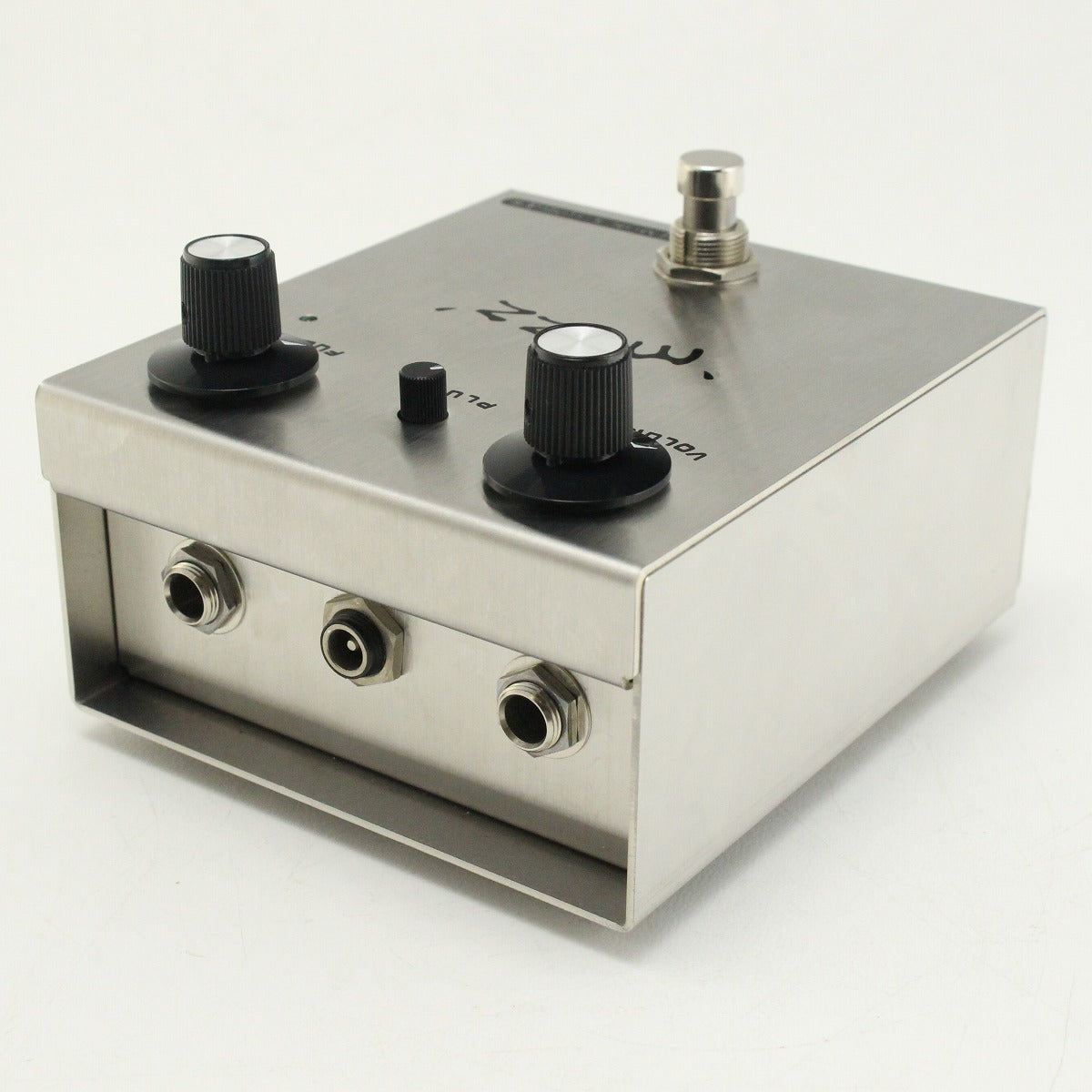 通常のFuzz Face回路ではボリューム部分が音量の調整だけでなく、フィルター回路も形成してしまうため、ボリュームを下げて使用した時にペダルのトーンに悪影響を与えてしまいます。今回、歪み発生回路とボリューム回路の間にバッファ回路を挟むことでボリュームを下げた状態でも高域を保つことが可能となりました。また直流部分の抵抗に金属皮膜抵抗を使用することで安定したペダルのトーンを実現することが可能となりました。