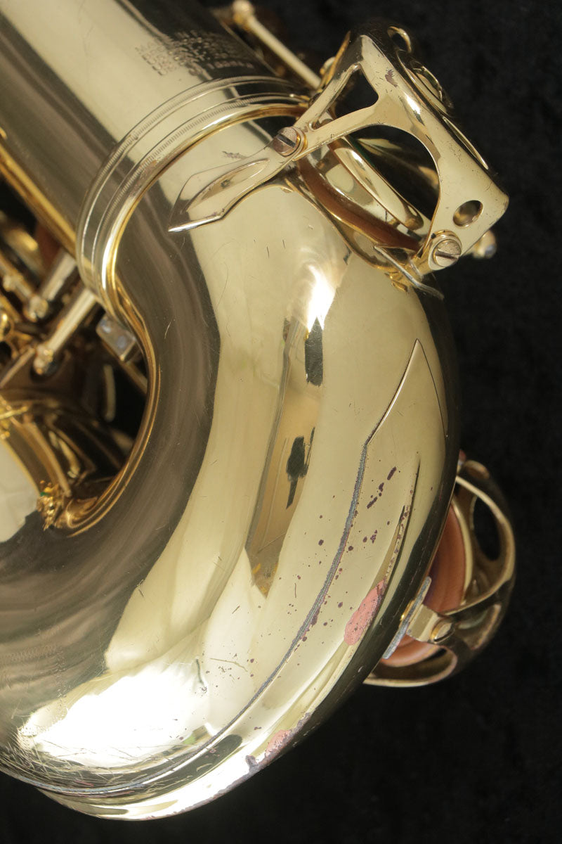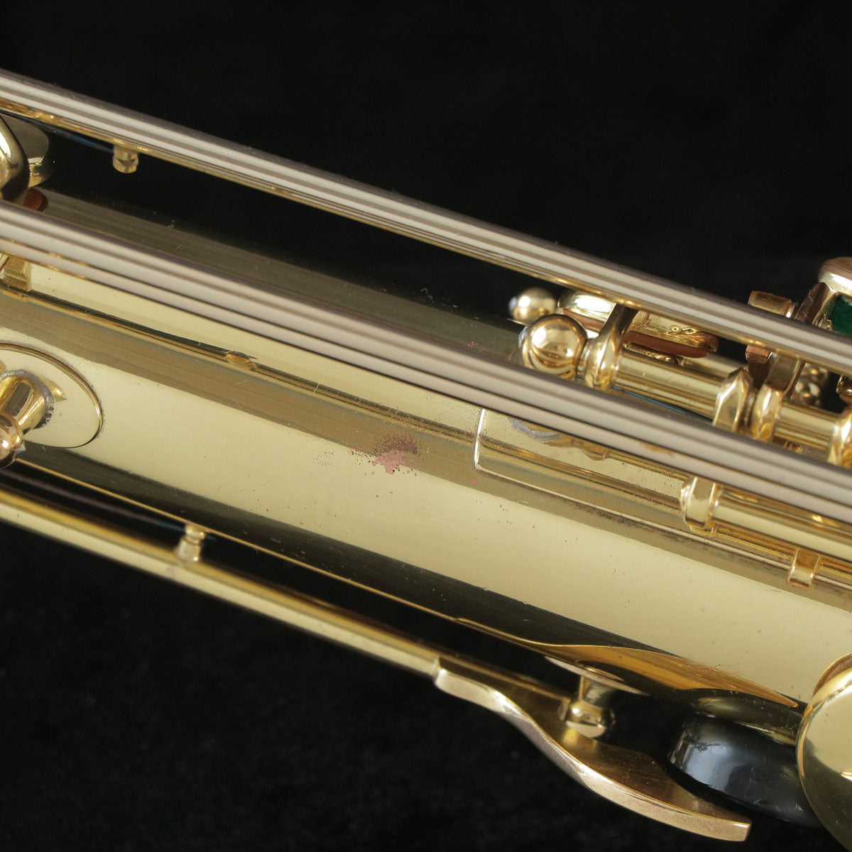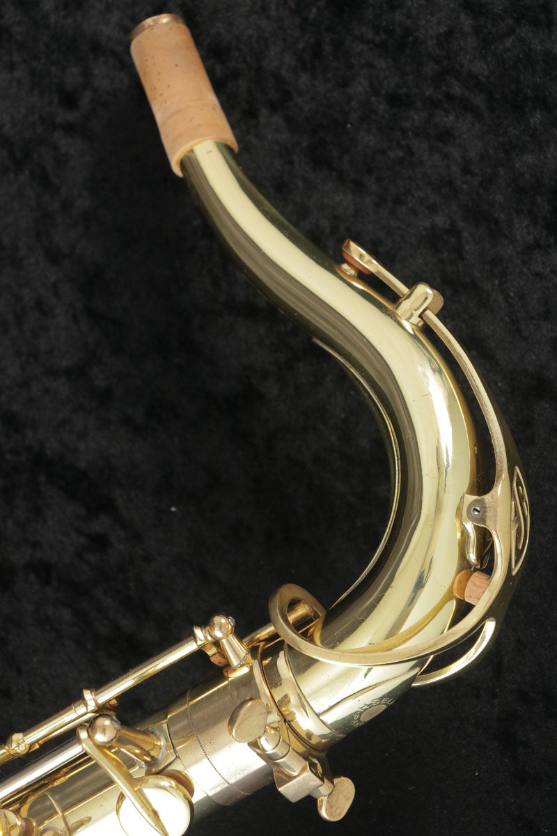 This is a Selmer Mark 6, manufactured around 1969. This is a re-lacquered piece, but the finish is good and the engravings are still there. It has an all-round impression that is typical of the middle period, and is easy to handle for those who play various genres of music. The neck is slightly pulled down after repairing a dent, but there is no problem in playing. It is a fun instrument to grow up with. The tampo has been replaced and adjusted.
