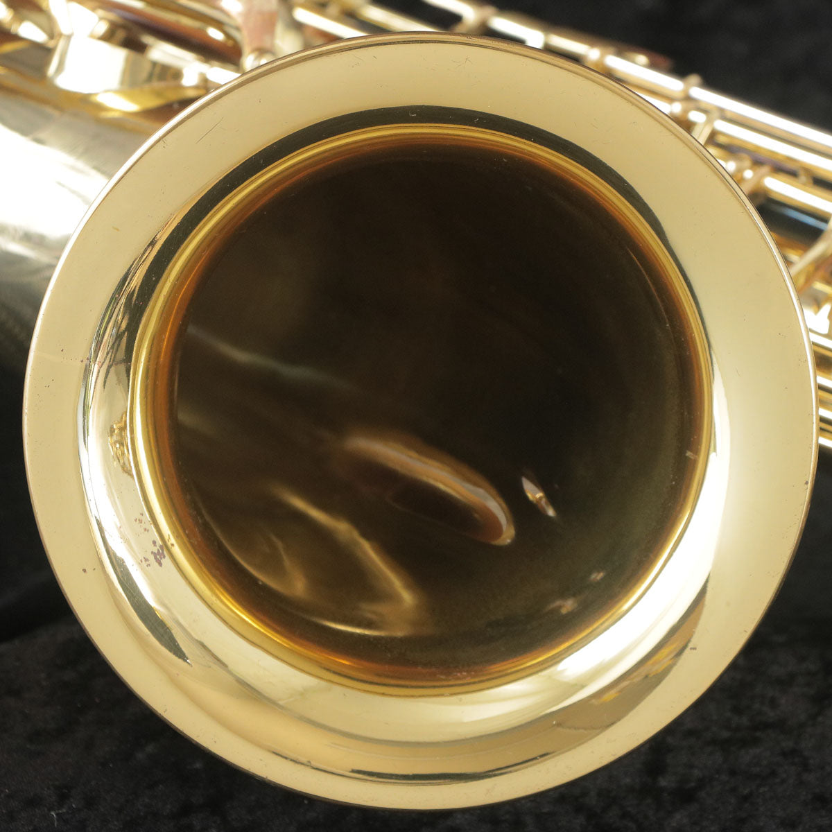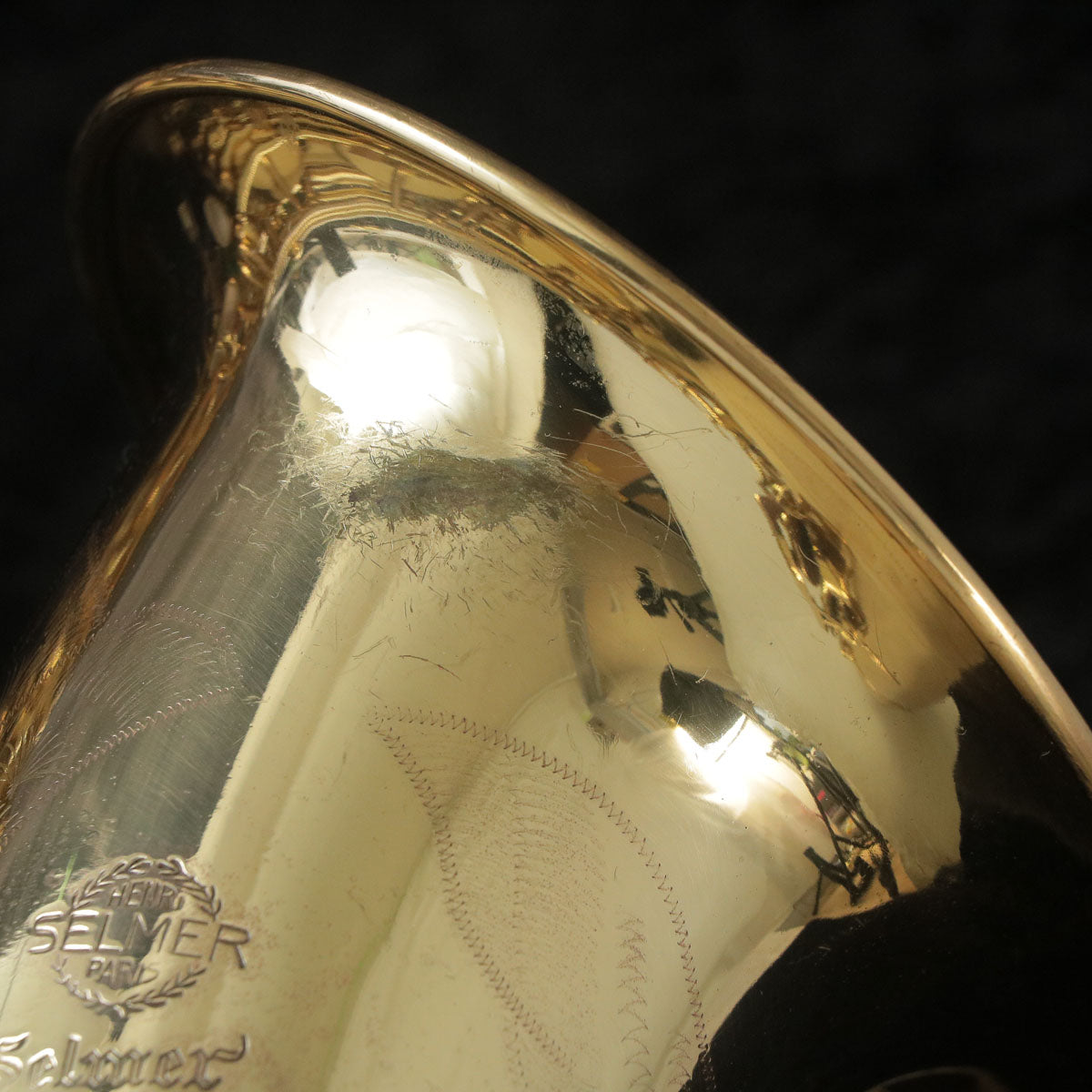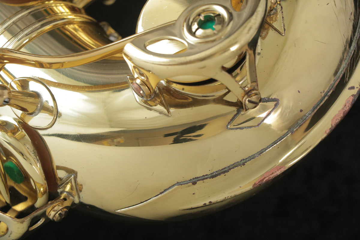 This is a Selmer Mark 6, manufactured around 1969. This is a re-lacquered piece, but the finish is good and the engravings are still there. It has an all-round impression that is typical of the middle period, and is easy to handle for those who play various genres of music. The neck is slightly pulled down after repairing a dent, but there is no problem in playing. It is a fun instrument to grow up with. The tampo has been replaced and adjusted.