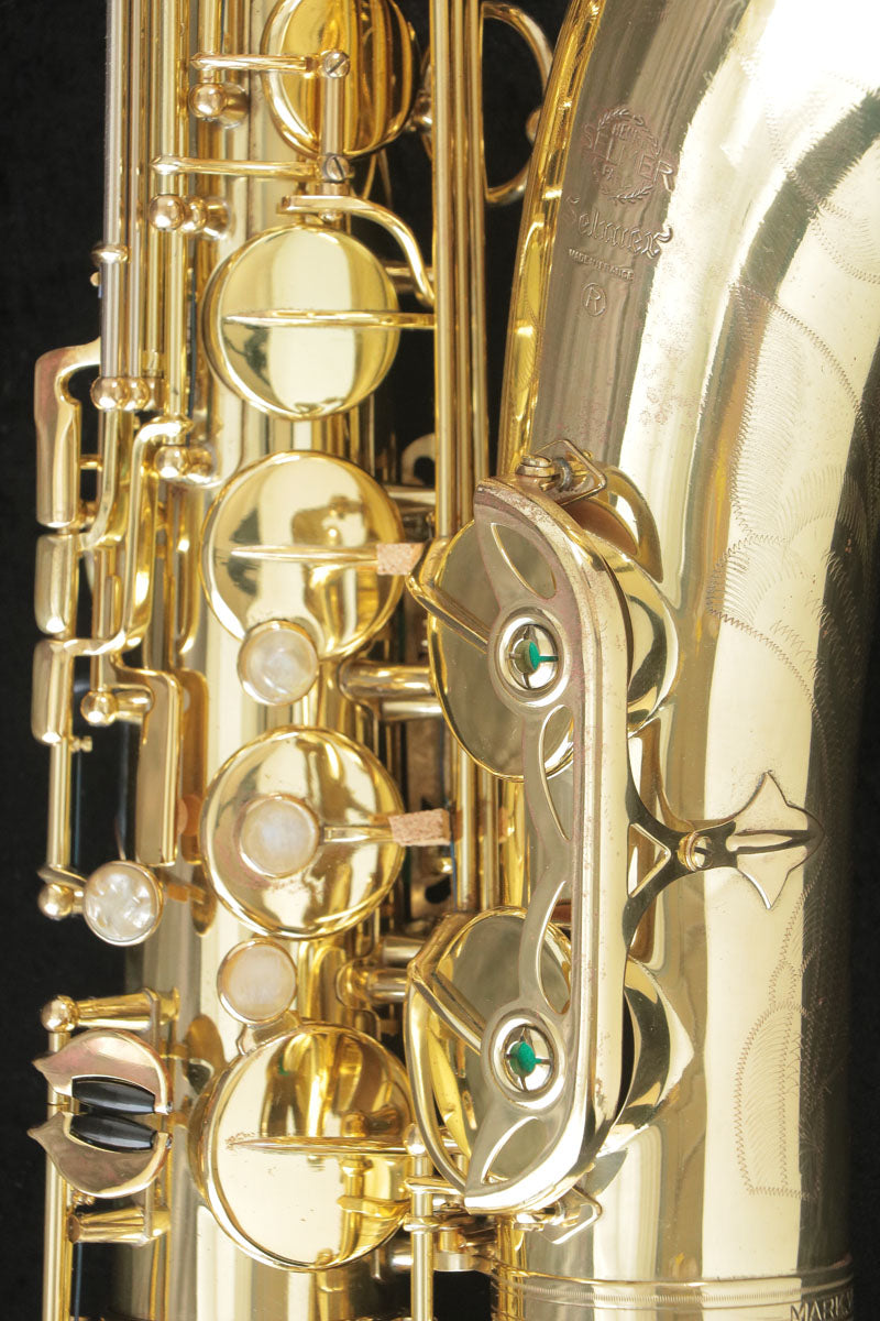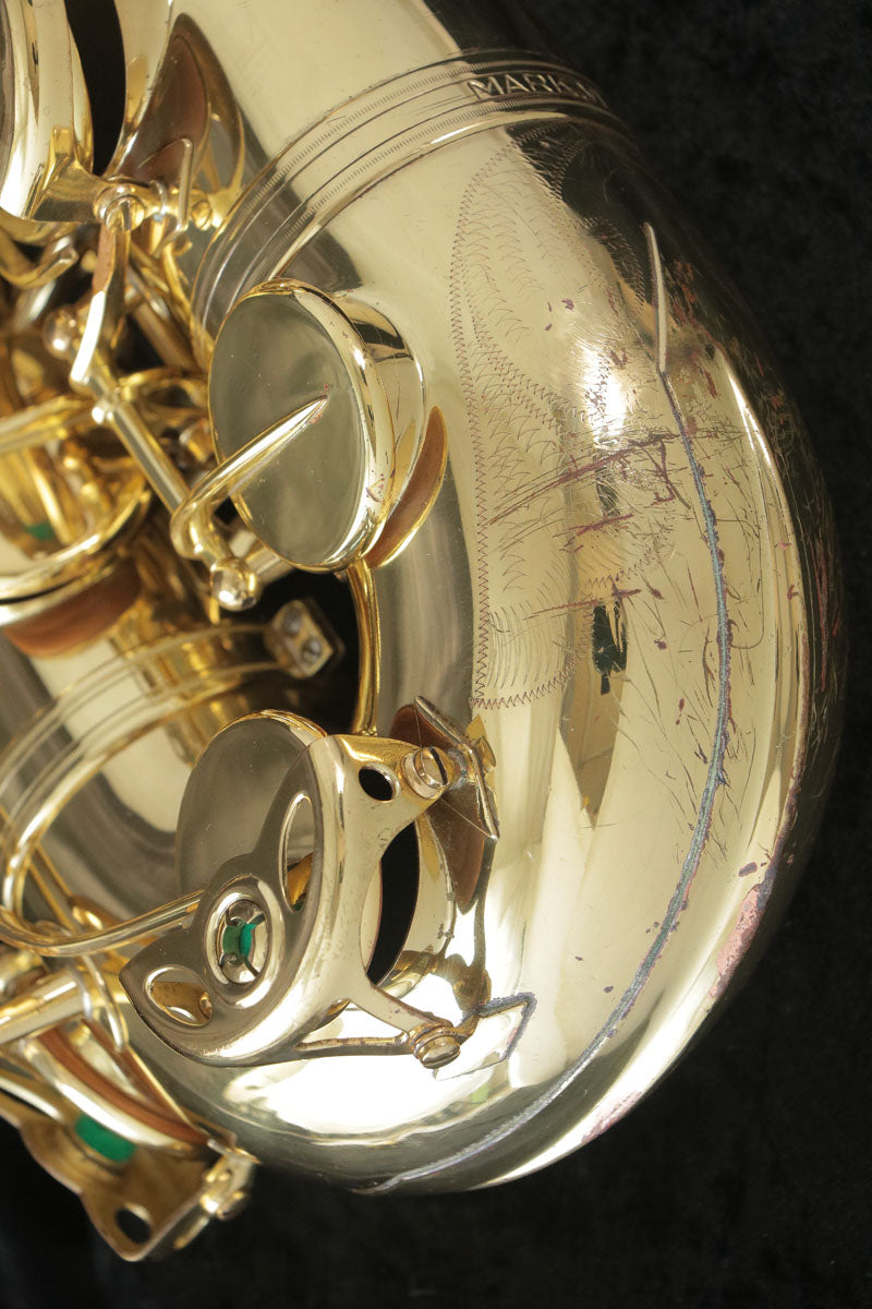 セルマーMark6です。1969年頃製造の製造になります。こちらはリラッカーさせている個体ですが、仕上げも良く、彫刻も残っております。中期らしいオールラウンドな印象で様々なジャンルを演奏される方にも扱いやすいと思います。凹み修正後や若干ネックがプルダウンしておりますが演奏に問題ございません。これから育てるにも楽しい個体だと思います。こちらは不良タンポ交換調整済みです。