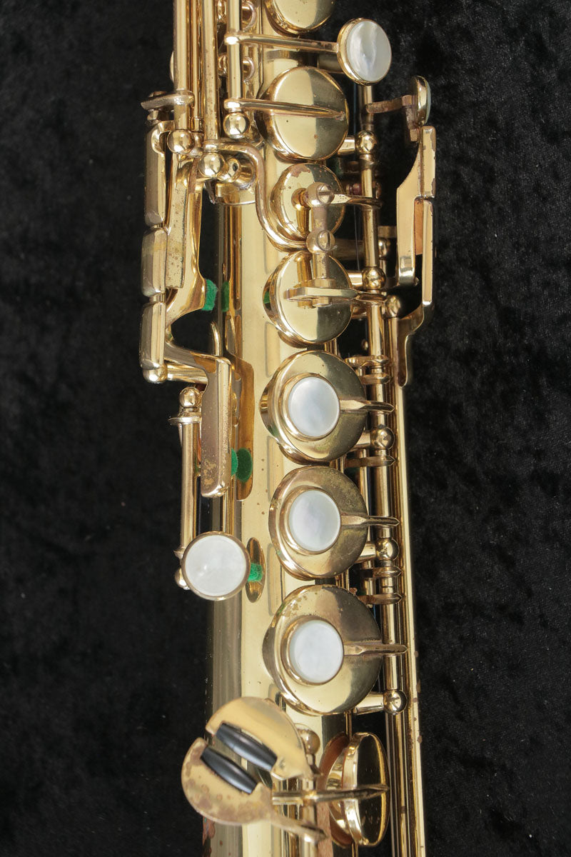 This is a Selmer soprano Mark 6. This one was manufactured around 1980. It is a late model soprano M6, and you can enjoy its natural pitch, lightness, and floating sound. The tone and atmosphere that only a soprano mark 6 can produce has captivated many players. You can fully enjoy the charm of the soprano range. All tampos have been replaced and adjusted.