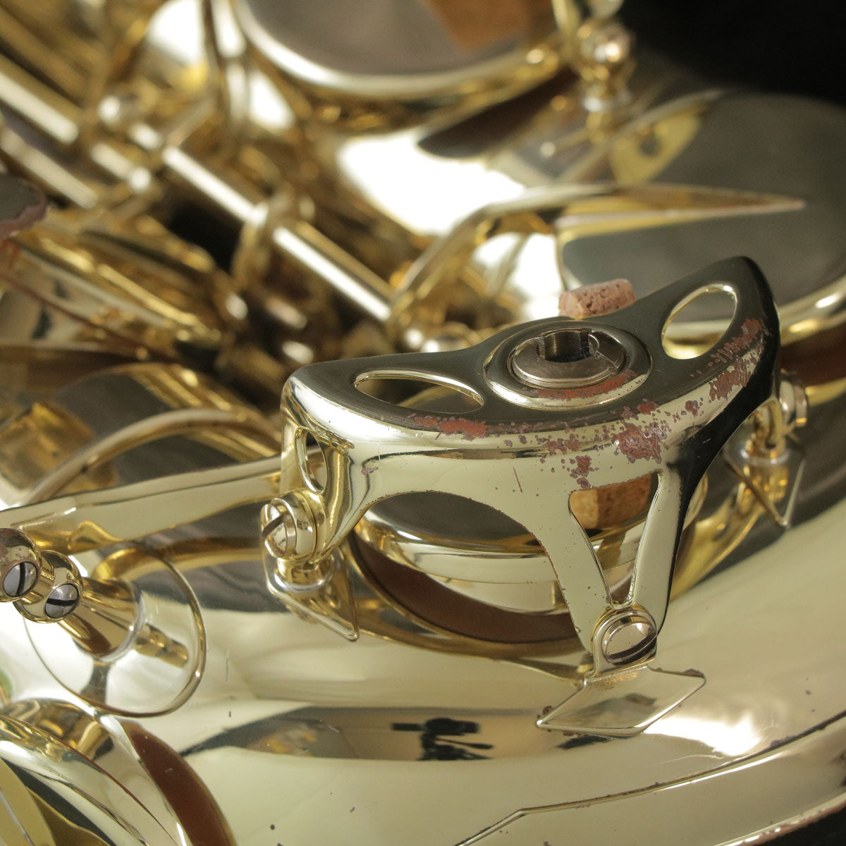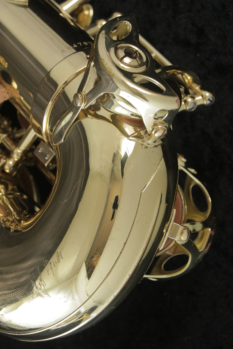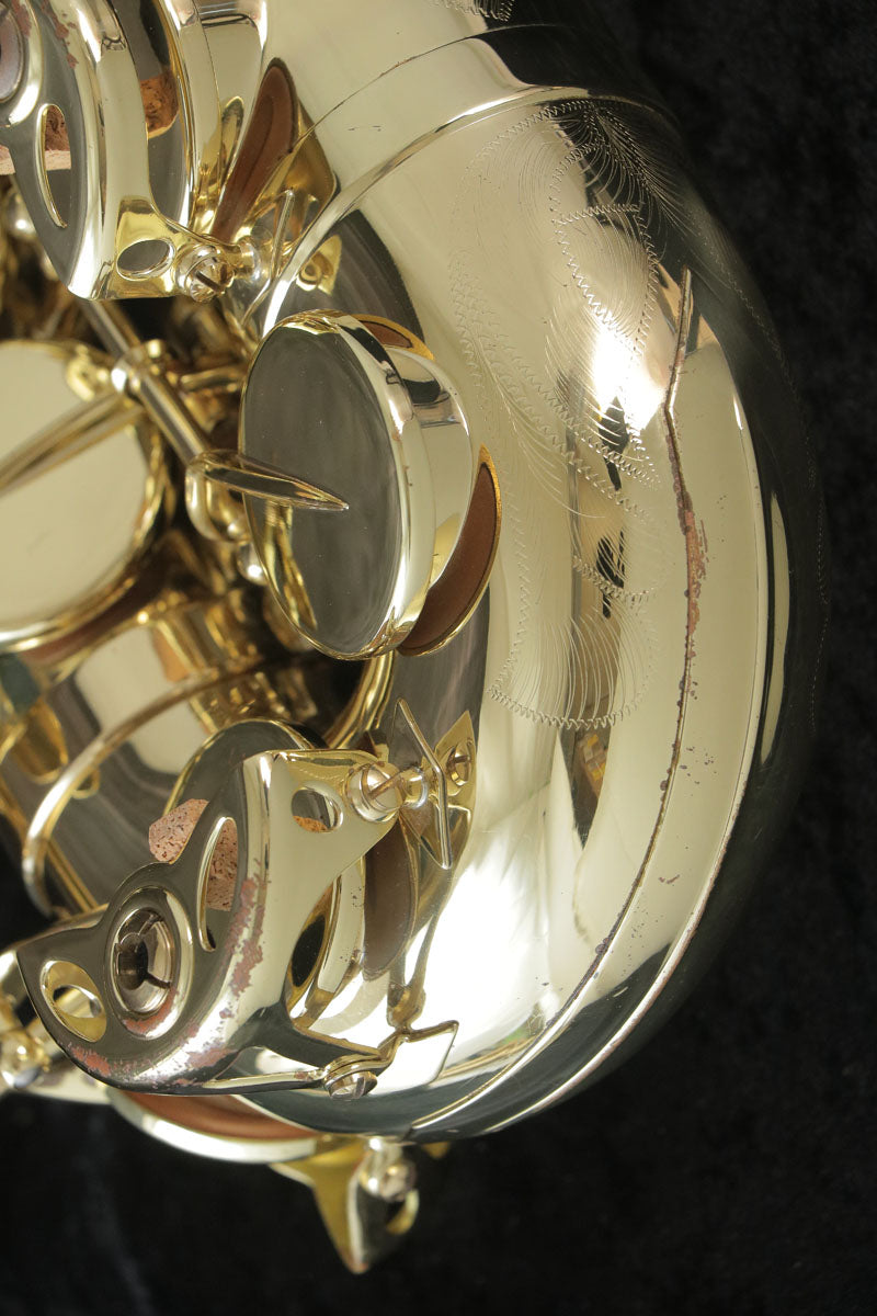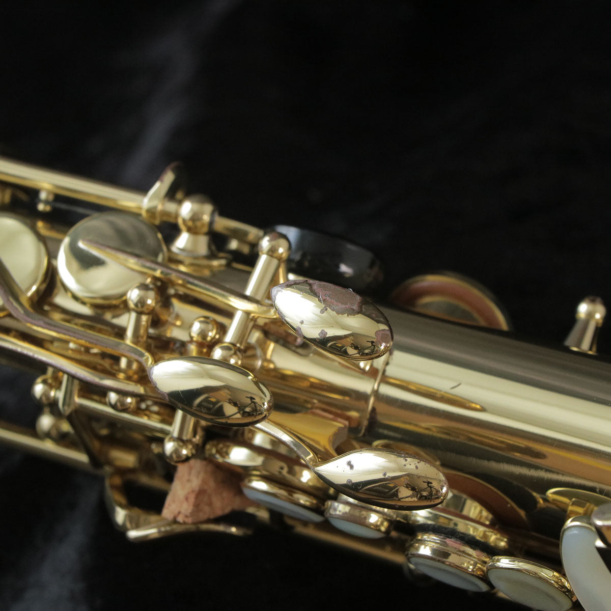ベルフレアとネックの凹み修正を行っており、モヤモヤとした修正跡や凹凸が残っています。その他通常使用に伴う傷やラッカー剥がれ、変色、錆などの使用感が点在している実用的なコンディションの楽器です。こちらは傷みの見られたタンポ2ヶ所を新品交換し、きっちり調整を行っておりますのですぐに演奏をお楽しみいただけます。