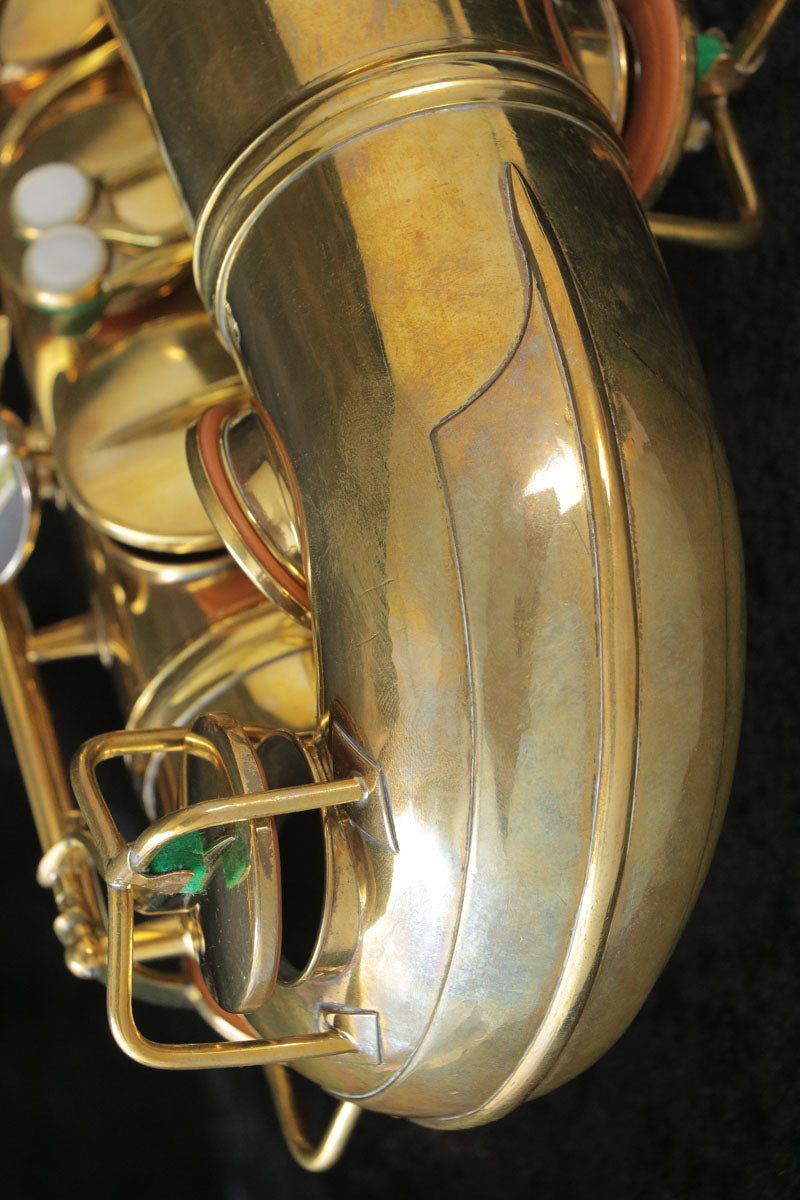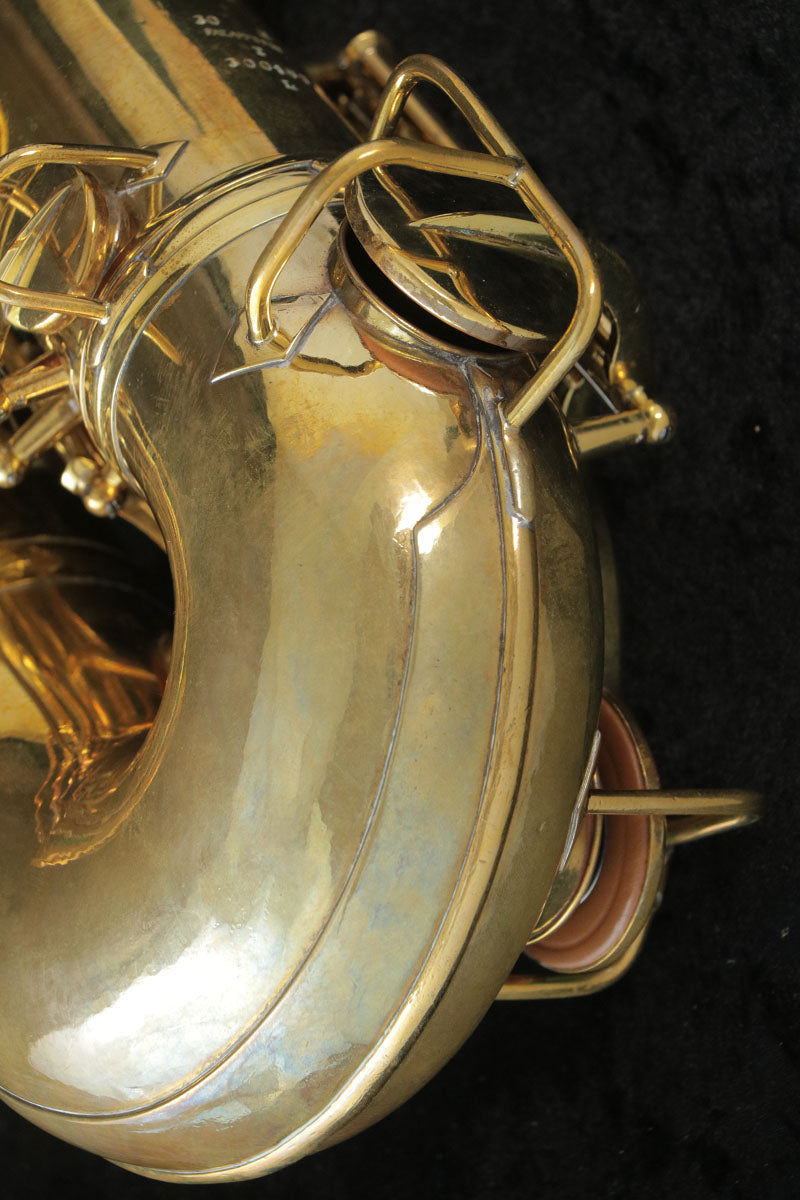 コーンテナーサックス30Mです。1941年頃製造の個体になります。Connqueror 30Mとも言われ人気が高く希少なモデルになります。こちらはリラッカーされておりジョイントスクリューも交換されております。30Mらしい中低音域の魅力もあり、ジャズサックスらしいノスタルジックなサウンドが堪能できます。コーン黄金期を代表する名機です。