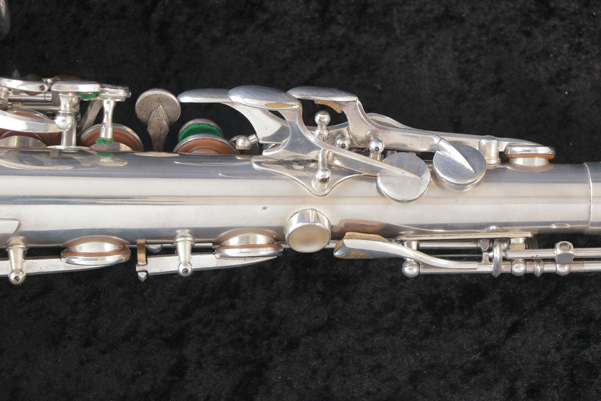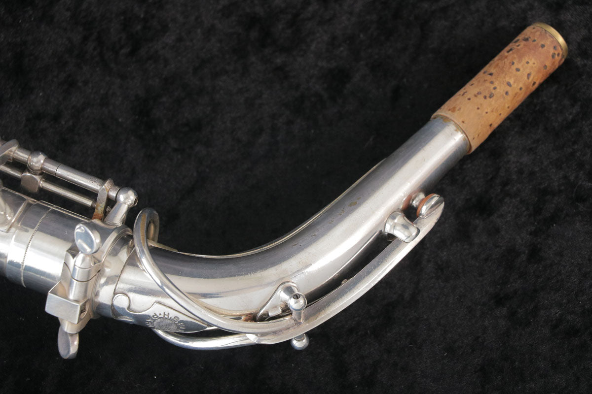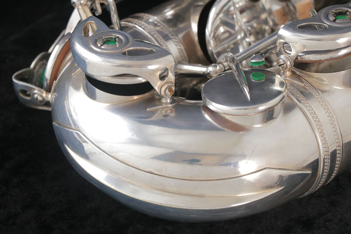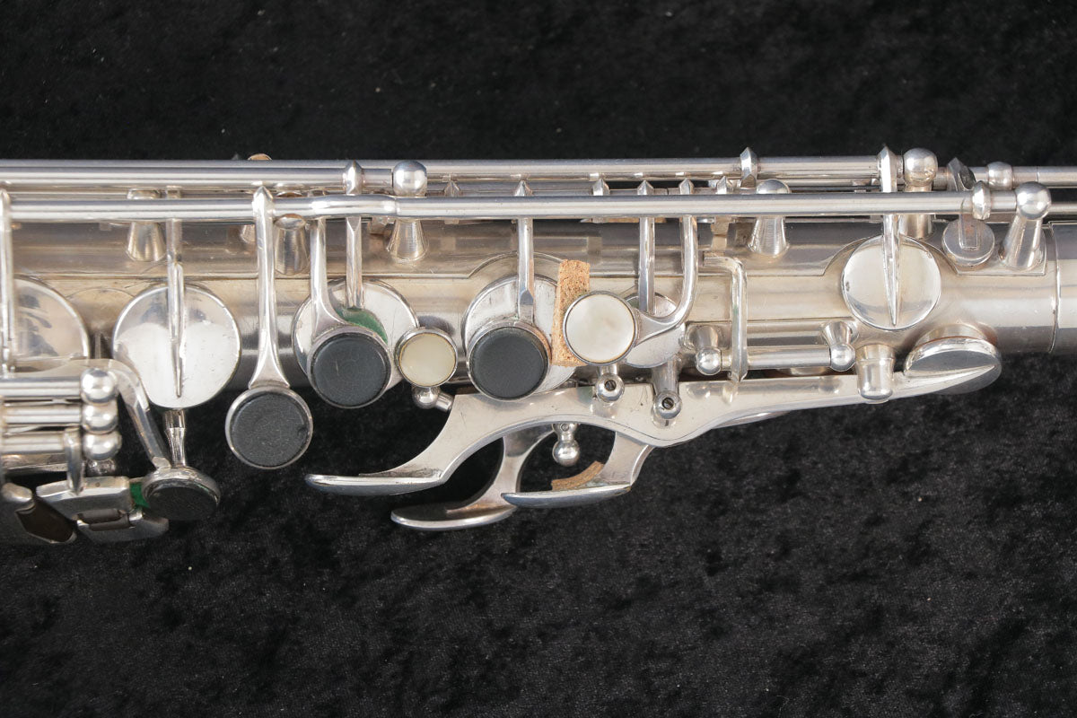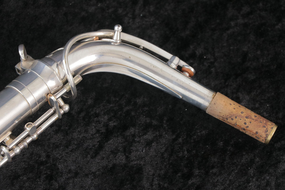 セルマーのバランスドアクションです。現代のサックスに大きな影響を与えたモデルで当時としては画期的な進化だったように思います。1943年頃製造の個体になります。U字管に修正痕、ジョイント、ライヤースクリューは交換されている可能性もございますが、全体的にメッキが残っており年代を考えるとコンディション良好です。ノスタルジックなサウンドで当時のジャズサックスといえばConnを使用していたプレイヤーが多かったそうですが脅威となるぐらい様々なプレイヤーを魅了したモデルです。こちらはタンポのコンディションも良く全体調整済みですので即戦力の1本です。