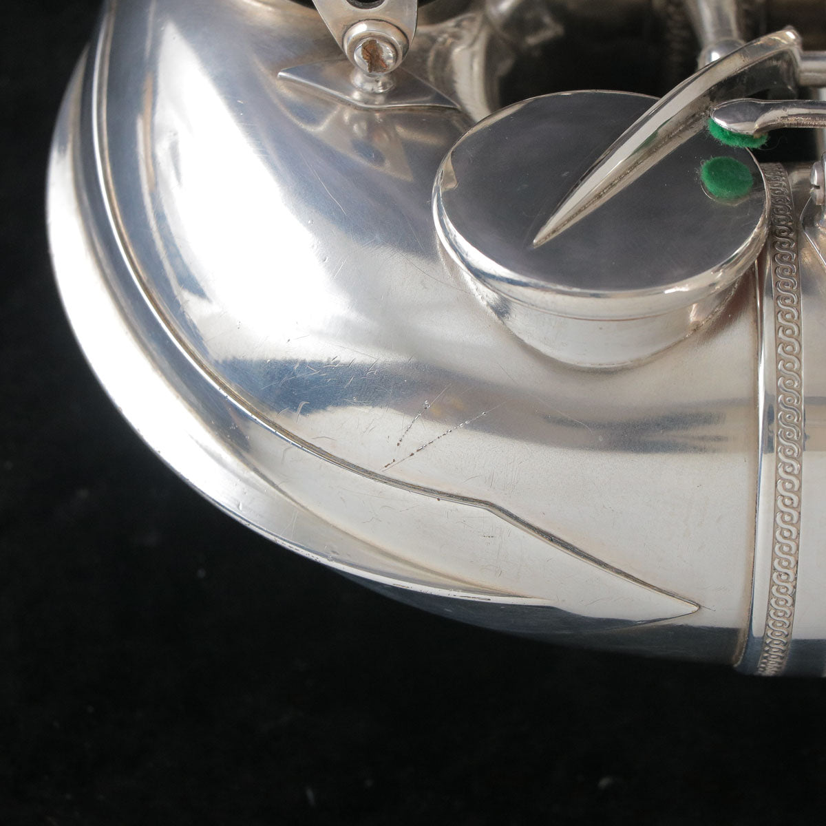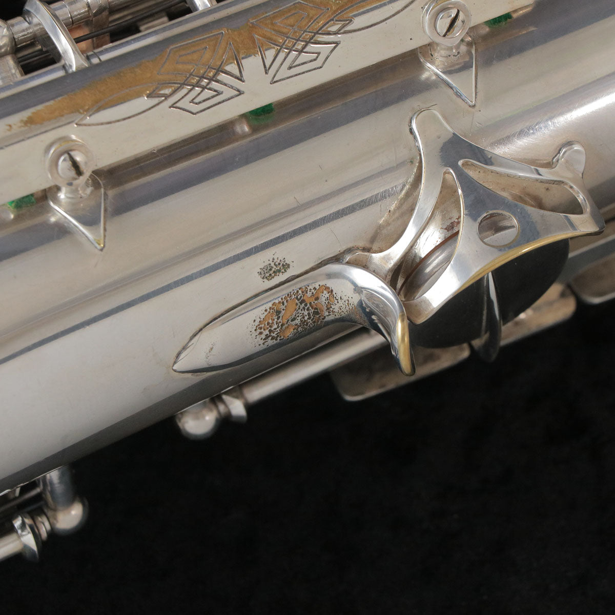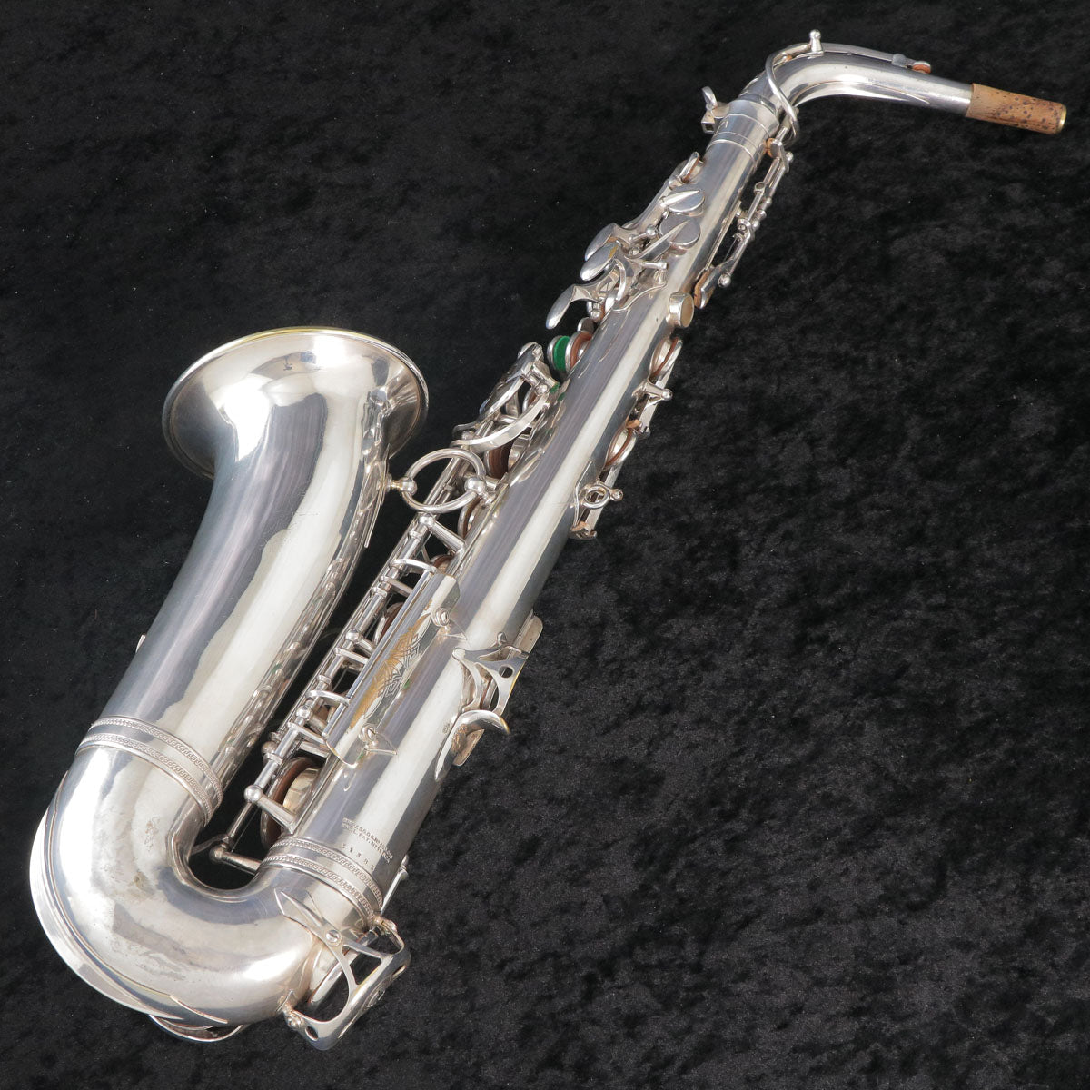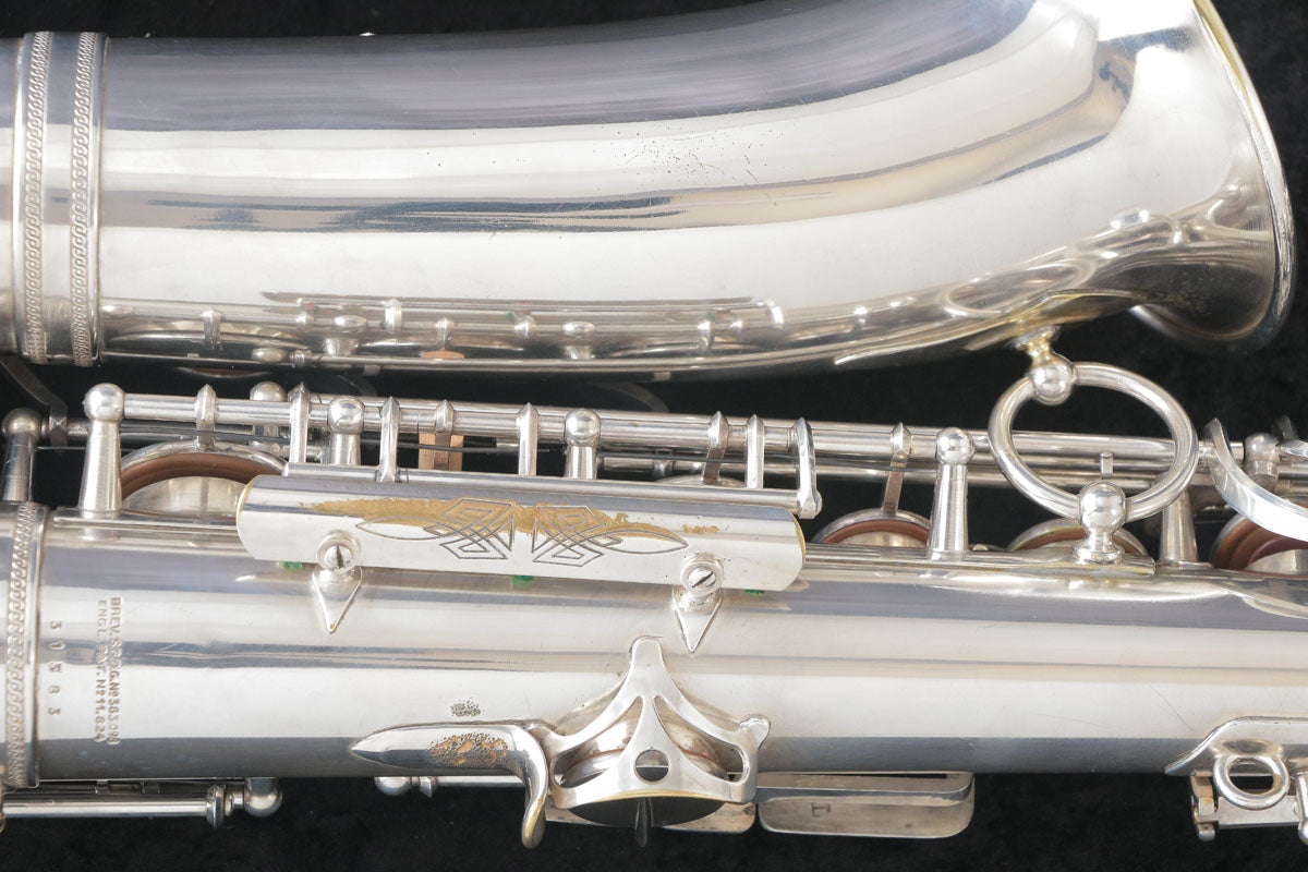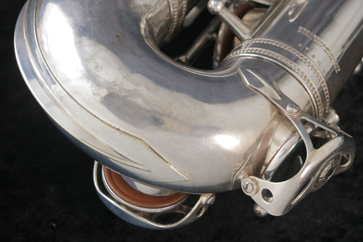 セルマーのバランスドアクションです。現代のサックスに大きな影響を与えたモデルで当時としては画期的な進化だったように思います。1943年頃製造の個体になります。U字管に修正痕、ジョイント、ライヤースクリューは交換されている可能性もございますが、全体的にメッキが残っており年代を考えるとコンディション良好です。ノスタルジックなサウンドで当時のジャズサックスといえばConnを使用していたプレイヤーが多かったそうですが脅威となるぐらい様々なプレイヤーを魅了したモデルです。こちらはタンポのコンディションも良く全体調整済みですので即戦力の1本です。