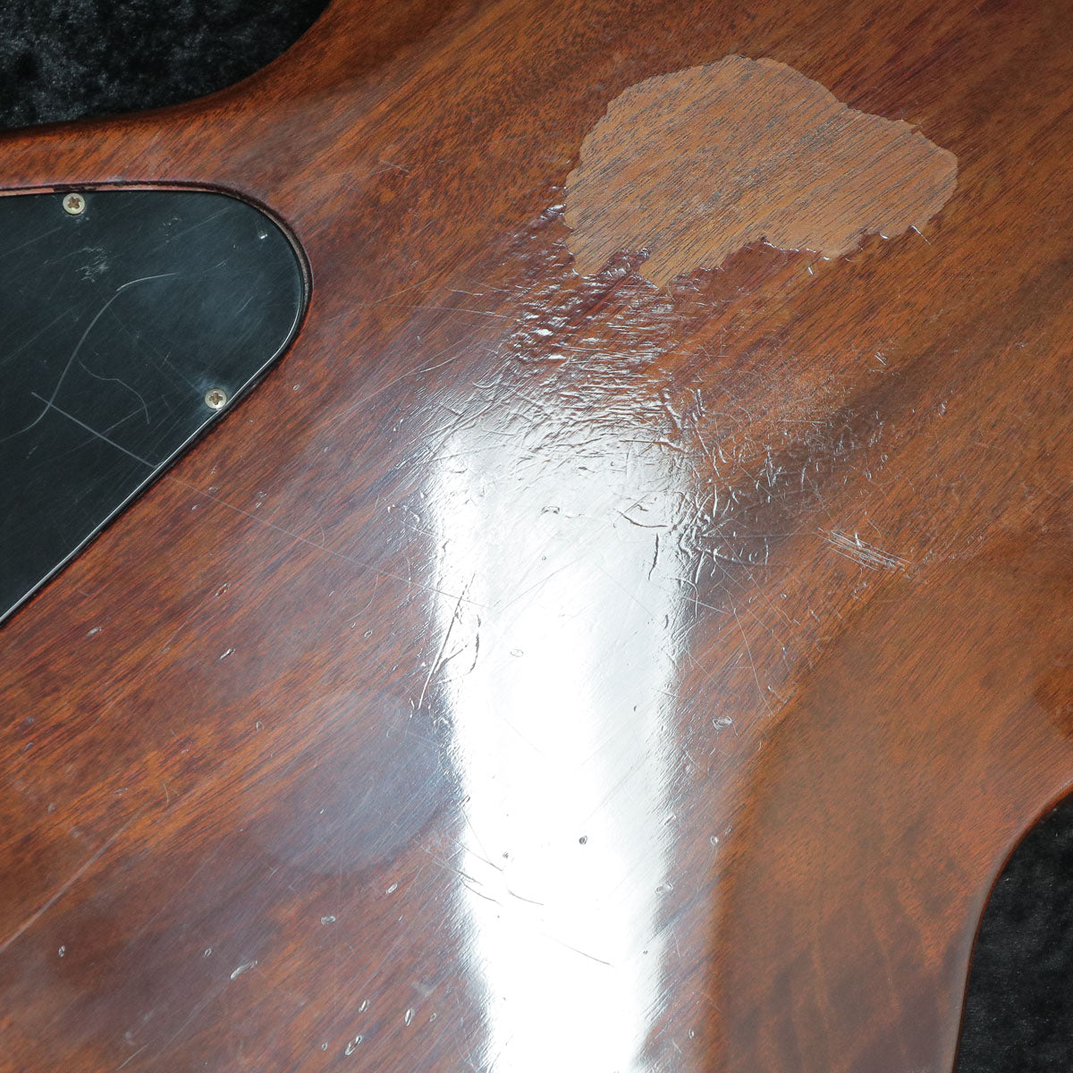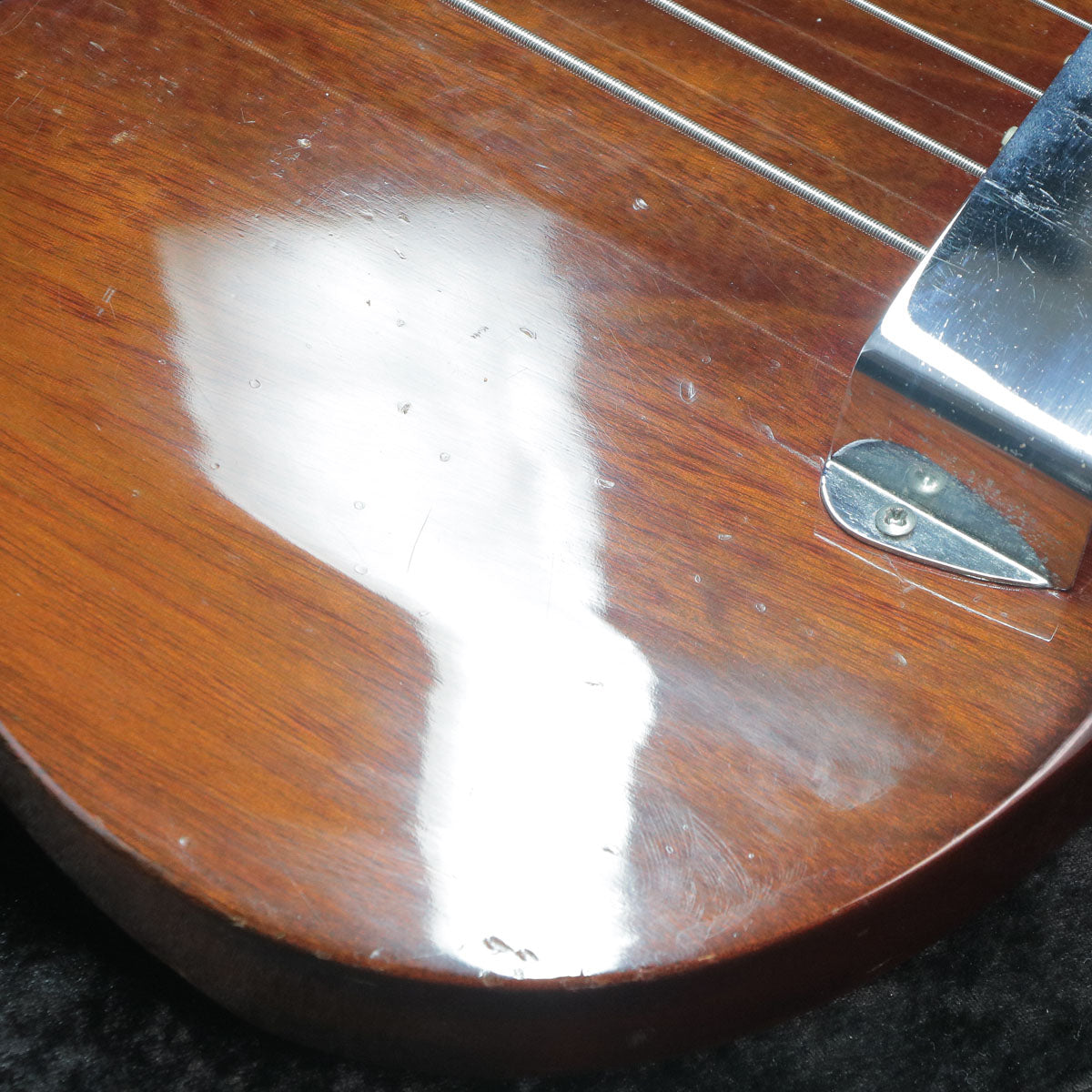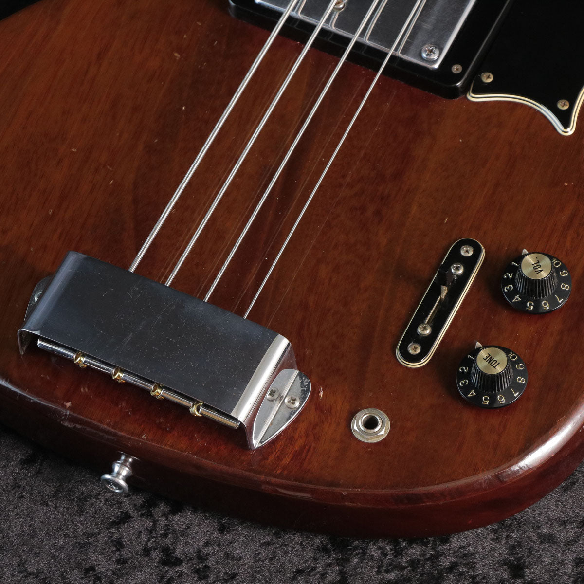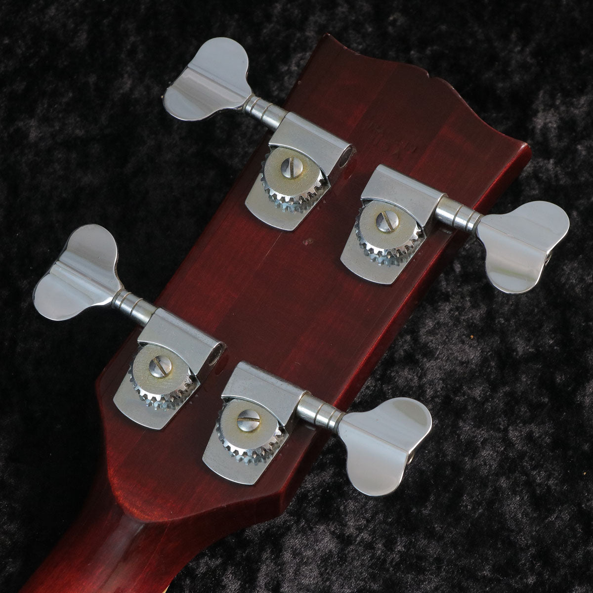 艶やかなWalnutカラーに身を包んだEB-4L。マホガニーボディに3ピースメイプルのセットネック、指板はローズウッドを採用。こちらのカラーは1973年の前半によく見られるカラーリングです。また2点方式のブリッジからも1973年前半製であることが伺えます。