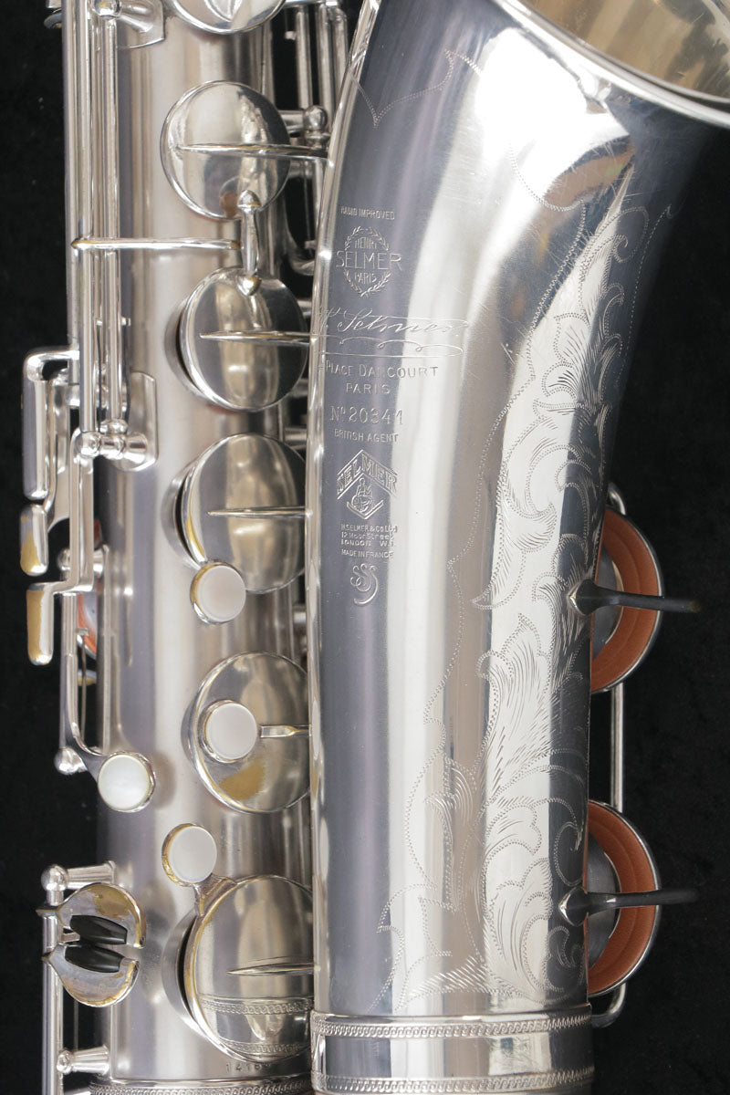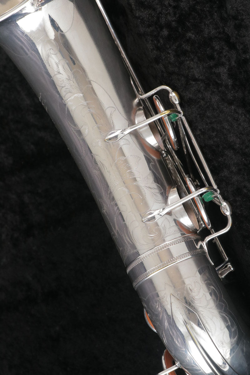 セルマーテナーサックス、レディオインプルーブドです。製造時期わずか2年ほどで残された個体も非常に少ないと思います。こちらは所謂ブリセルで1935年頃製造の個体になります。年代を考えると非常にコンディションも良く、滅多に出ないと思います。この時代のセルマーは何処となくコーンなどに代表されるような太さを感じる音色で当時の流行性かもしれません。パワーも現代で通用する適度なパワーがあり様々な場面で活躍できると思います。まさにノスタルジックなサウンドです。こちらはタンポのコンディションも良く、全体調整済みですので即戦力になる1本です。