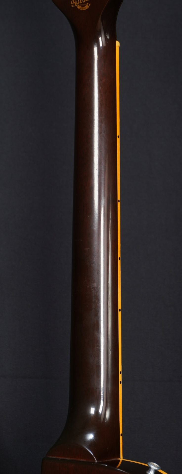 一見するとヴィンテージ・リイシューの雰囲気もありますが、ペグには「GIBSON DELUXE刻印入りのロトマチック・ペグを搭載し、ネックはディープジョイントではなく、カッタウェイ内側のバインディングも分厚い仕様になっているなど、ベースは当時のレギュラー・モデルがベースになっております。