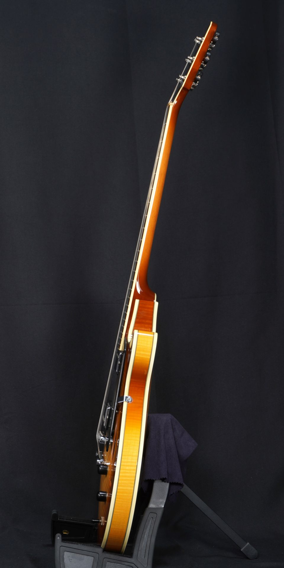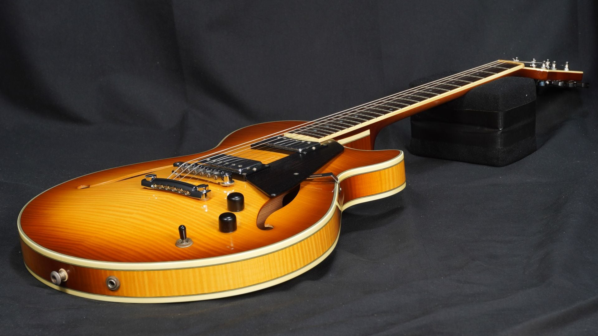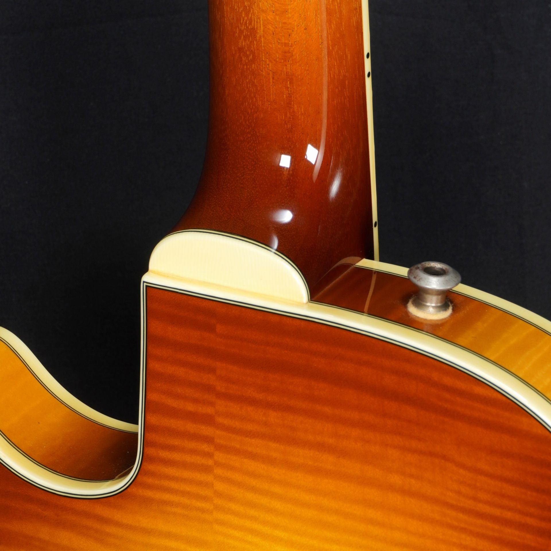 Based on the Jimmy Bruno model, the body thickness has been reduced to 1.75", the body contains a spruce center block that has been machined to reduce weight, and a deep cutaway has been added to improve playability in the high position. A deeper cutaway has been adopted to improve playability in the high position.