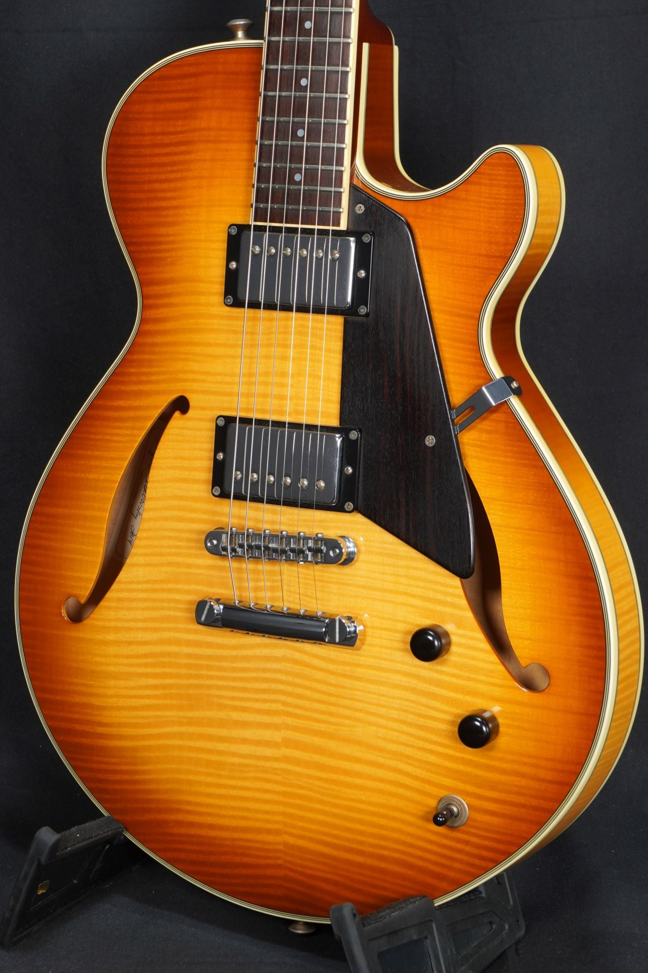 エレクトリックギターの操作性と、フィードバックから開放されたアーチトップサウンドの融合。Jimmy Bruno Model を元にボディ厚を 1.75 インチまで減らし、ボディ内部には軽量化のために削り込んだスプルースセンターブロックを収め、さらにハイポジションでの演奏性向上のために深めのカッタウェイが採用されました。