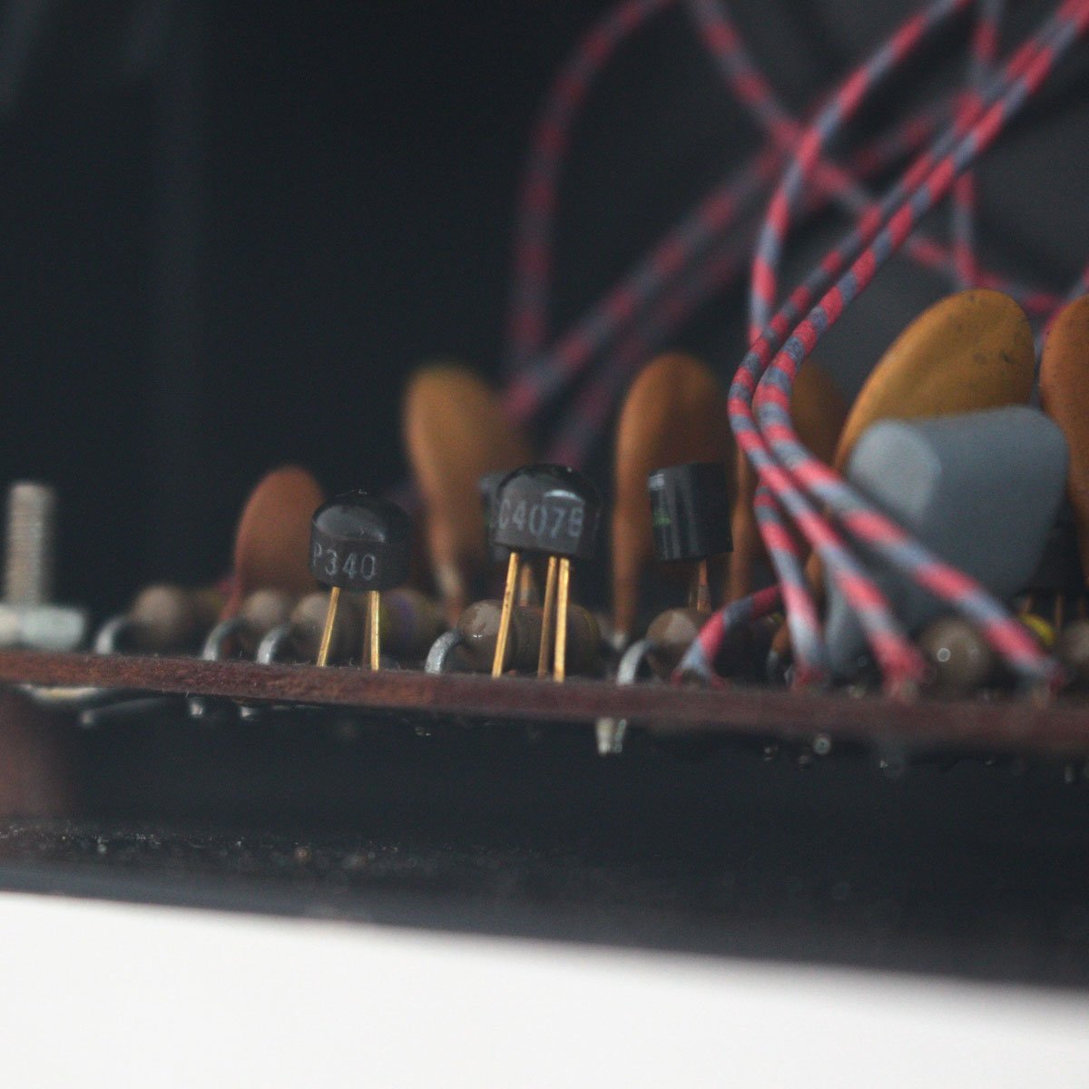 The pots are from 1973-1974, but have been modified with new internal wiring material, battery snap, DC jack, etc. The transistor is a BC407B.