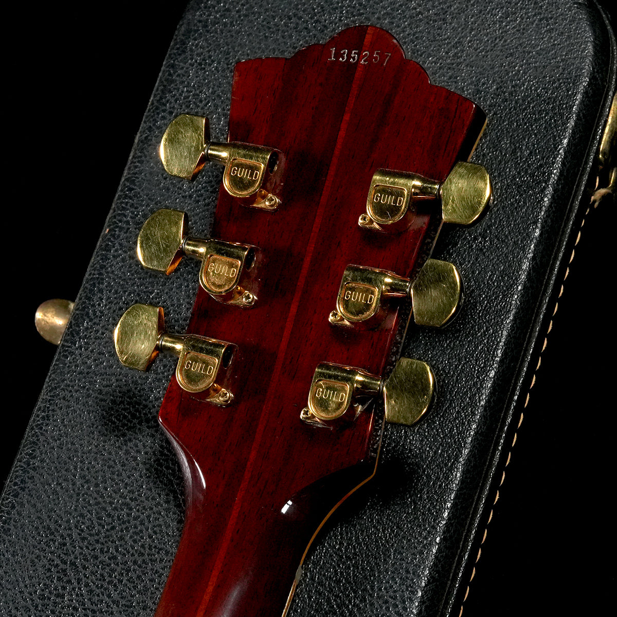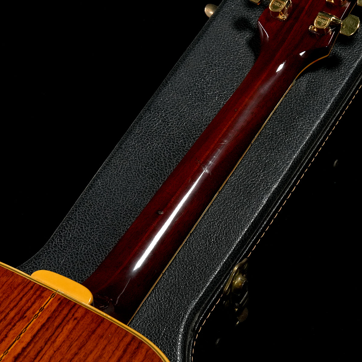 Spruce top, rosewood back and sides, mahogany neck, ebony bridge and fingerboard, GUILD engraved Schaller pegs, pearl and avalon inlays.