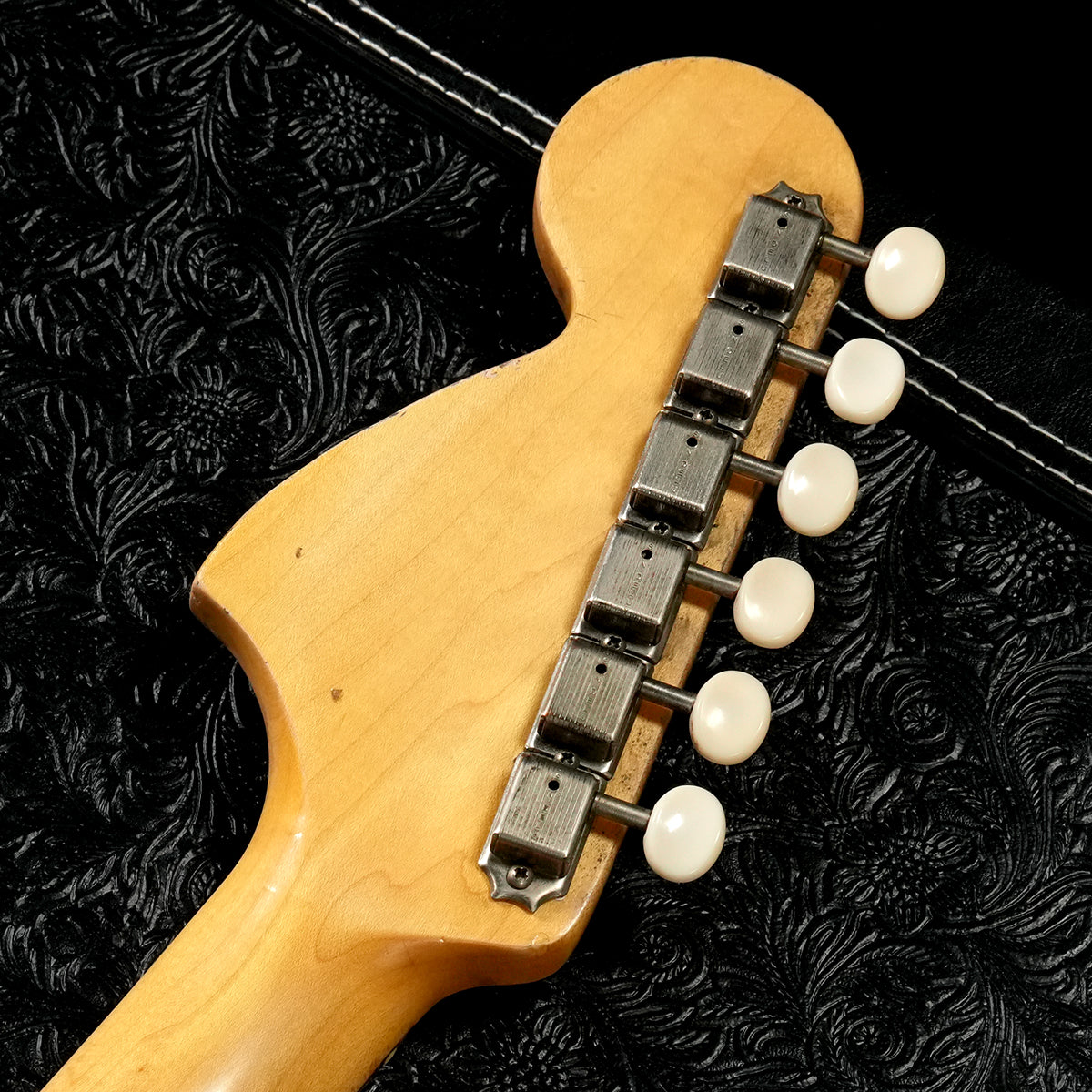 ラージヘッドに、スラブ指板、グレイボビン、パールドットとあえてビンテージとは異なる仕様を採用。全体にびっしりとウェザーチェックが入っており雰囲気は抜群です。
