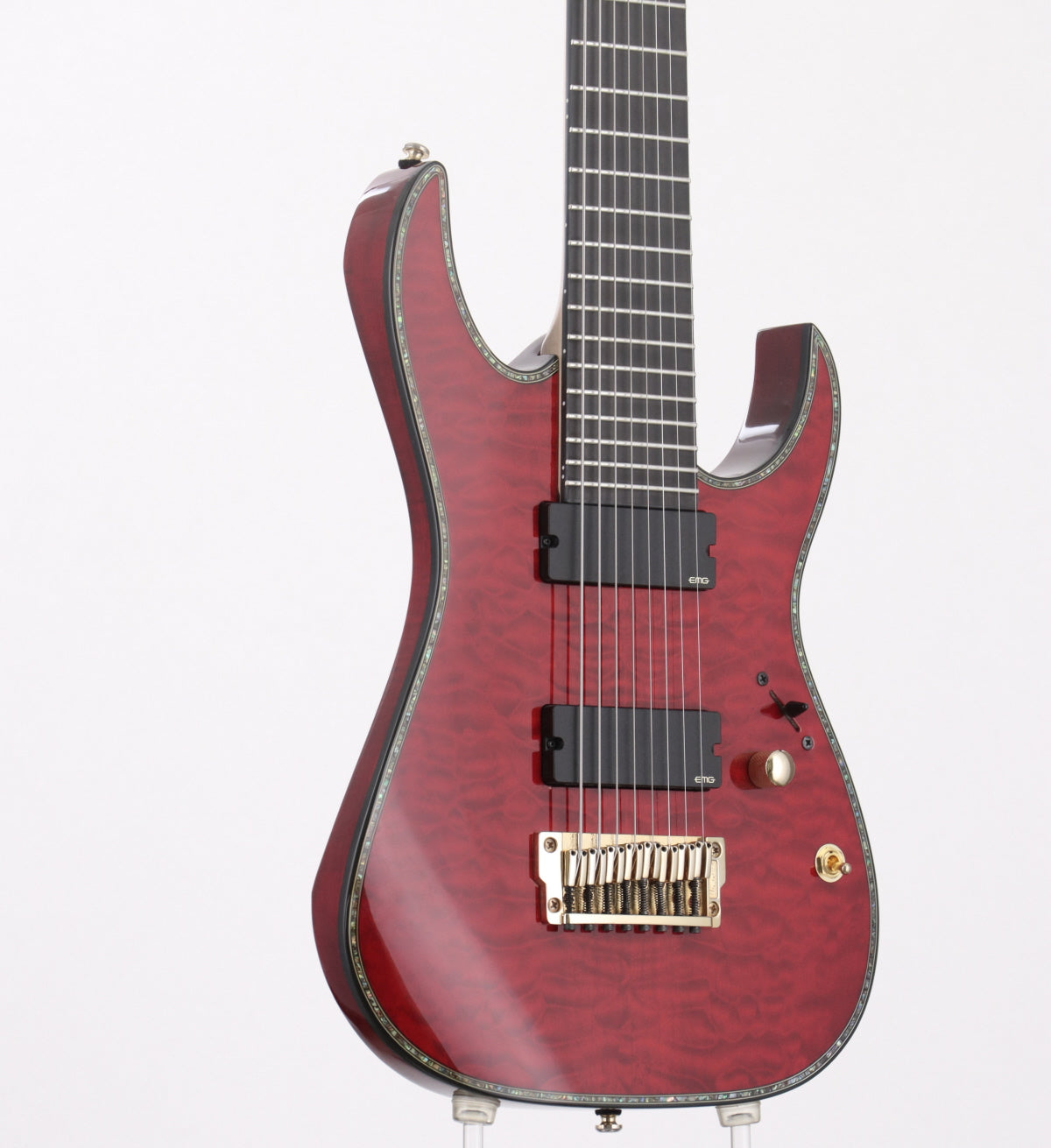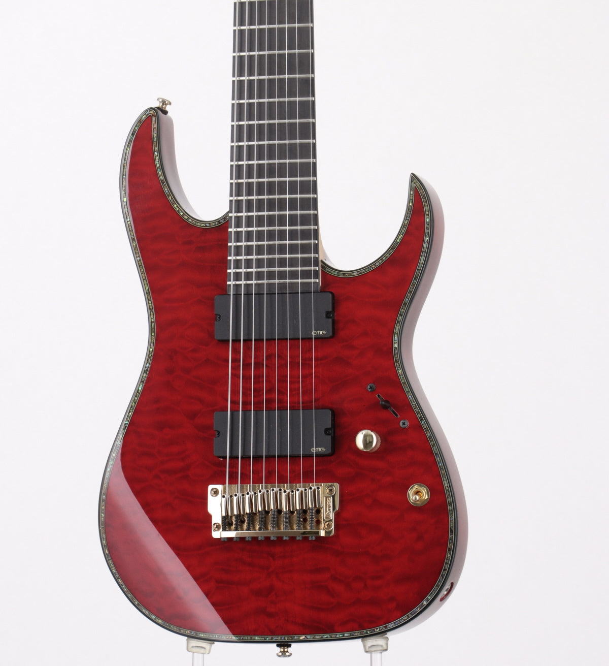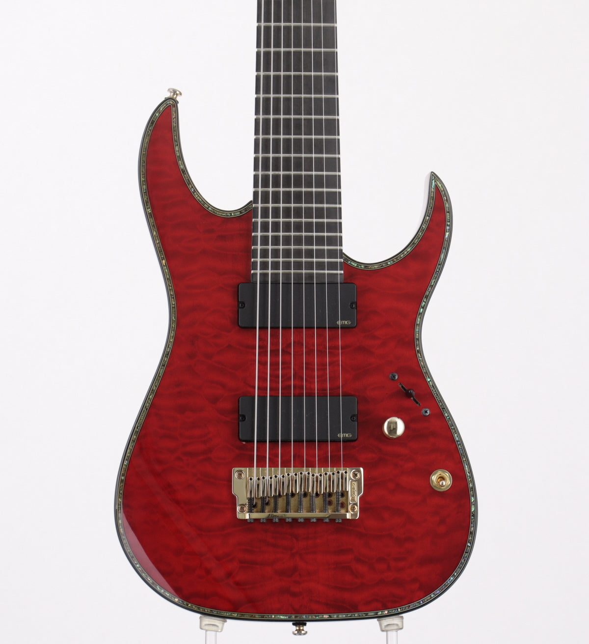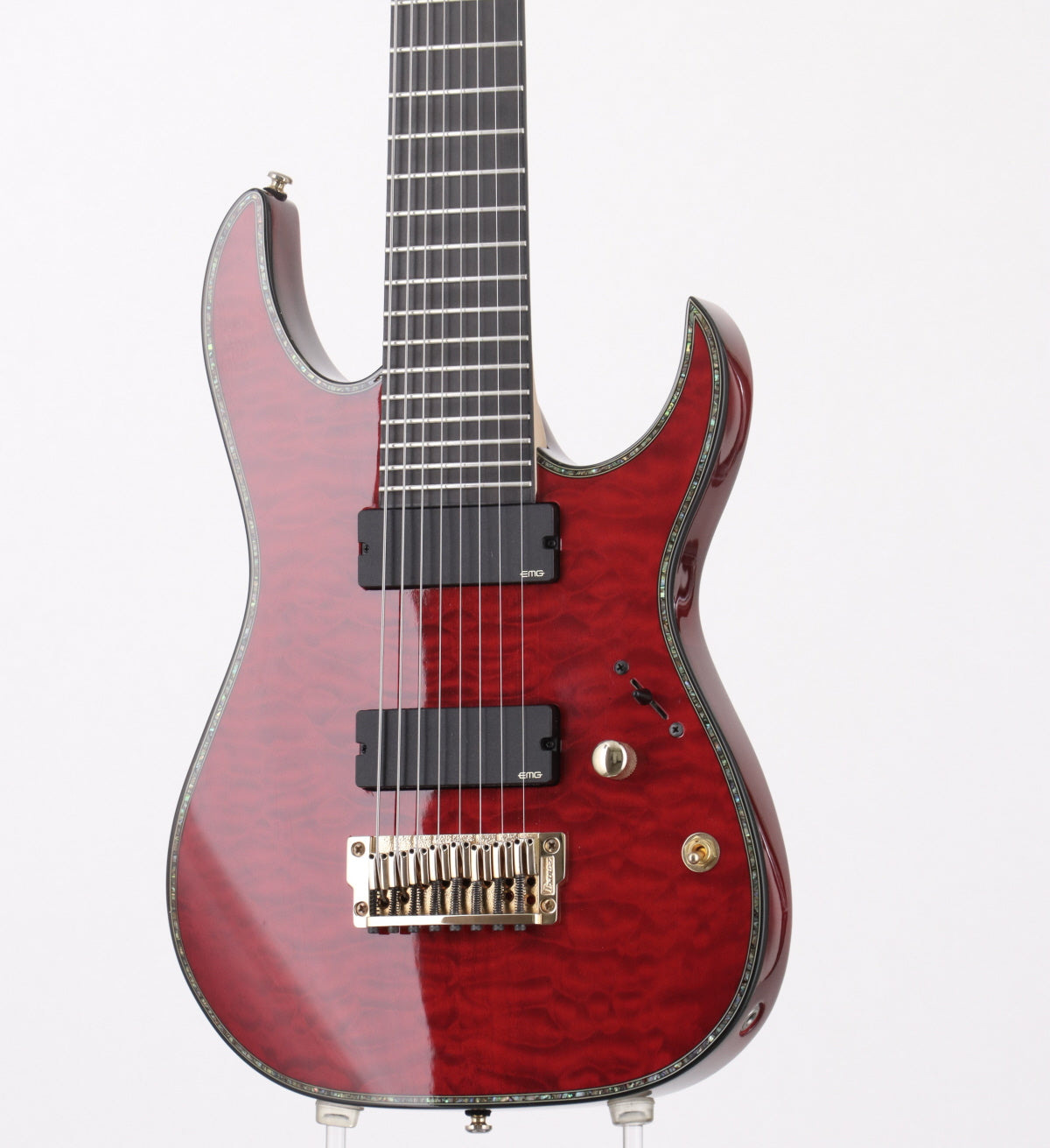 キルテッド・メイプル・トップ/バスウッド・バックのボディーにメイプル/ウォルナットの8ピース構造のネック、指板材にはエボニーを採用した24フレット仕様。