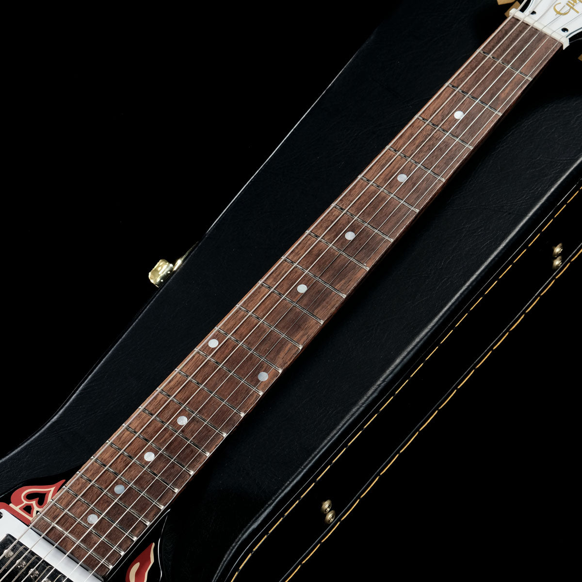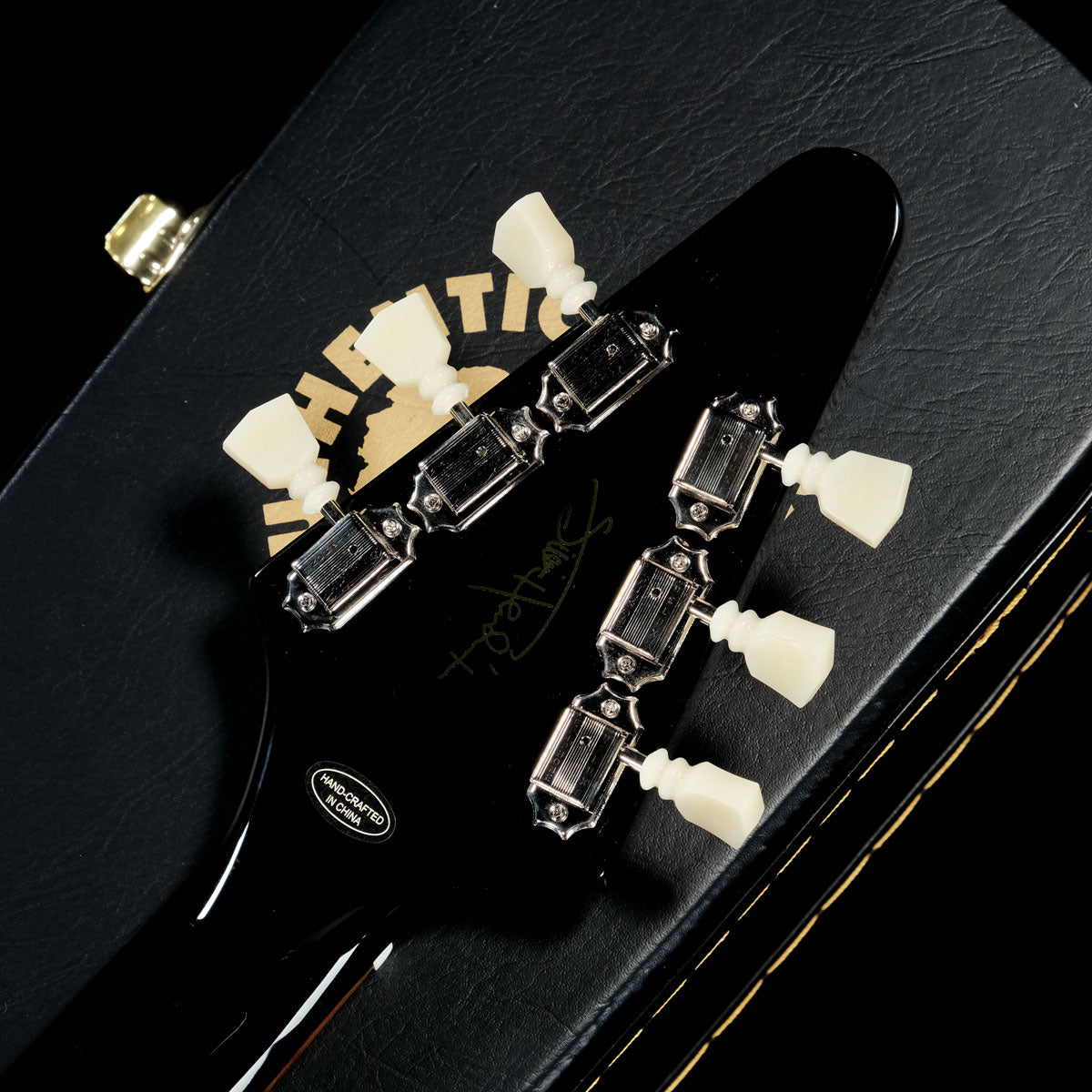 マホガニーボディ、丸みのあるラウンドCプロファイルのマホガニー・ワンピース・ネック、ローレル指板、そしてミディアムジャンボフレットによる22フレット仕様が特徴的です。1967スタイルのフライングVヘッドストックの裏には、「Inspired By Gibson Custom」のロゴと複製されたジミのサインが施されています。Epiphoneデラックスチューナー、ショートマエストロ Vibrolaを搭載。