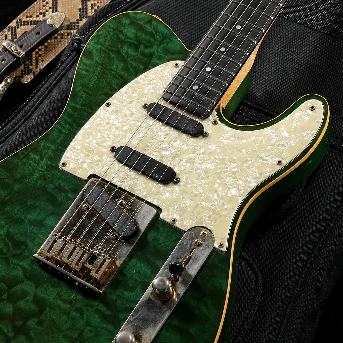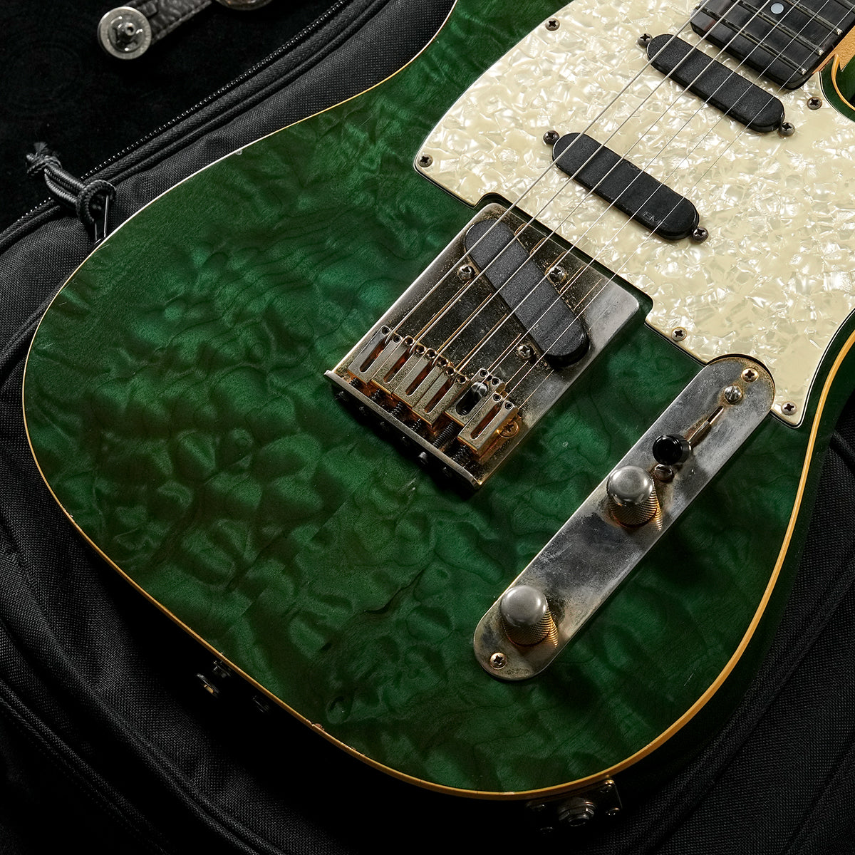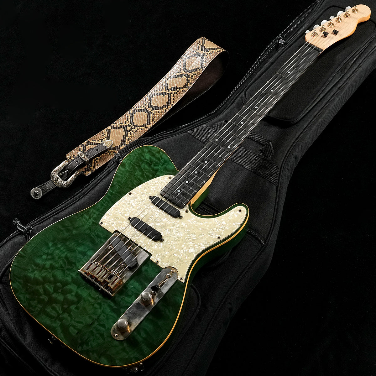スペックに於きましてはキルテッドメイプルトップにアッシュバックのボディにエボニー指板のネックが組み込まれていて、ピックアップはEMG TLセットにセンターはEMG SAを搭載。