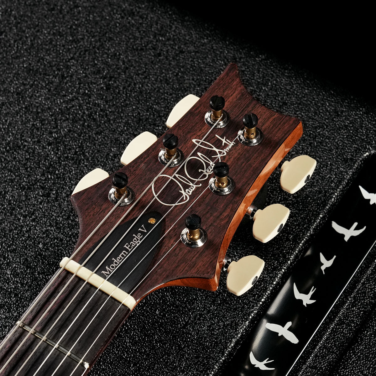 The Modern Eagle V also features a 22-fret, 25" scale, maple top, mahogany back, patterned mahogany neck, rosewood fingerboard, bone nut, and PRS Gen III tremolo.