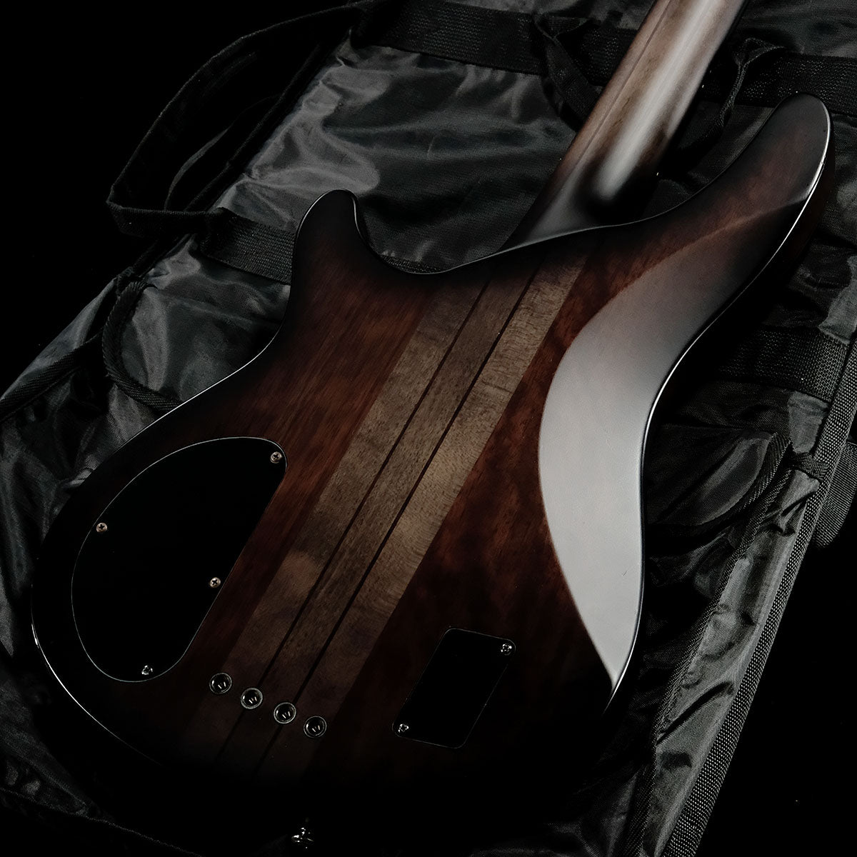 厚みのあるマホガニー・ボディー、メイプル/ウォルナットのラミネイト・スルーネック、ボディトップには美しいフィギュアード・メイプルが使用。