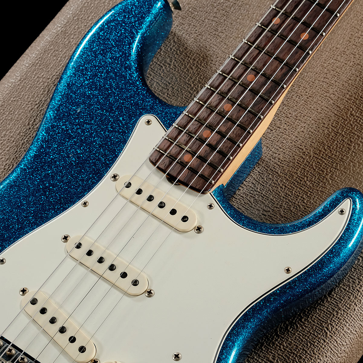 スラブ仕様で人気の60スペックモデル、そして目を惹くスパークル仕様、またピックガードは鮮やかなブルースパークルに合わせてミントガードではなく、あえてのパーチメントでオーダー!ギラギラながら爽やかなも持ち合わせる一本に仕上がりました!