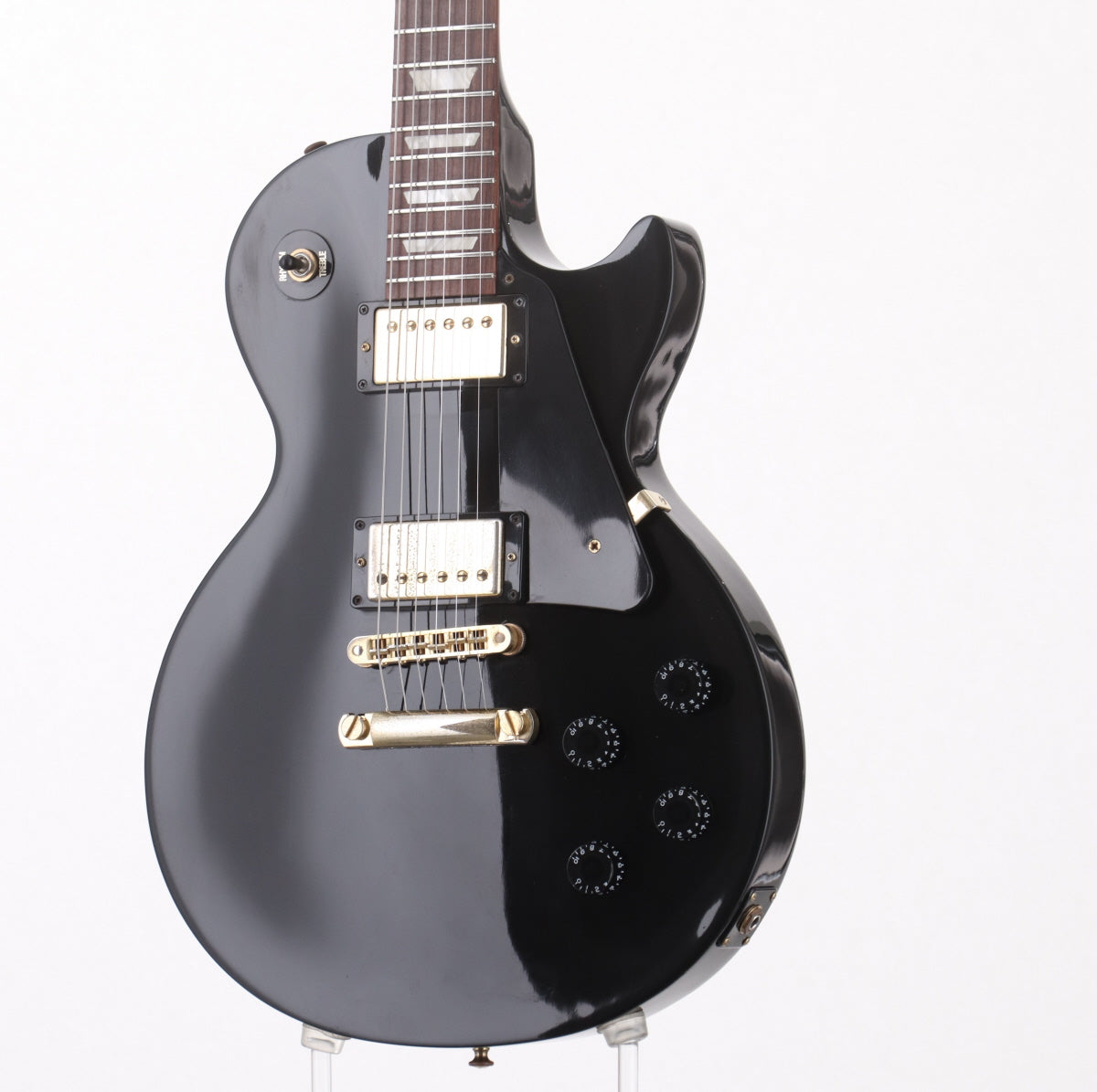 Compared to the Les Paul Standard, the binding (lines) around the body and fingerboard are omitted, and the position marks are simple dots, which keeps the Les Paul sound while keeping costs down.