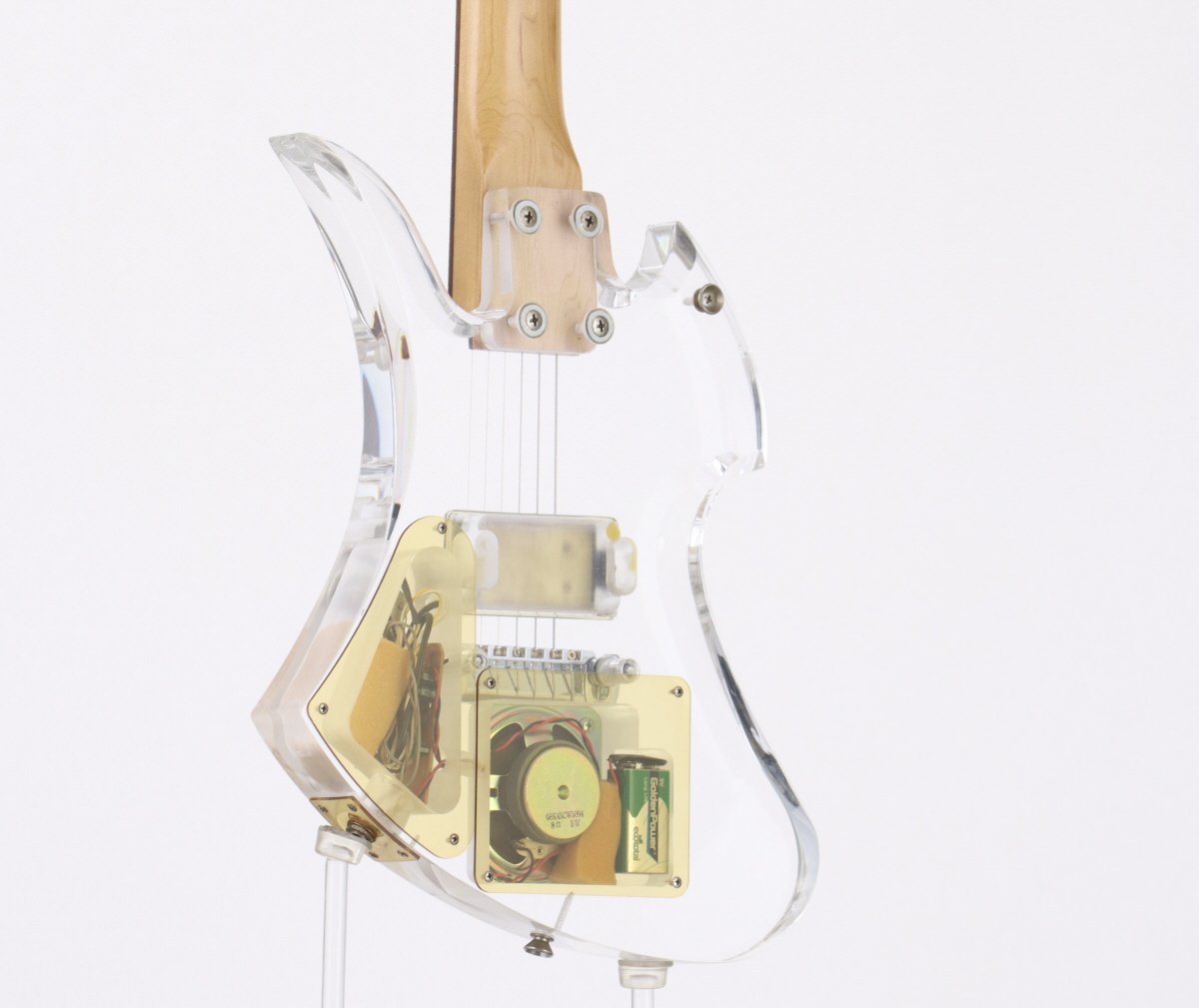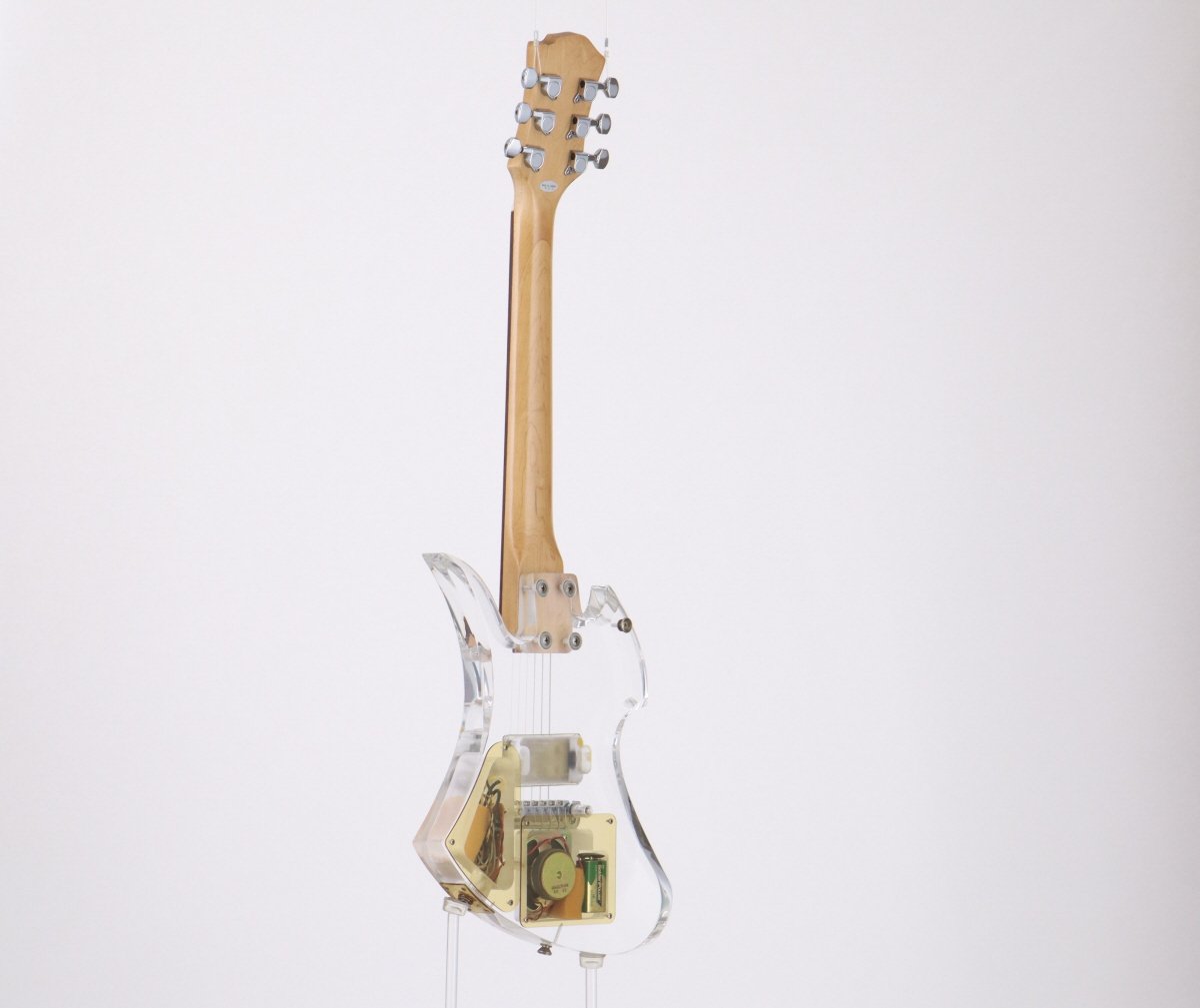 This model with built-in speaker is a downsized version of the MG-shaped HIDE model. It has an acrylic body, 1 humbucker, and 1Vol/speaker ON-OFF switch.