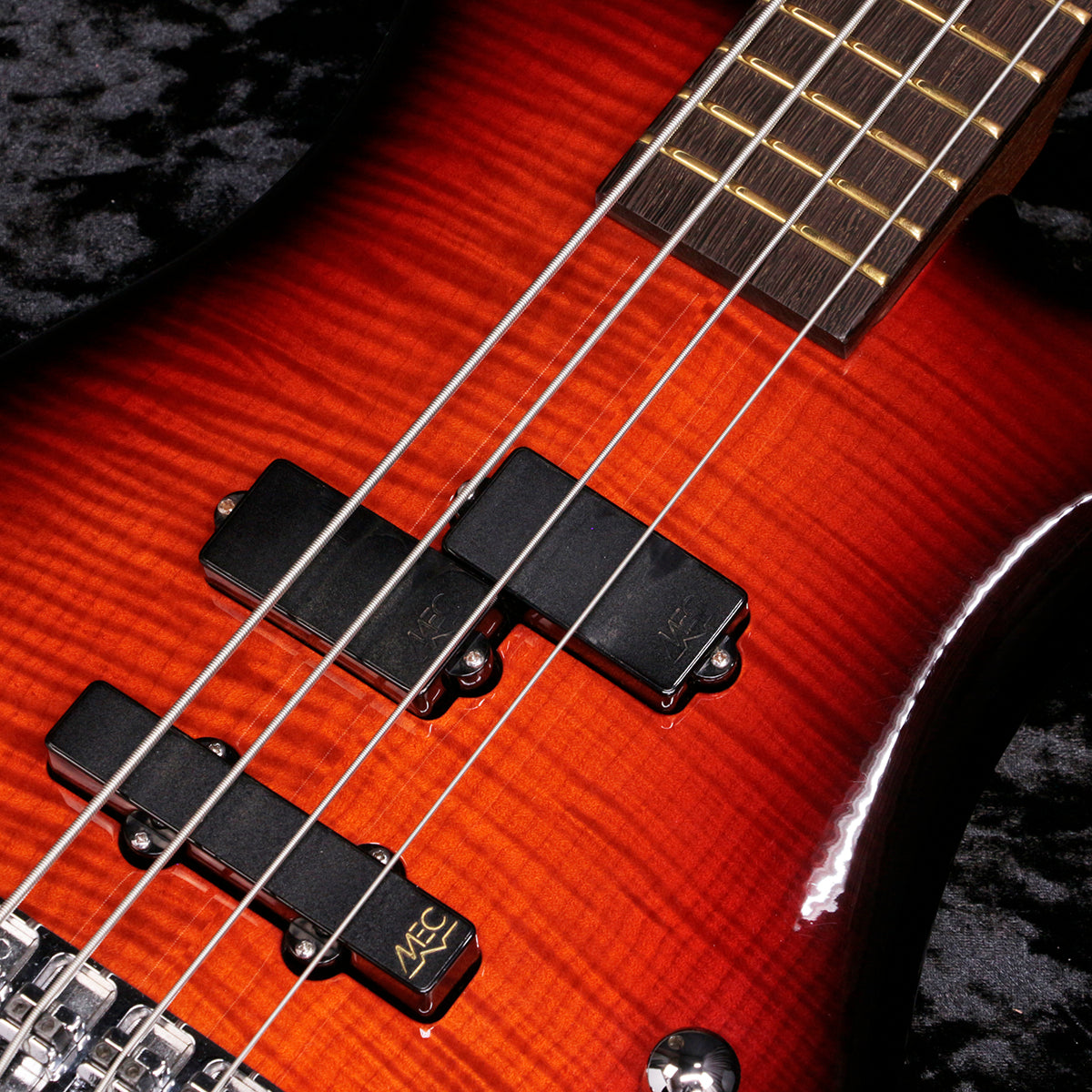 Flamed Maple AAA body, Ovangkol neck, Wenge fingerboard, MEC pickups in PJ layout.