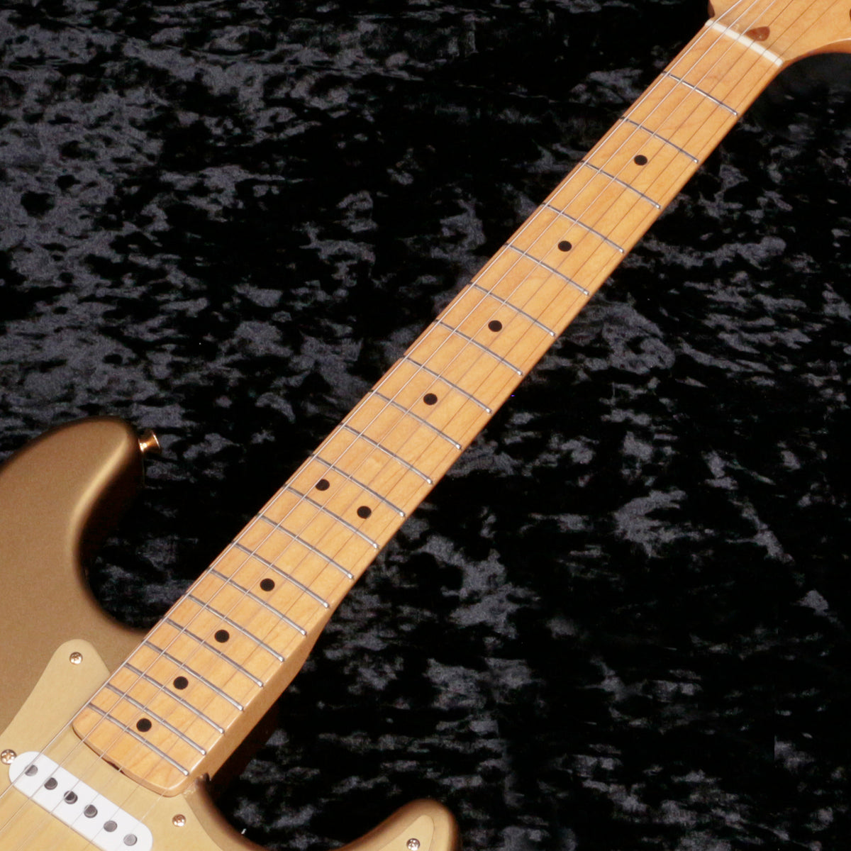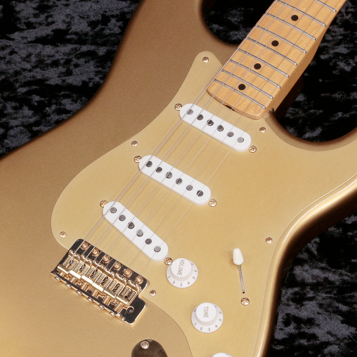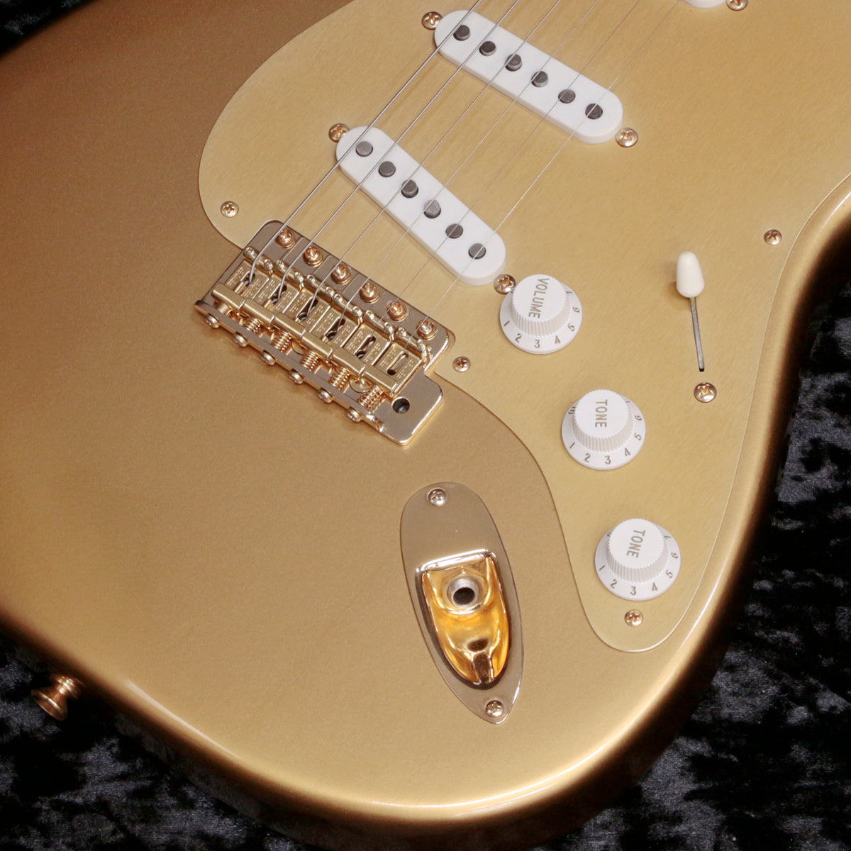 アルダーボディ/メイプルネックの57ストラトキャスタースペックにアノダイズドピックガード採用、そのほかパーツもゴールドで統一された目を惹くルックスです。