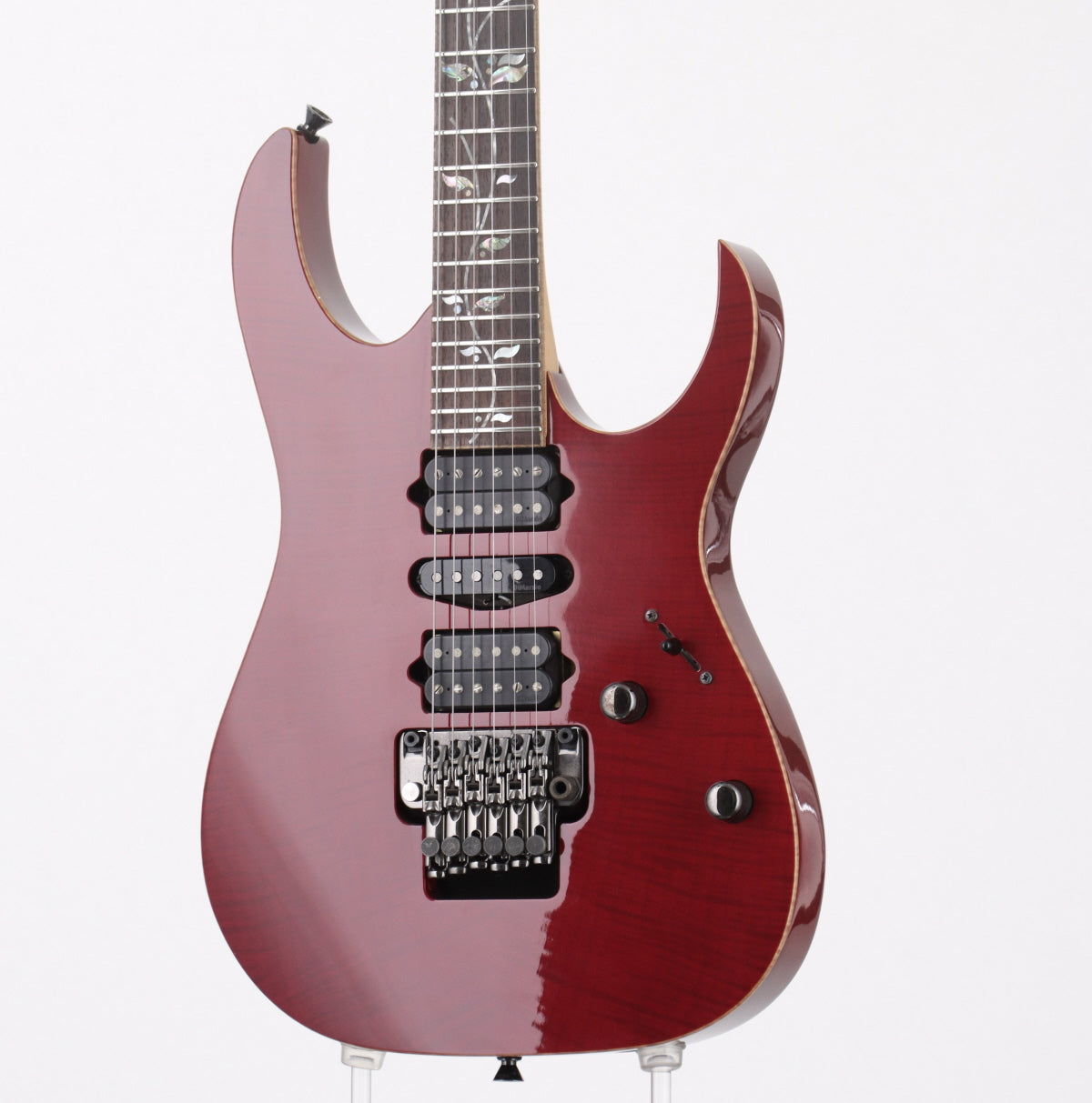 Ibanez's top-of-the-line electric guitar series "j.custom", the RG series has been highly acclaimed for its high playability and functionality. Flame maple top and mahogany body, Super Wizard shape 5P maple/walnut neck, natural binding, rosewood fingerboard with Tree of Life inlay, DiMarzio Air Norton/True Velvet/ PU. The Tone Zone H-S-H layout, 5-way selector, drop-in knob, Edge-Zero tremolo & ZPS3 zero point system.