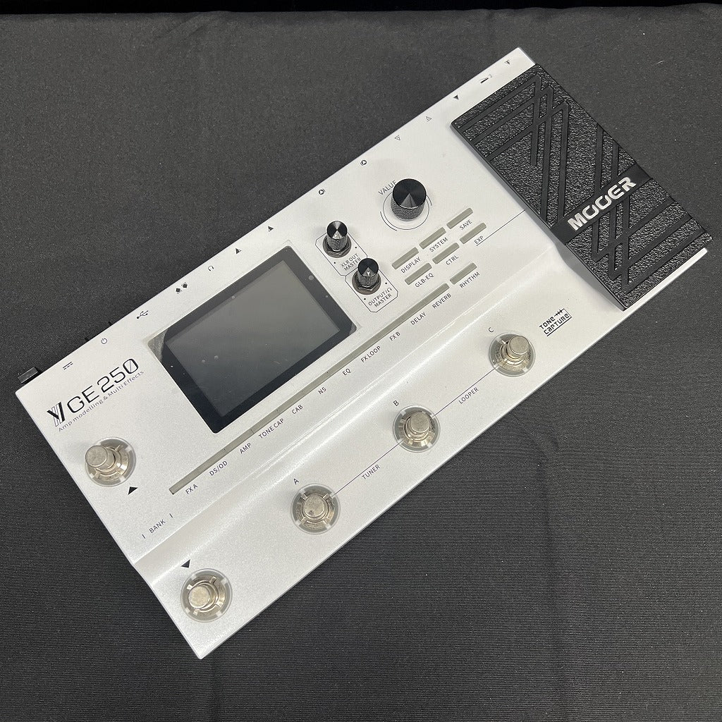 Mooer GE250は、55種類のアンプモデル、152種類のエフェクト、32種類のキャビネットシミュレーションを収録した、ミドルサイズのマルチエフェクターです。