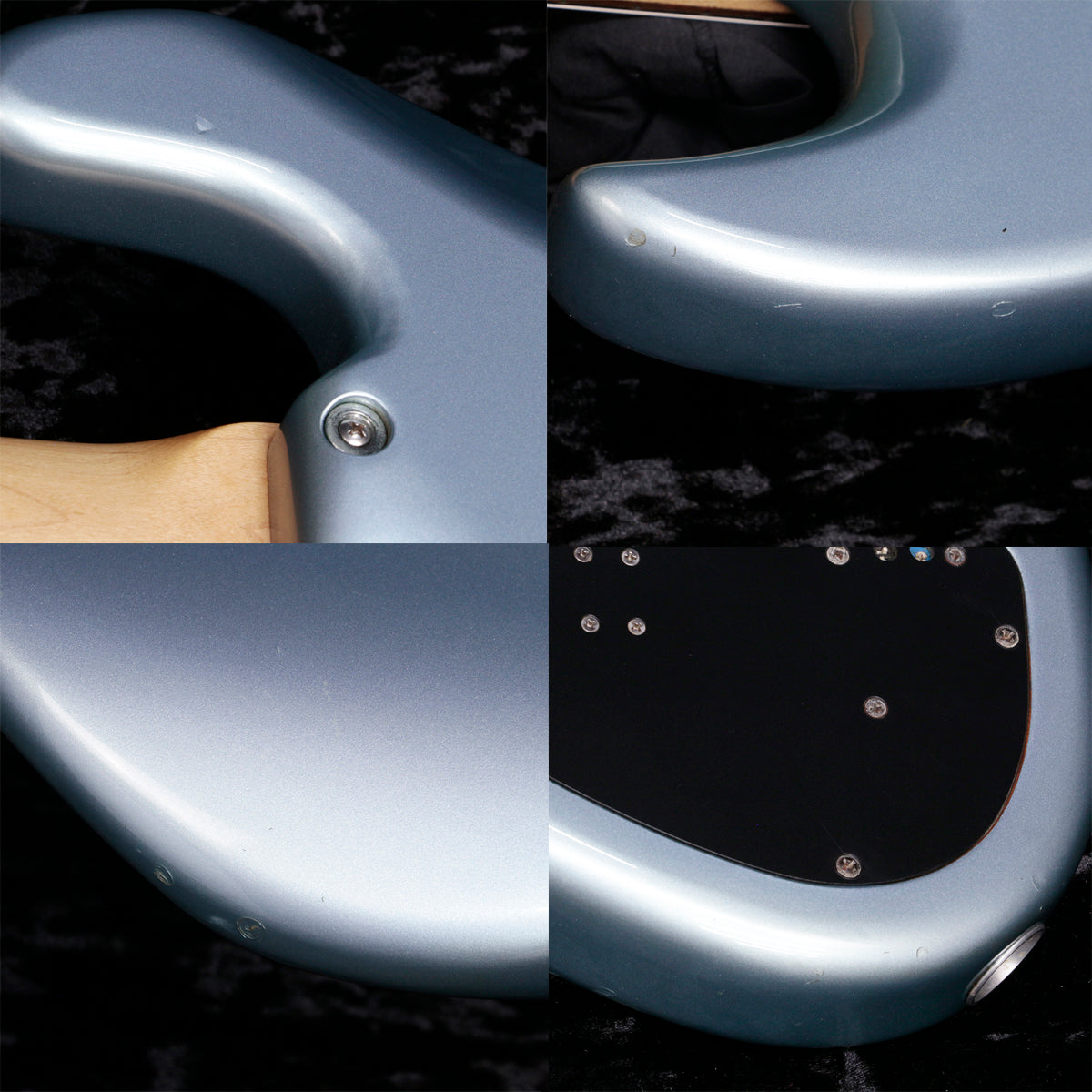 全体的に使用感が強く、傷、打痕、金属パーツの錆びやピックガードの色焼け、ピックアップの削れが見受けられる他、ペグ1つ交換、ヘッドのストリングガイドが外され、元のネジ穴をタッチアップした跡があり、テンションバーが取り付けられております。トラスロッドキャップ舐め気味です。