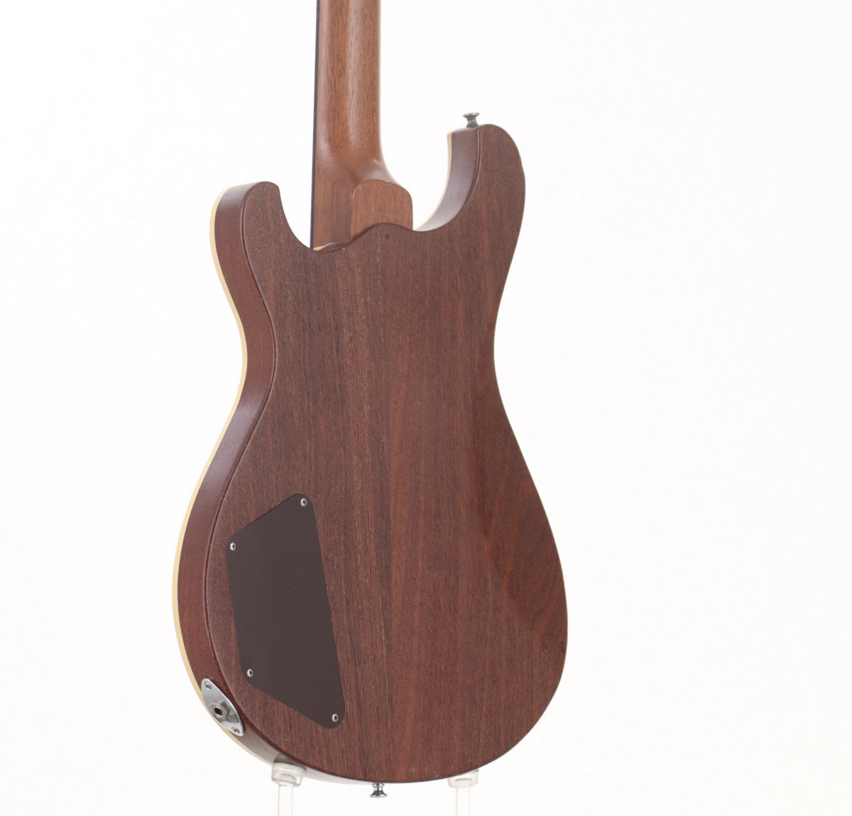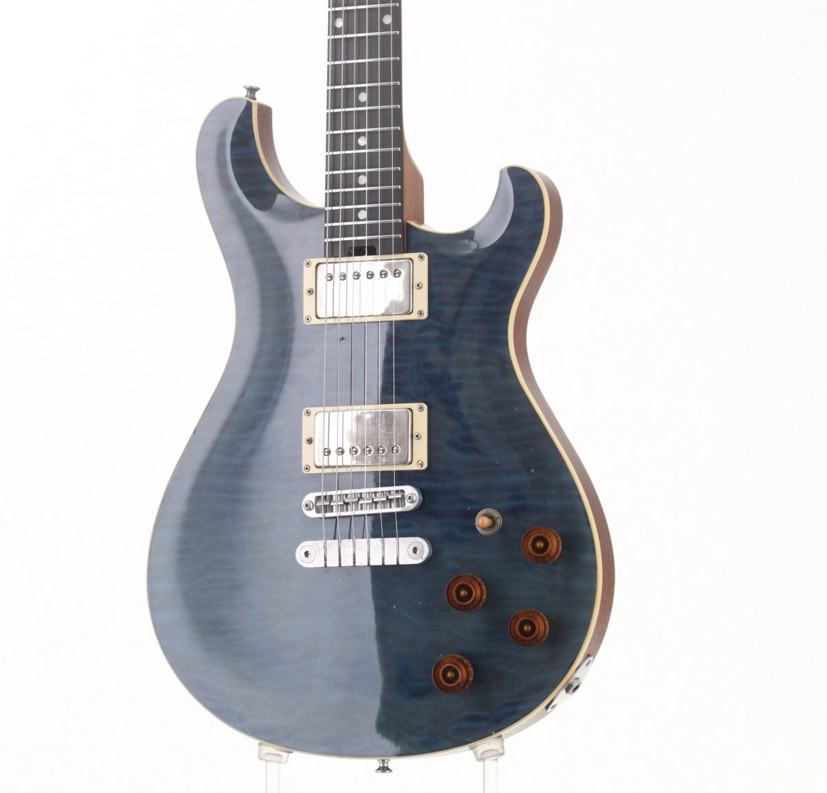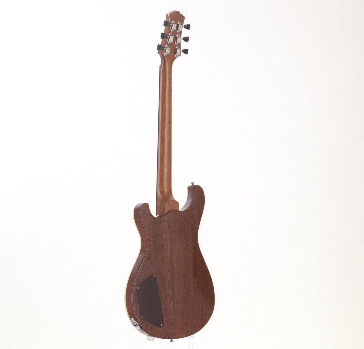 PRSのようなシェイプのフレイムメイプルトップにマホガニーバックのボディ、マホガニーネック、指板はエボニーだと思われます。