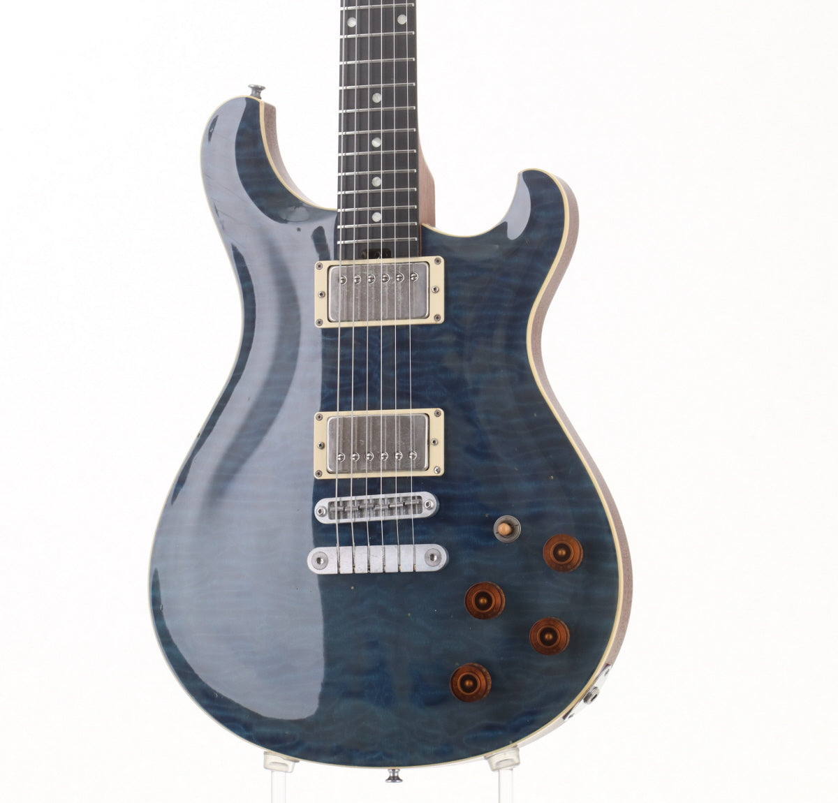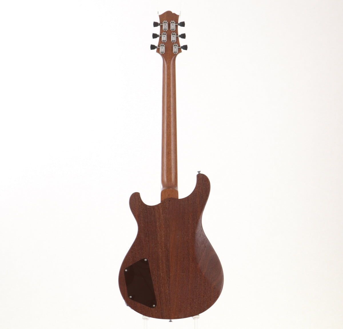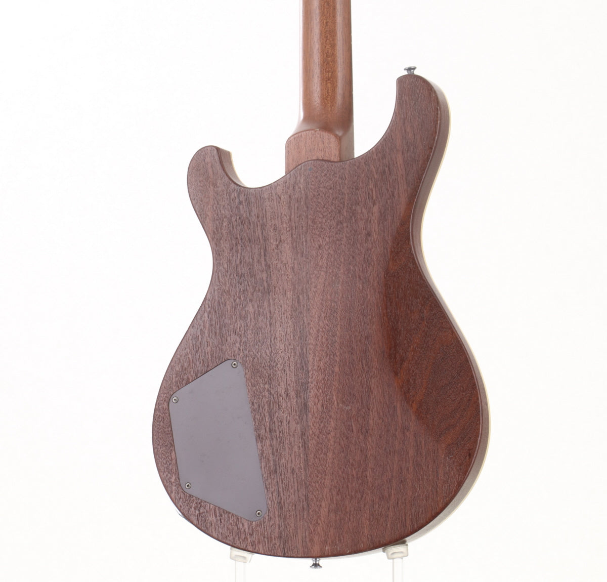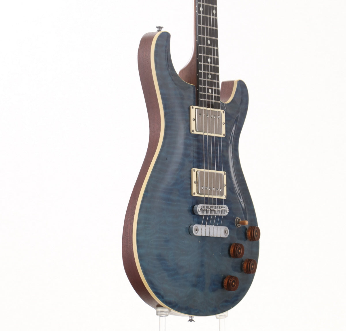 PRSのようなシェイプのフレイムメイプルトップにマホガニーバックのボディ、マホガニーネック、指板はエボニーだと思われます。