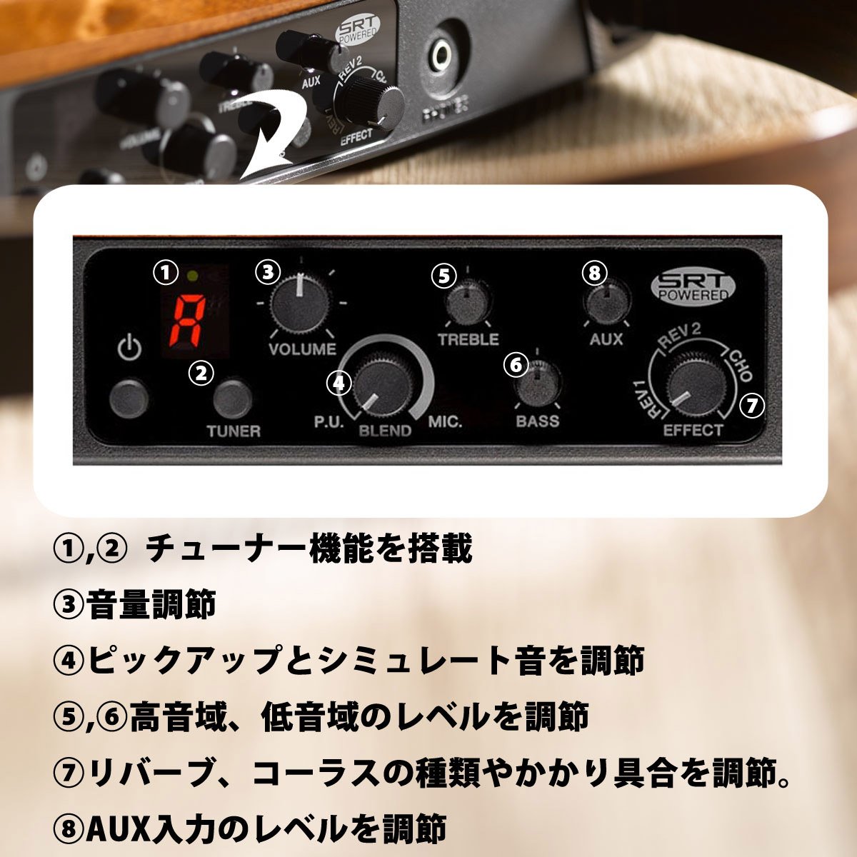 100シリーズではB-Bandのピエゾピックアップを搭載していましたが、200シリーズではSRT(Studio Response Technology:スタジオ・レスポンス・テクノロジー)パワード・ピックアップシステムを搭載!各弦に独立したピックアップを搭載したピエゾピック アップサウンドと、GC42SをNeumann U67でマイキングしたサウンドをシミュレートしたMICサウンドとをブレンドすることが可能です。さらに、便利なクロマチックチューナーも搭載!