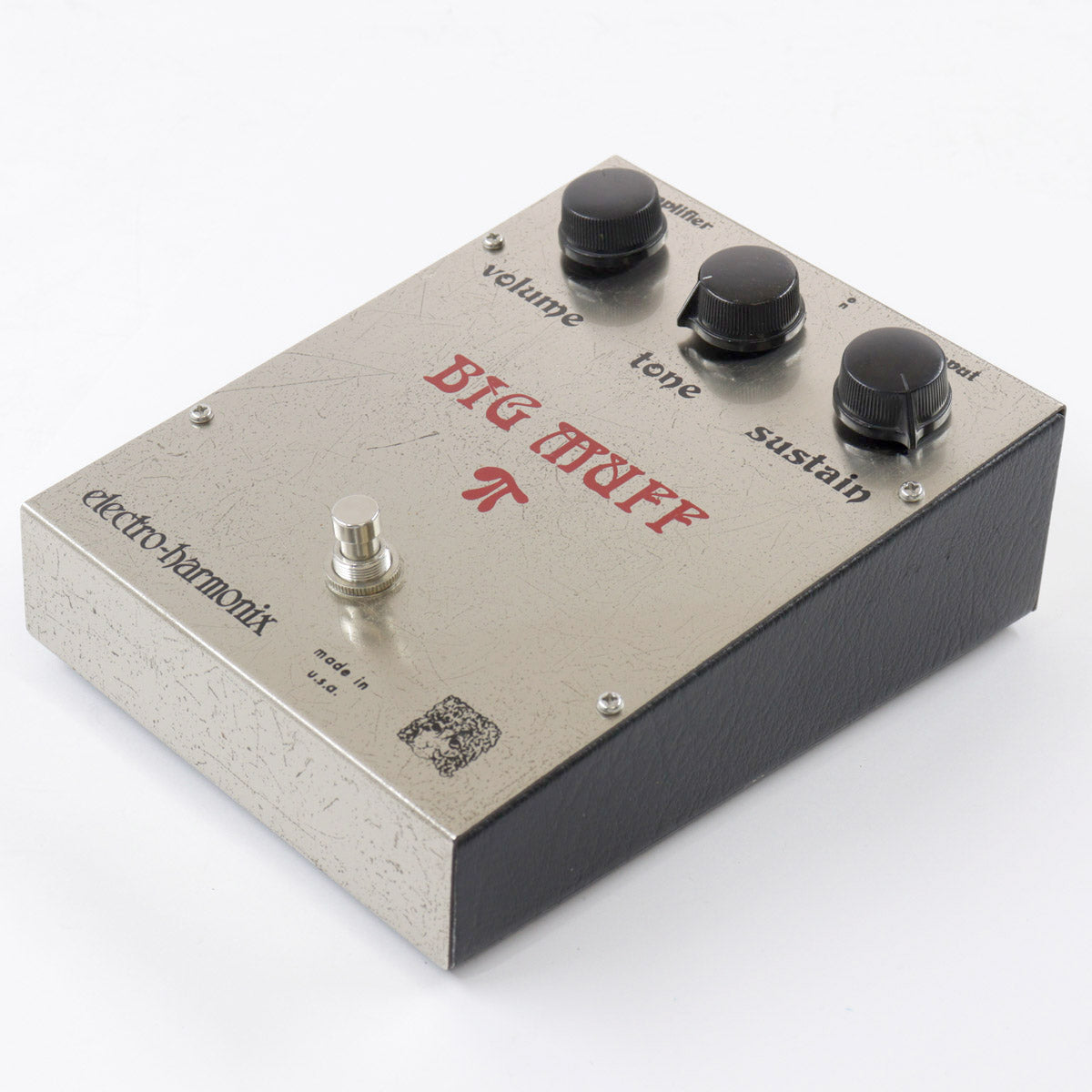 The "Ram's Head" Big Muff (V2) from the 1973 era, known as the "Ram's Head," is a popular guitar instrument that delivers a clear separation of sound and exceptional sustain for each individual string. This is the "Big Muff" (V2) from this era.