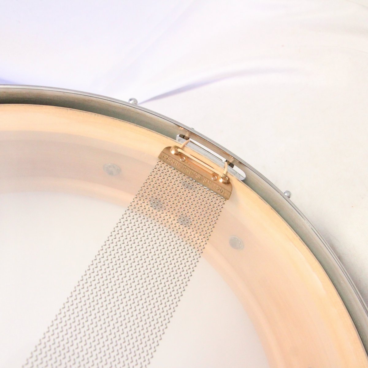 レインフォース付きのソリッドメイプルに1点止めのブラスラグ、スナッピー周り、オリジナルのダイキャストフープなども含め、サウンド、デザインともにオリジナリティの溢れるスネアです。