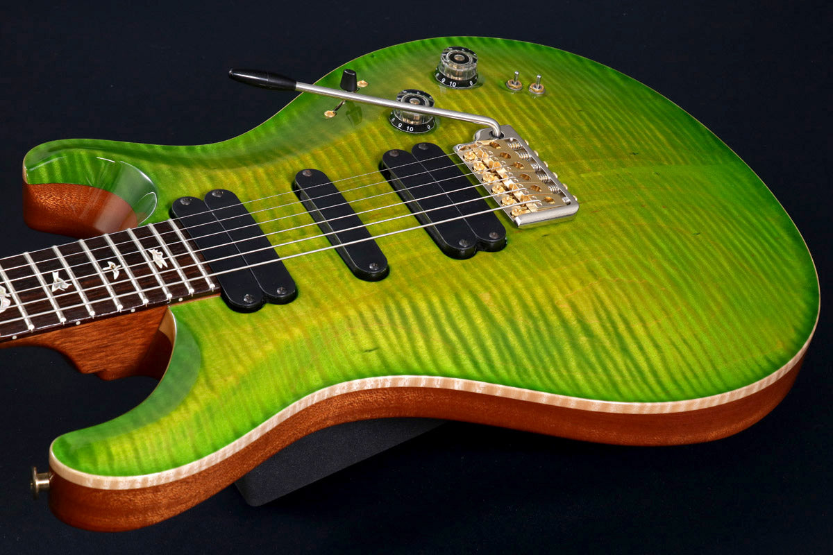 The 509 features a 5-way played SW and two mini SWs for 9 different wiring patterns, all lacquered (High-Gloss Nitro) 10-top grade maple top/mahogany back, Pattern Regular shaped mahogany neck, 25. 25" scale, 22 frets with bird inlays, PU is a 509 H-S-H layout, and parts are a hybrid of alternating gold and nickel.