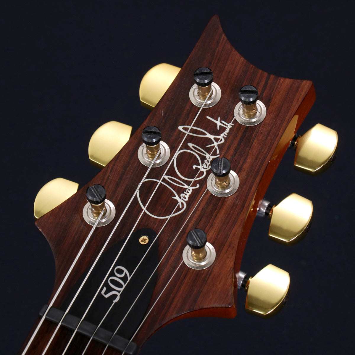 5WayプレードSWと2つのミニSWにより9種類の配線パターンを実現した509。オール・ラッカー塗装(High-Gloss Nitro)の10トップグレード・メイプル・トップ/マホガニー・バック、Pattern Regularシェイプのマホガニー・ネック、25.25インチ・スケール、バードインレイの施された22フレット、PUは509のH-S-Hレイアウト、パーツ類はゴールドとニッケルを交互に配置したハイブリッド仕様になっています。