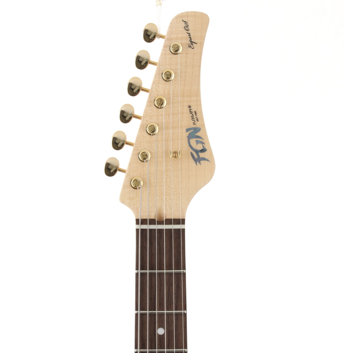 フジゲン(FGN)のExpert ODYSSEYシリーズ・EOS2-FM-R、2022年製です。フレイムメイプル・トップ/アッシュ・バック、「ムーンサルト・ヒール・カッタウェイ・ジョイント」、クオーターソウンメイプル・ネック、ローズ指板、C.F.S.(サークル・フレッティング・システム)、PUはFGN OS-2n/OS-2rw/XPERT-Hf、リアPUのダイレクトSW/リアPUのコイルタップSWを備え、GOTOH製マグナムロック・ペグ&GOTOH製 510TS-FE1トレモロを採用しています。