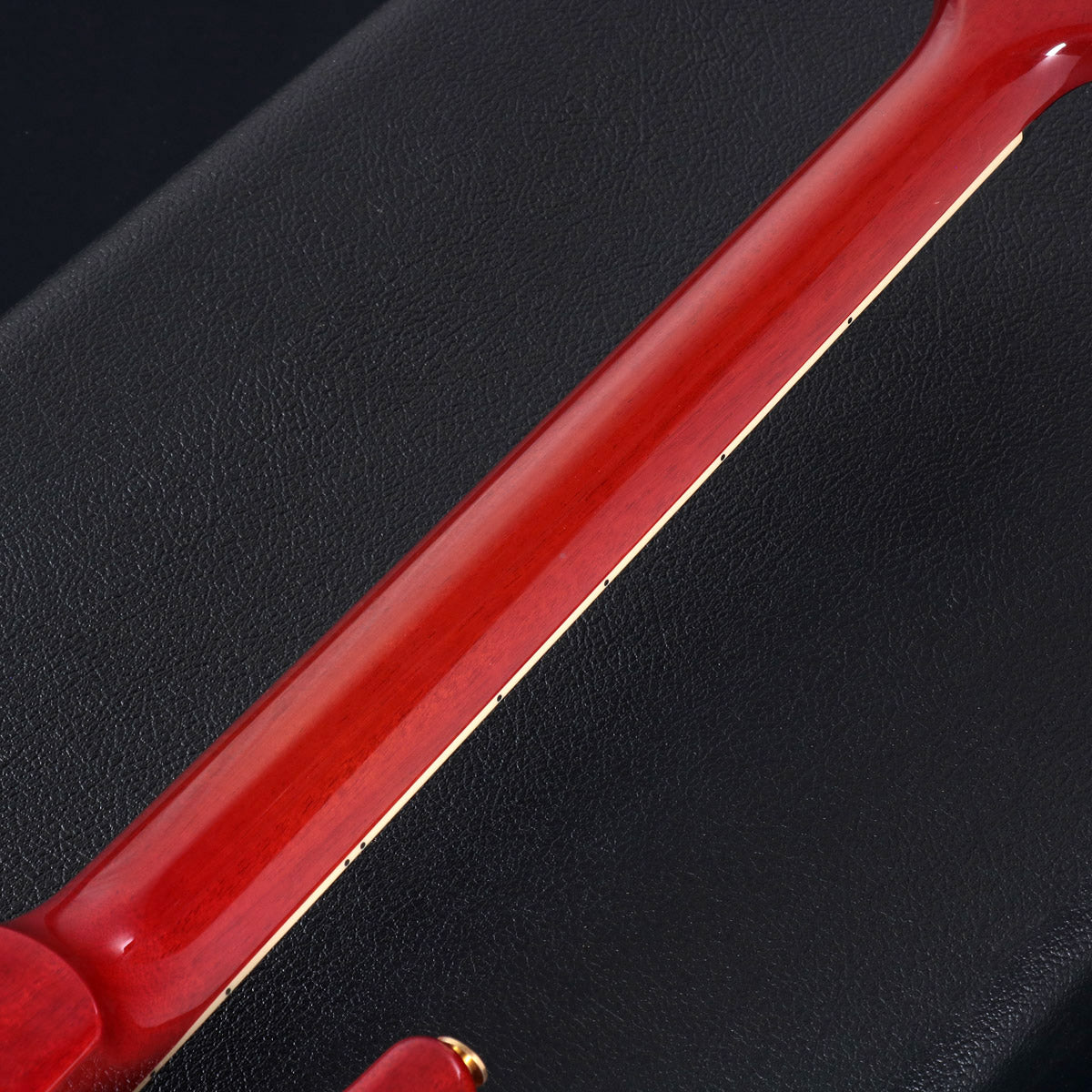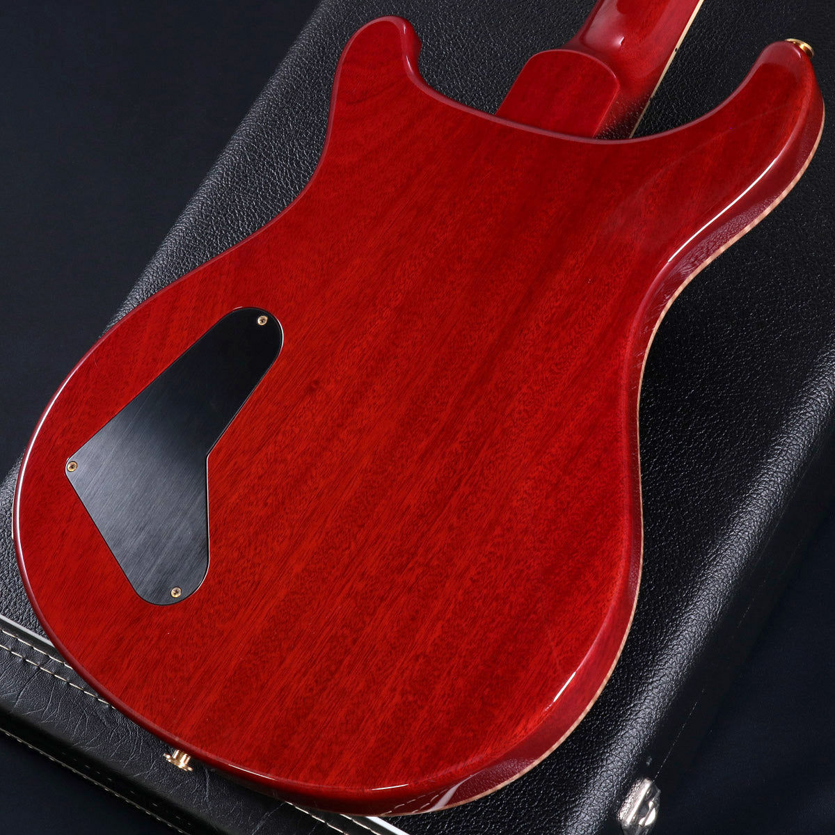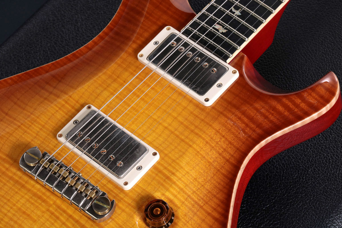 The body is thicker than the Custom 24/22 with a 10-top grade maple top/mahogany back, thinner head than the Custom 24/22, pattern shaped mahogany neck, ebony veneer on the head top, white binding and bird inlays on the Ebony fingerboard with white binding and bird inlays, 58/15 Treble and 58/15 Bass PUs, tone-pull coil tap, nickel and gold hybrid hardware parts, and adjustable stop tailpiece bridge.
