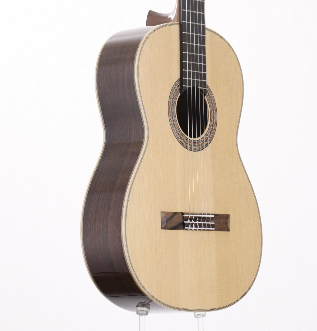 Solid German pine top, Indian rosewood sides and back, natural binding, mahogany neck, ebony fingerboard, serac varnish finish on the top, and glossy urethane coating on the sides and back.