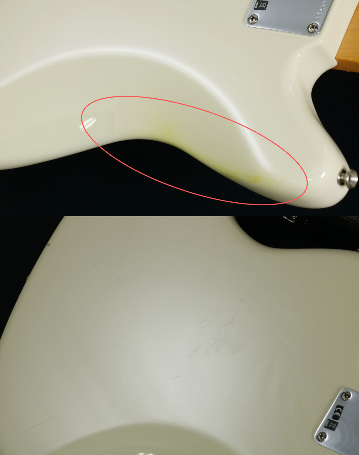 セレクターノブ変更/ナット交換、使用感(色ヤケ、ボディ外周に小キズやひっかきキズ・塗装チップ、ヘッドデカール浮き、スレや弾きスジ、ピッキング痕、バックル痕、金属パーツやネジ類の曇り・ビッツ・サビ、等々の外観ダメージ)が見られます。