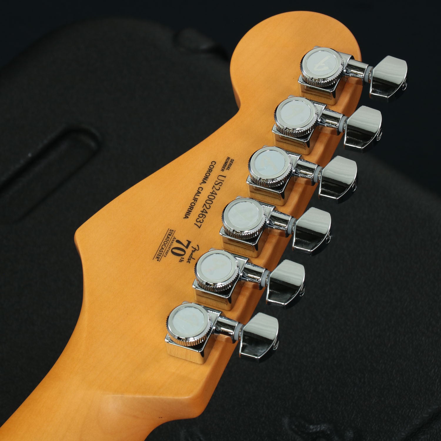 フェンダーUSAのアメリカン・ウルトラ・II・ストラトキャスター、2024年製です。アルダー・ボディ、モダンDシェイプのメイプルネック、10-14Rのコンパウンドラディアス指板、蓄光サイドドット、アノダイズドピックガード、アメリカ・ウルトラ・トレモロ、PUはUltra II Noiseless Vintage Stratx3、VolノブにS-1スイッチが採用されています。