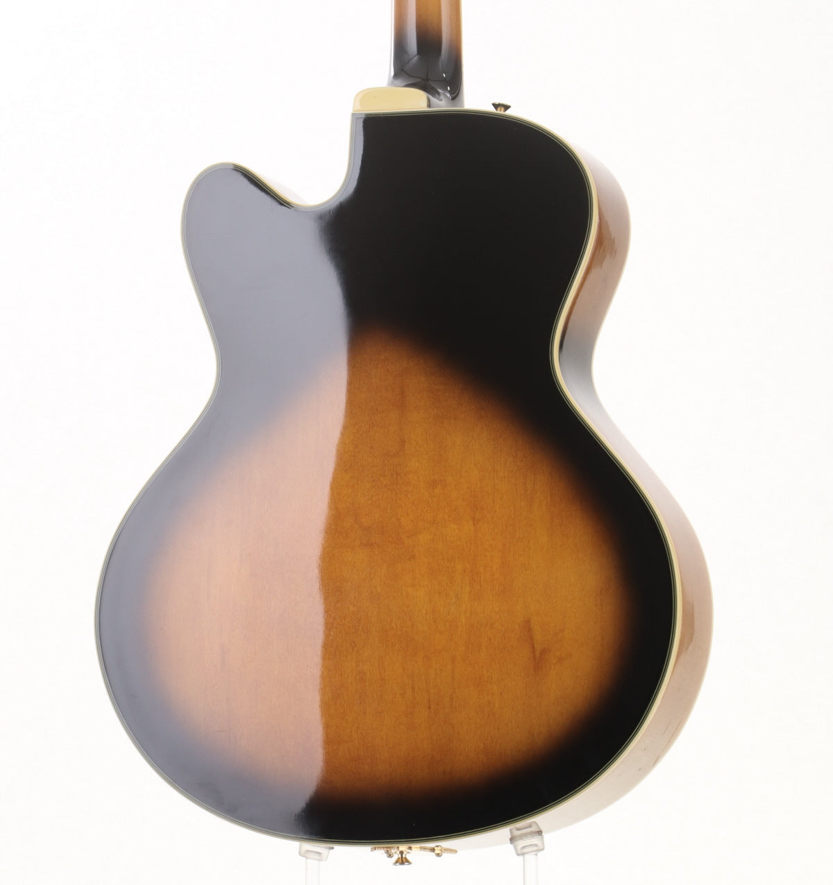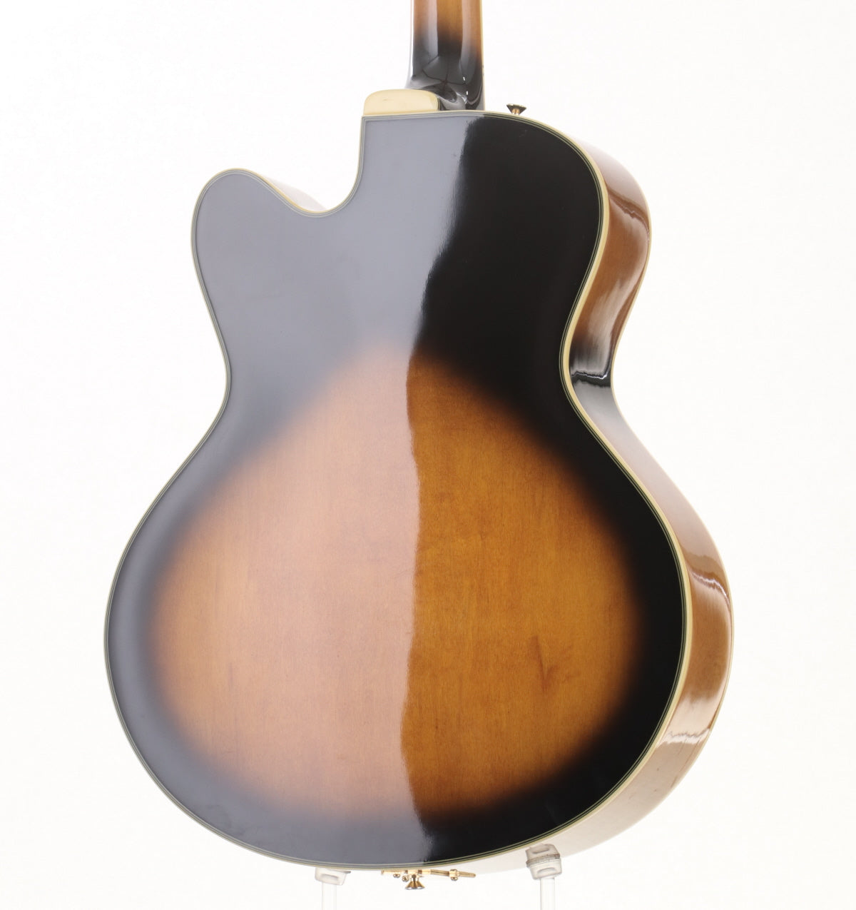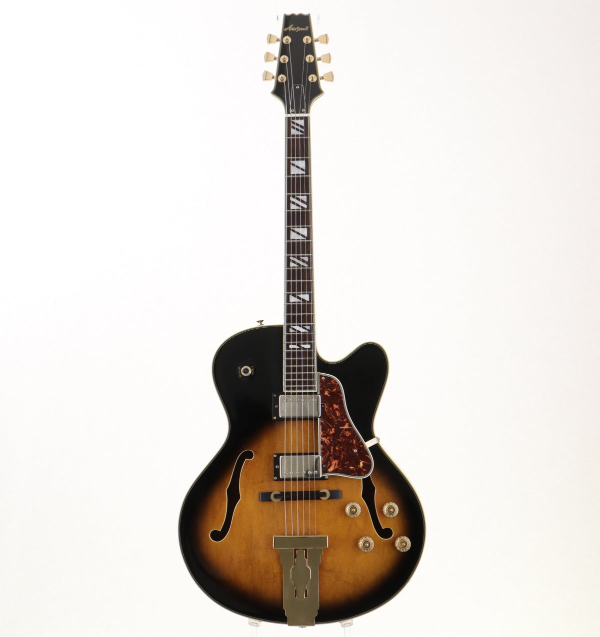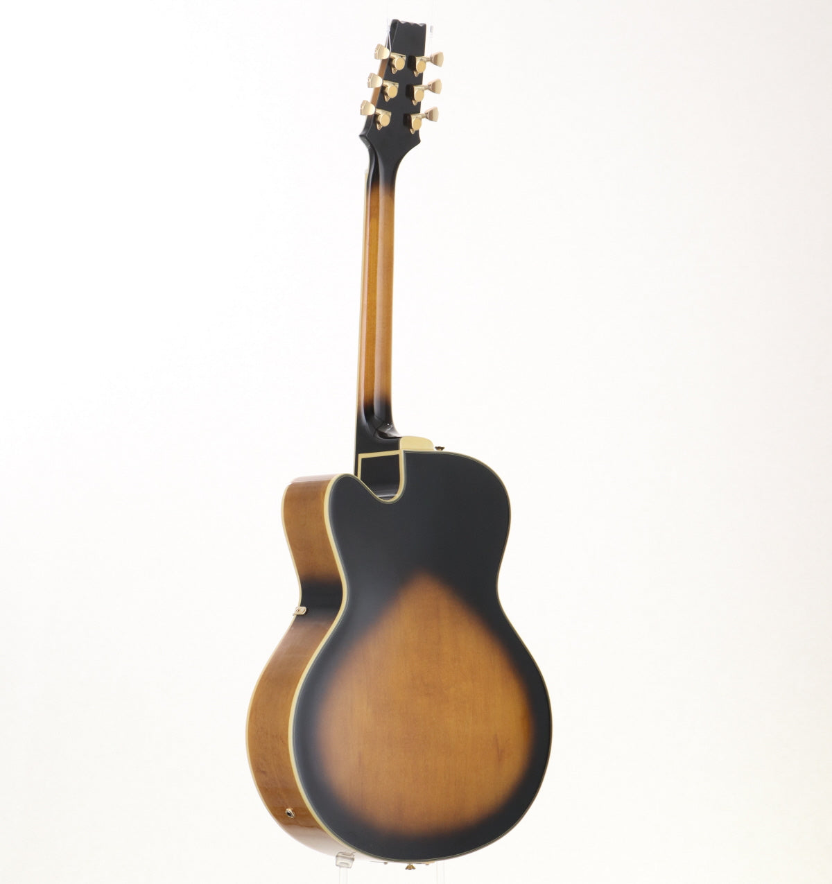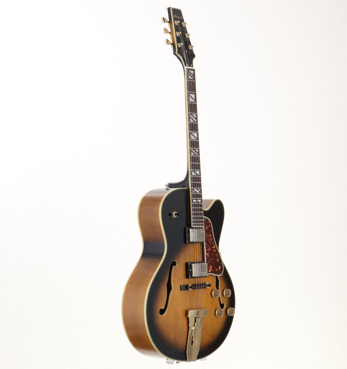 Circa 1990s full acoustic, as identified in the 1989 catalog. Maple top/side/back, maple neck, 14 degree square head, rose fretboard, 2 x MH-2G humbuckers, rosewood bridge, GOTOH pegs, and gold hardware.