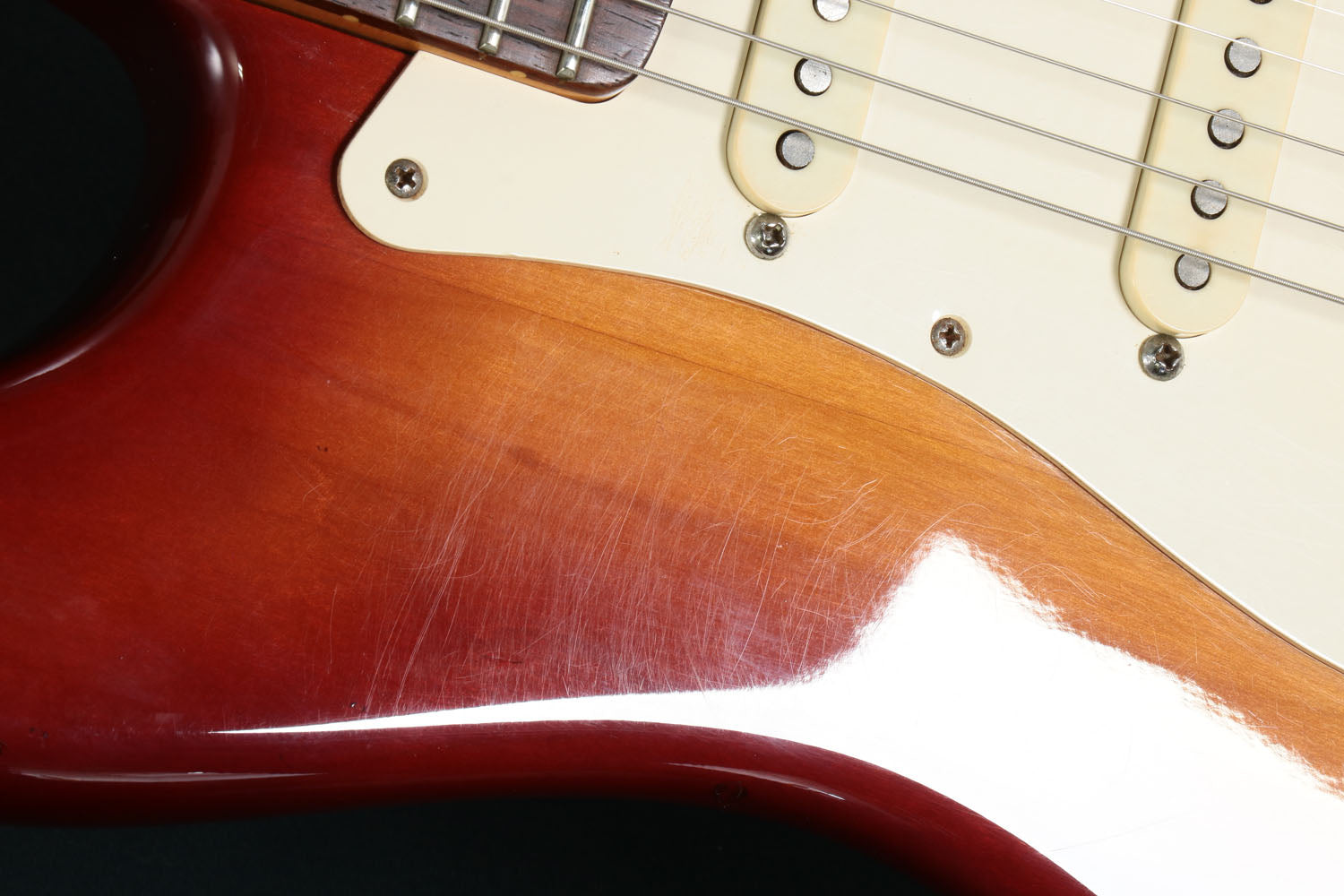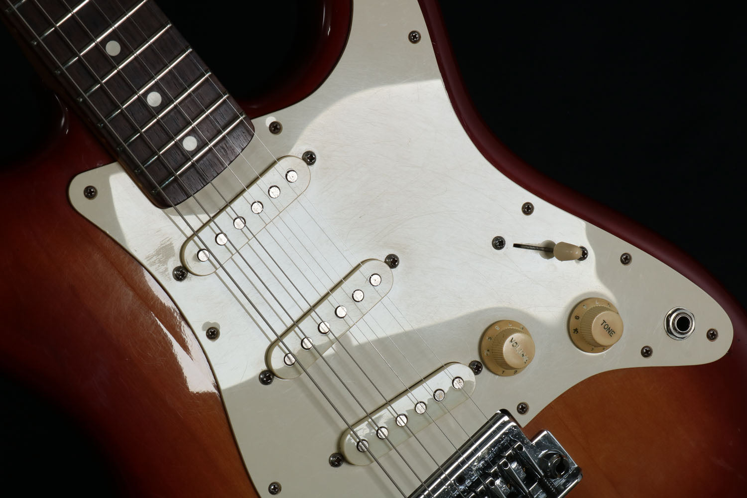 フェンダー・スタンダード・ストラトキャスター、1984製です。スモールヘッド&4点止めへと変更したダン・スミス・デザインの2ノブ・2NDバージョン。アルダー・ボディ、メイプル・ネック、ロース指板、1プライ・ピックガード、フラットポールピースのシングルコイルx3、Vol/Tone/5Wayセレクター、ボディトップで完結するフリーフライト・トレモロ、ロックピンを標準装備いています。