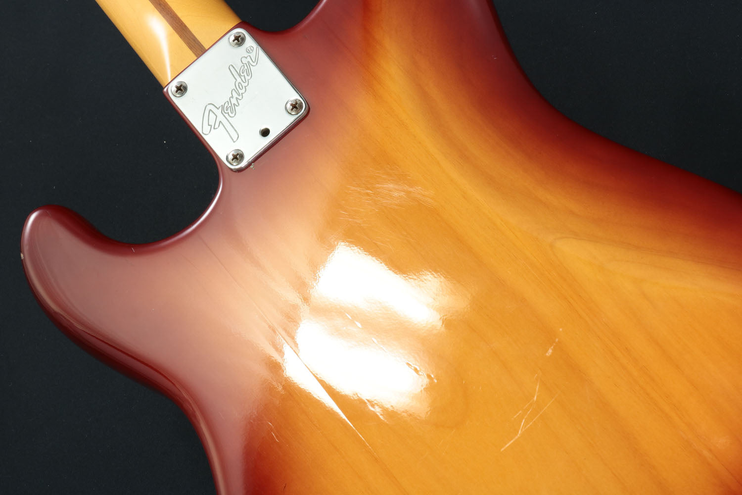 アーム、ロックピン金具欠品。使用感(色ヤケ、ヘッド周り打痕、ボディ周りに小キズやひっかきキズ・塗装チップ、スレや弾きスジ、ピッキング痕、バックル痕、ネジ類や金属パーツの曇り・ビッツ・サビ、等々)が見られます。