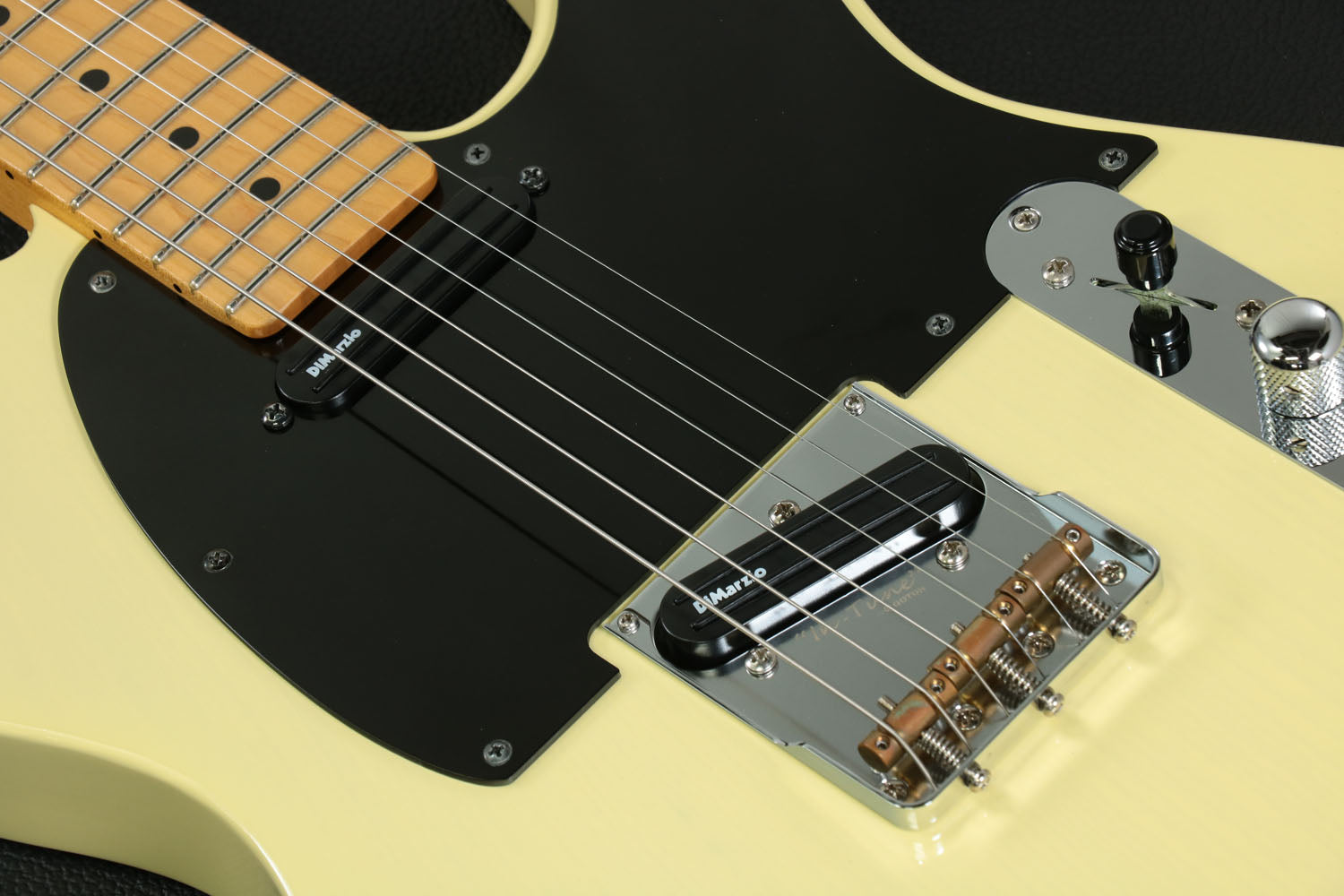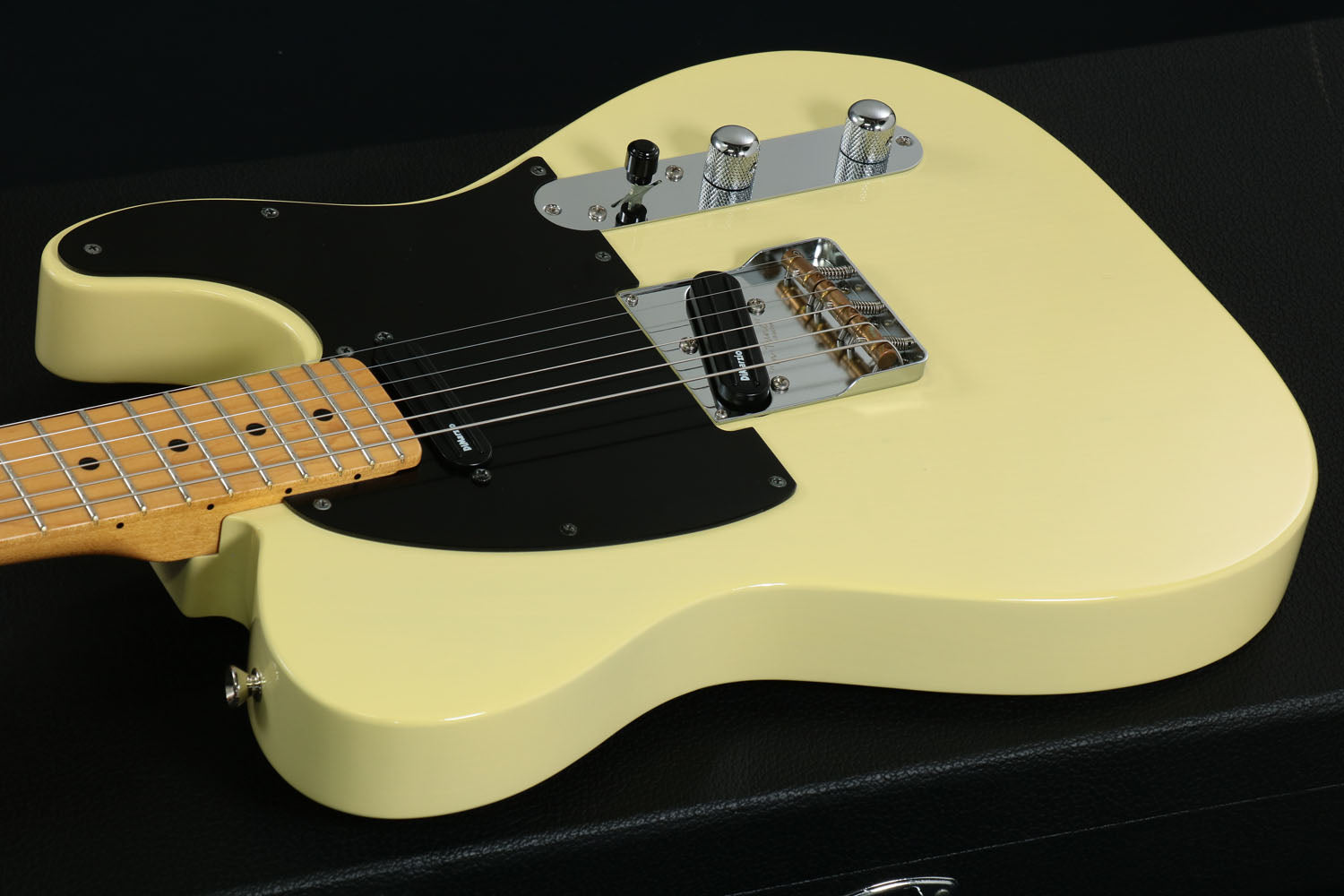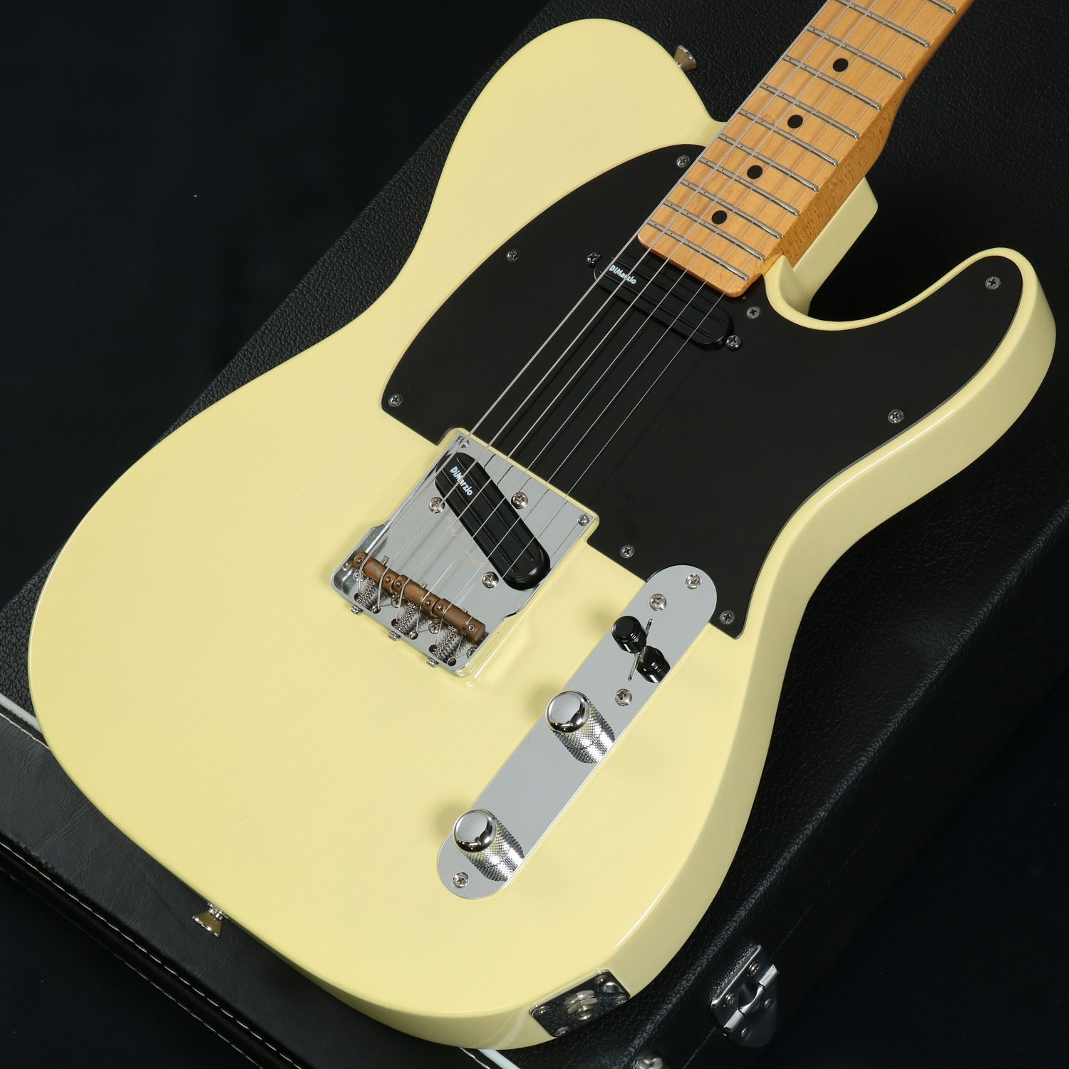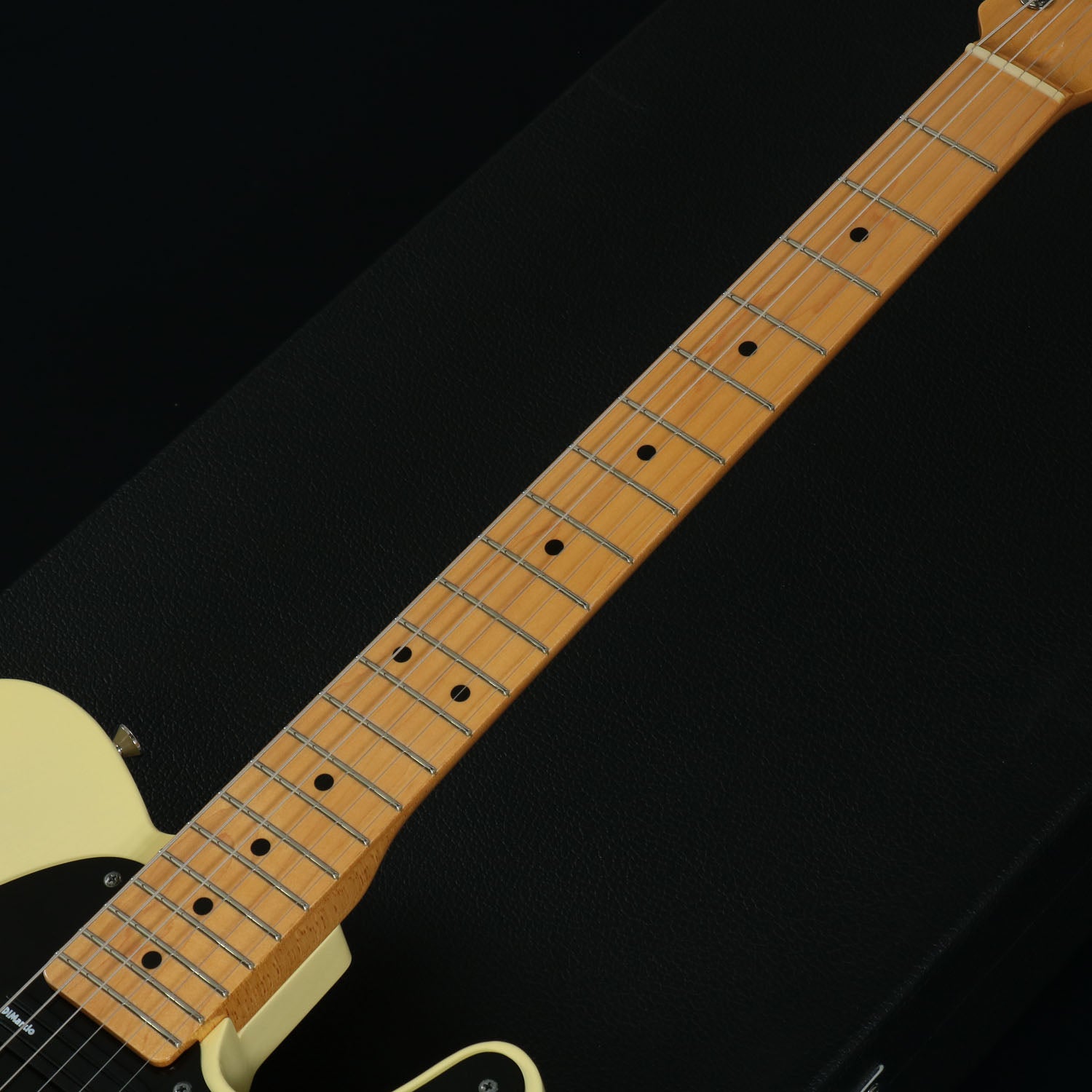This model is a 50s TL type with blond finish ash body, black guard, and soft V-shaped one-piece maple neck.