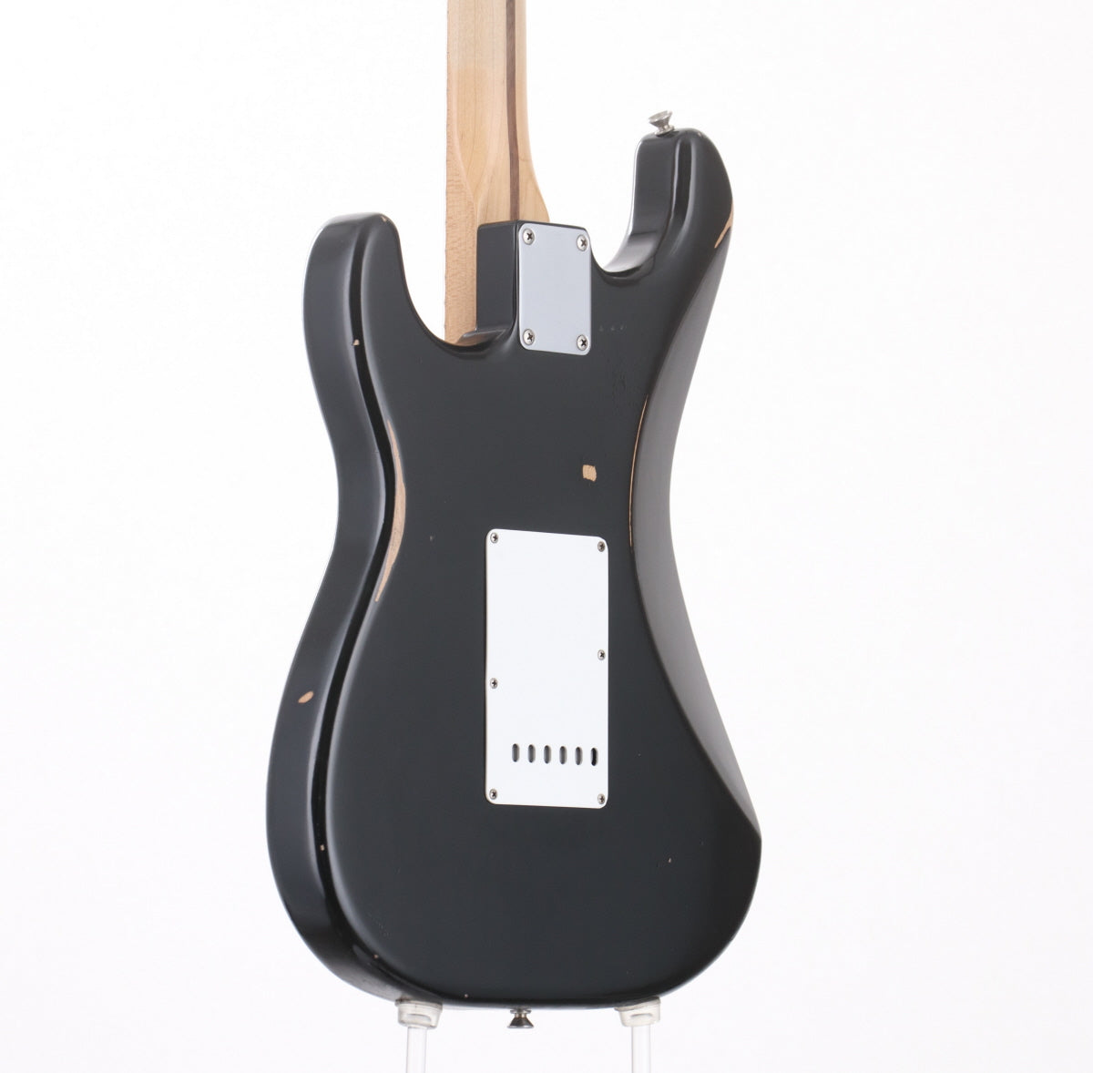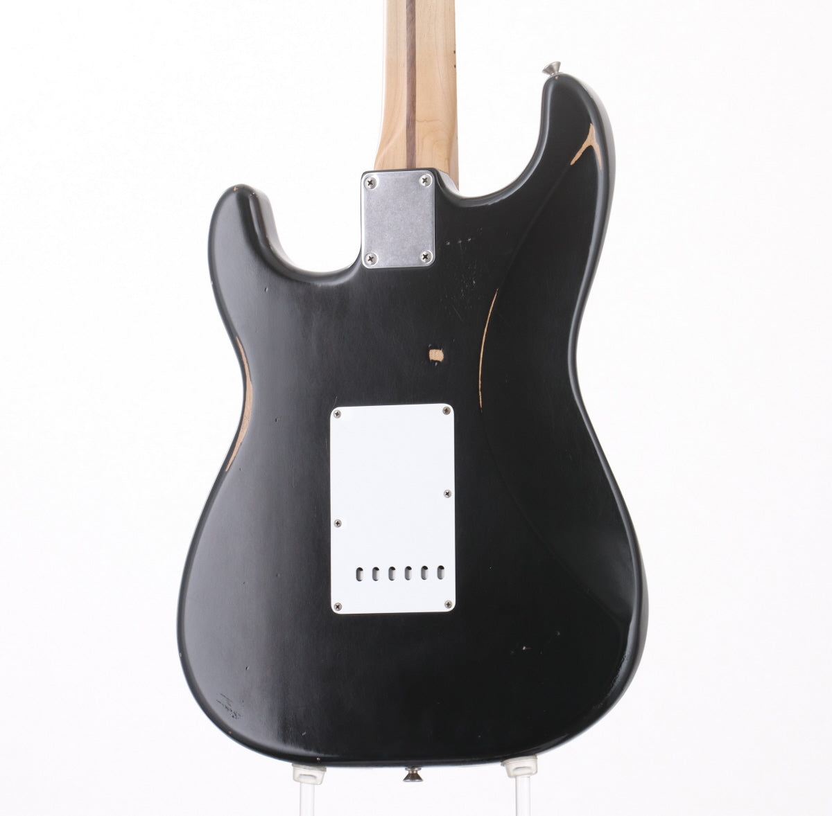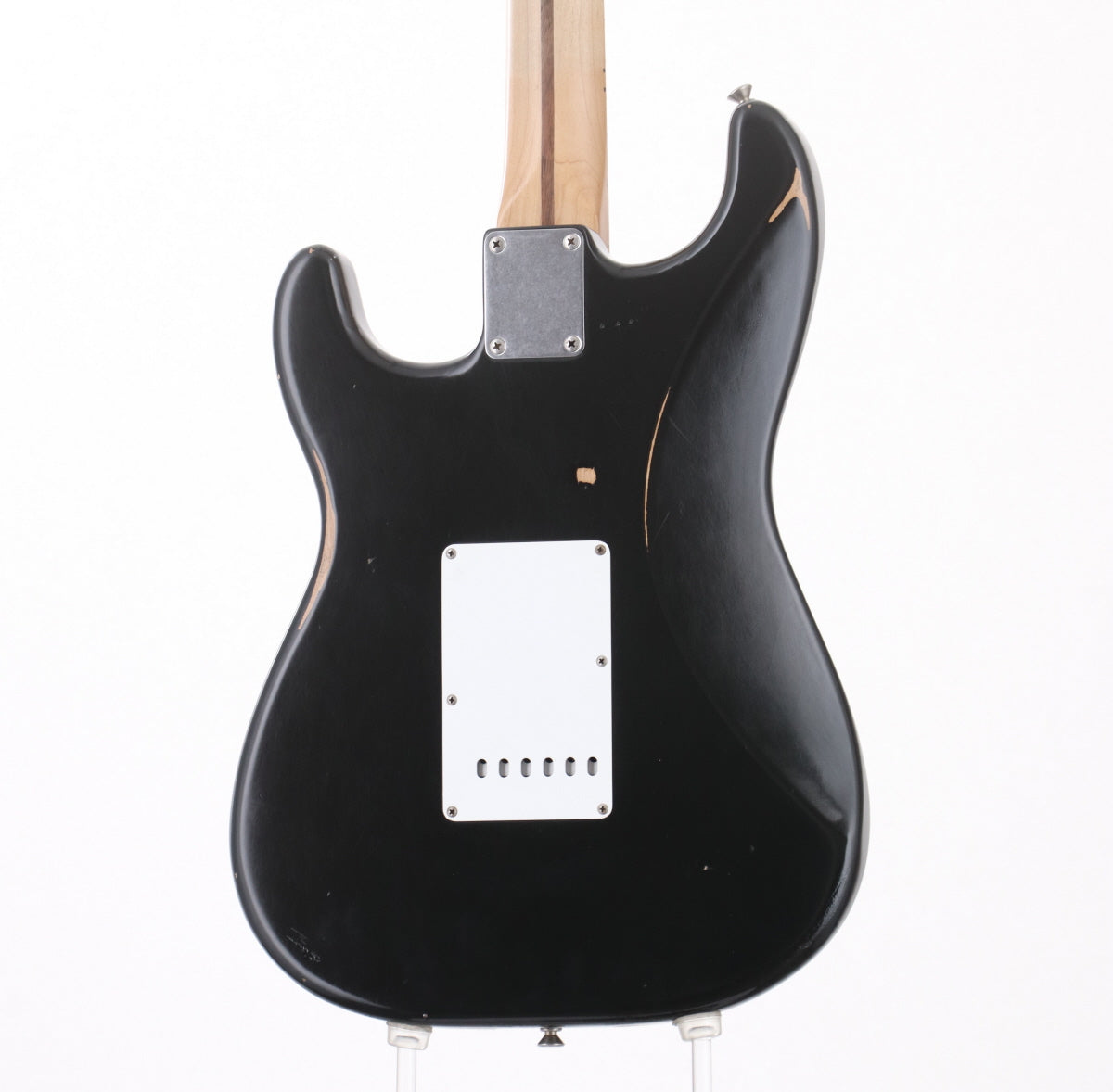 元来のロードウォーン・ダメージ加工に加えエンド部やボディ下部の塗装ダメージ、ブリッジ脇1弦側ピックガードのネジ部割れ修正痕、8点留めピックガード特有のたわみ等が見られます。