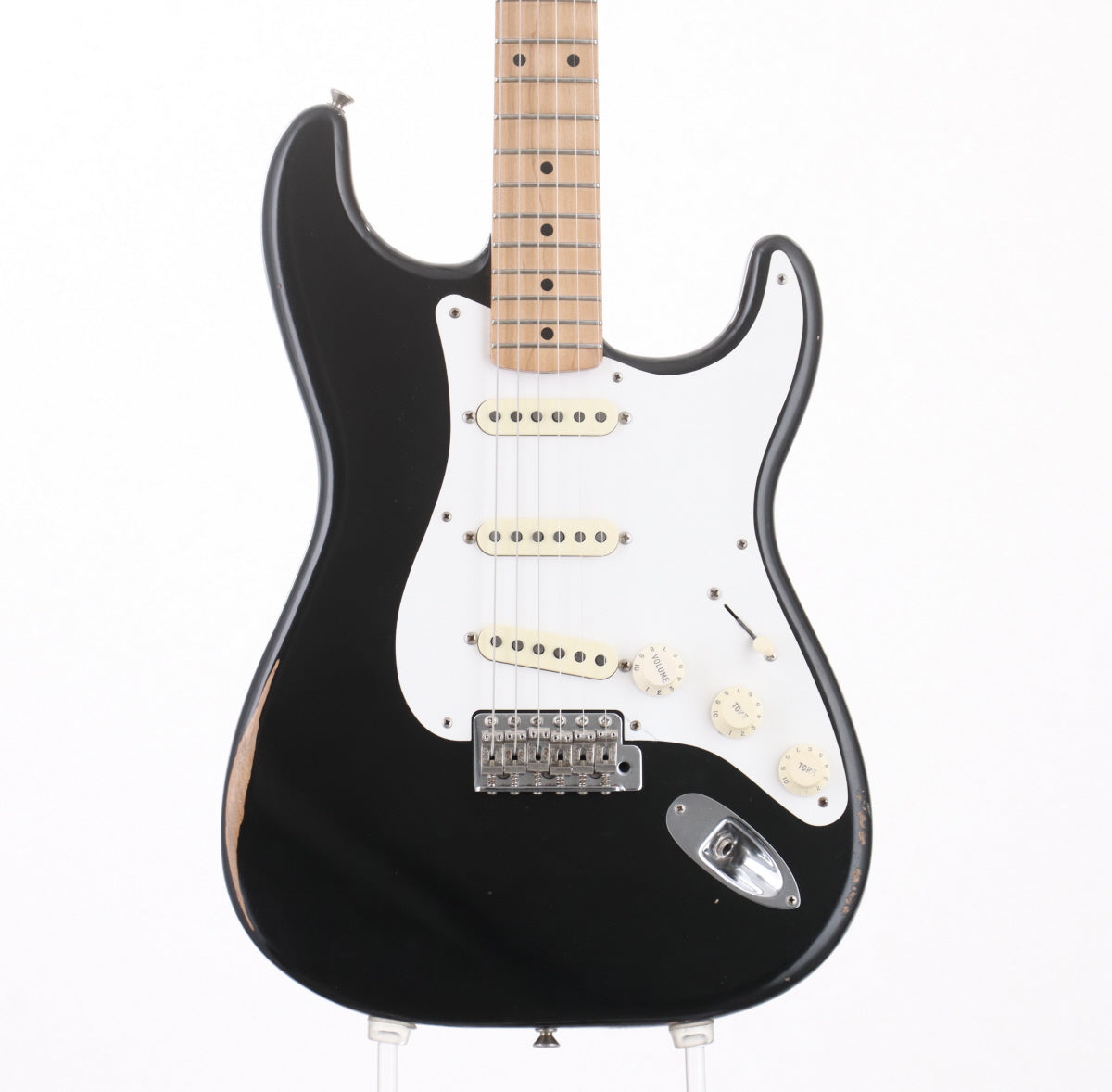 In addition to the original road-worn and damaged finish, there are some paint damage on the end and lower part of the body, a crack on the pickguard on the first string side by the bridge, and the deflection characteristic of the 8-point pickguard.