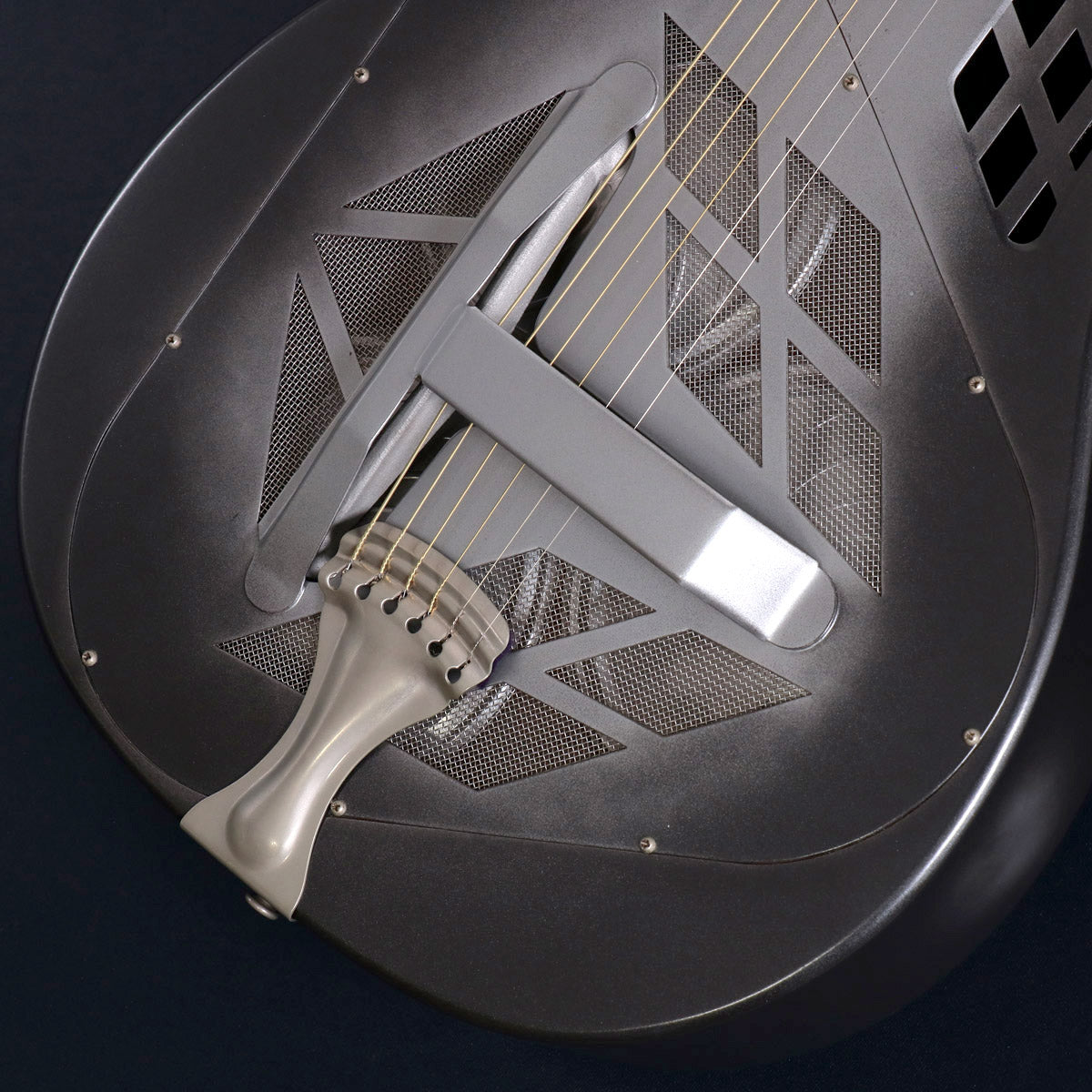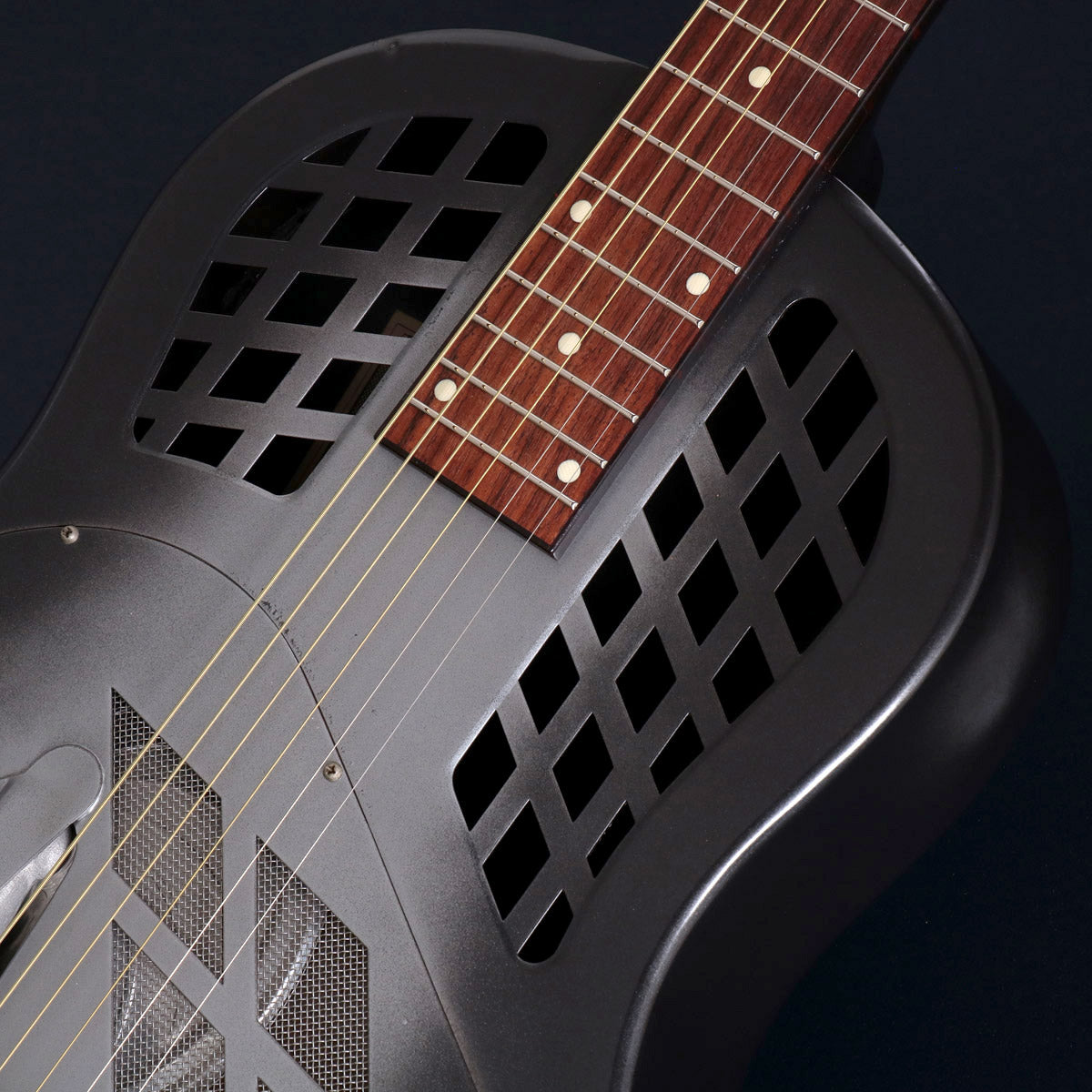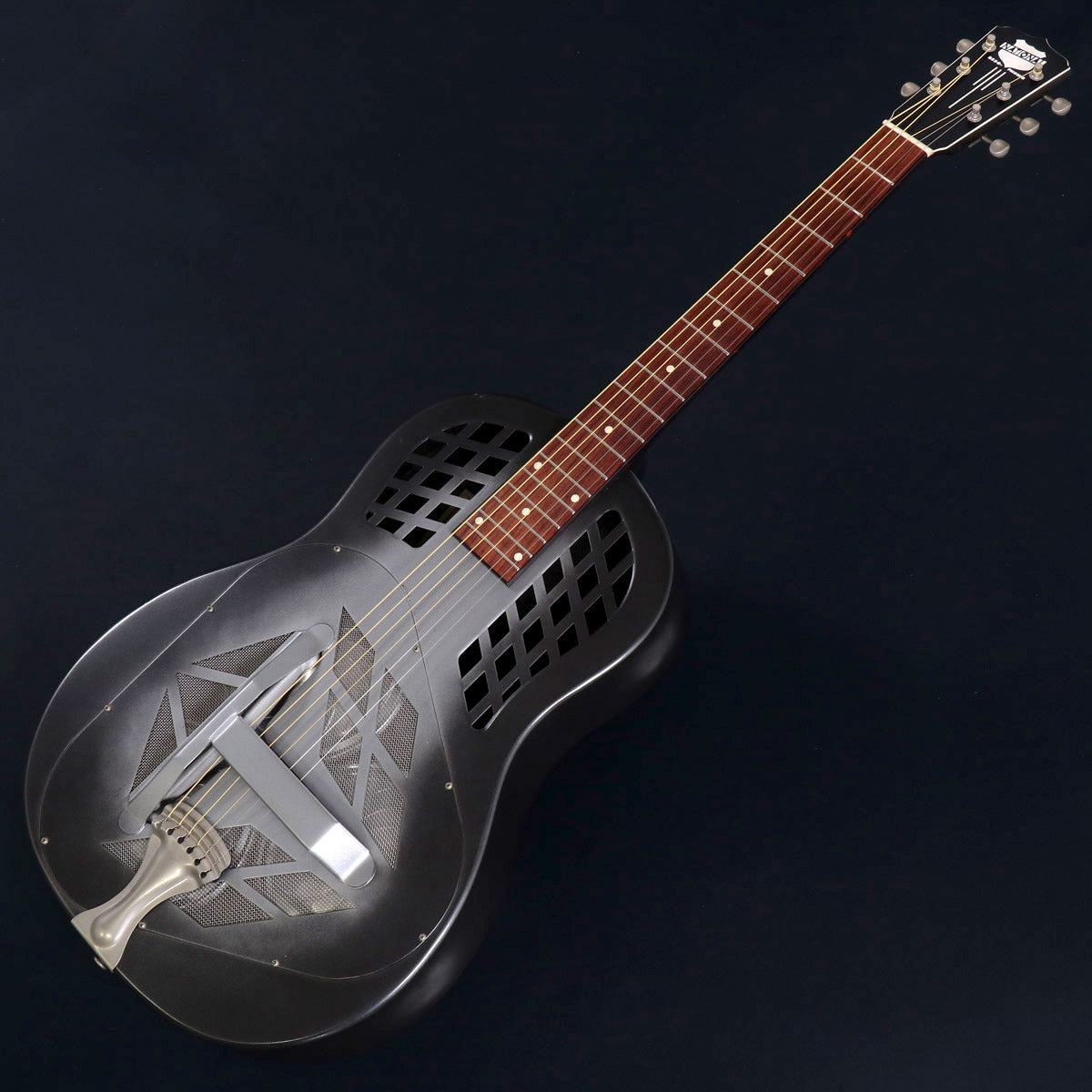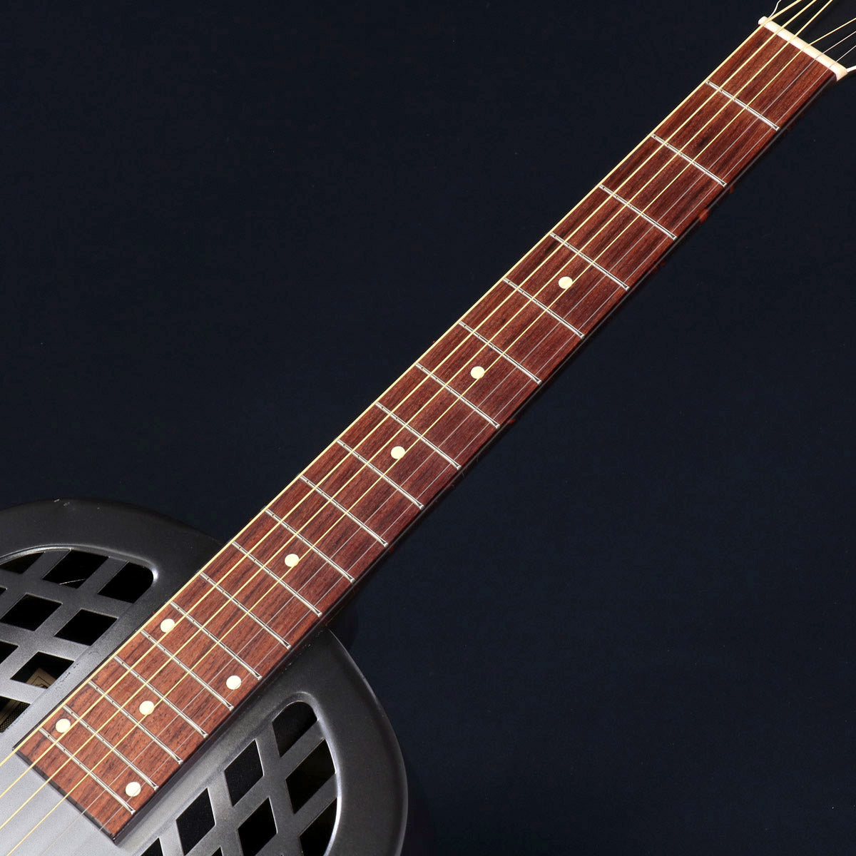 スチールボディ、6インチ・レゾネーター・コーンx3、ラウンドプロファイルのメイプル・ネック、べっ甲柄バインディングの施されたローズウッド指板、約4.41kgながらも迫力ある音量と独特のトーンが魅力、スライド奏法にピッタリのサウンドです。