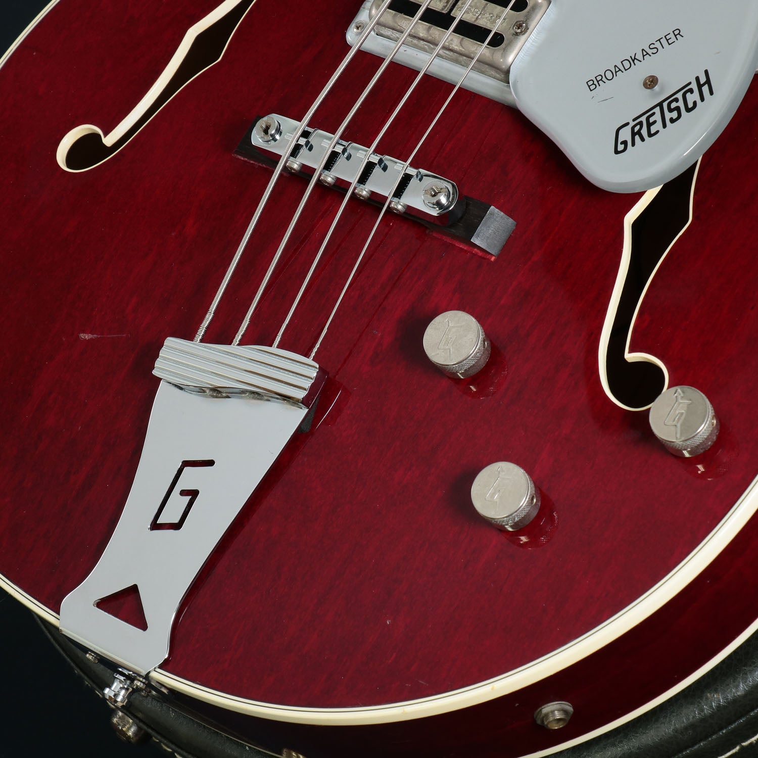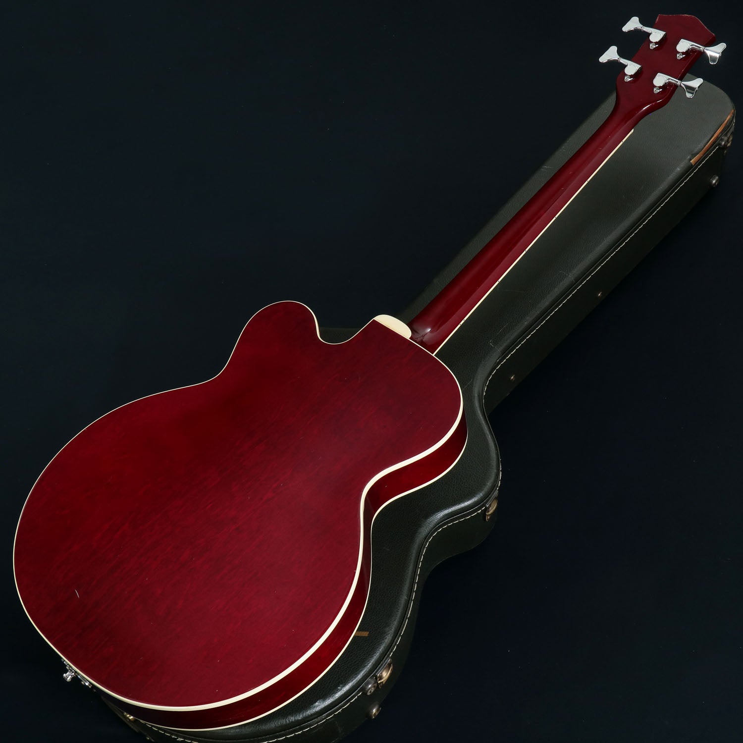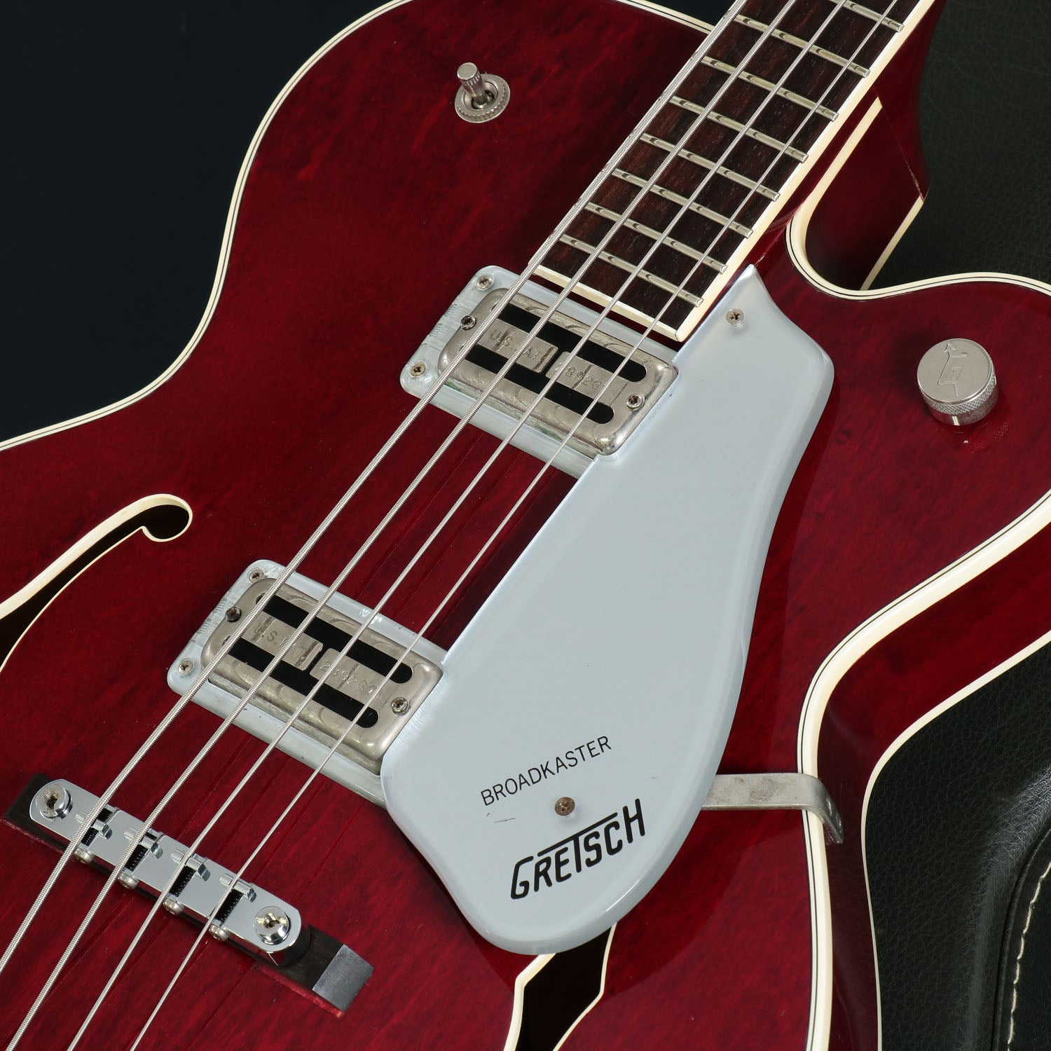 グレッチの6119b・Broadkaster・Bass。ショートスケールのメイプル・ネック/ローズ指板にメイプル・ホロウボディ、グレッチの代表的なフィルタートロン・ピックアップをベース用にアレンジしてマウントされ、「Gアロー」ノブはマスターVol/各PUのVOL/マスターTone/3Wayセレクター、アジャスト・マチック・ブリッジ&Gテールピース仕様になっています。